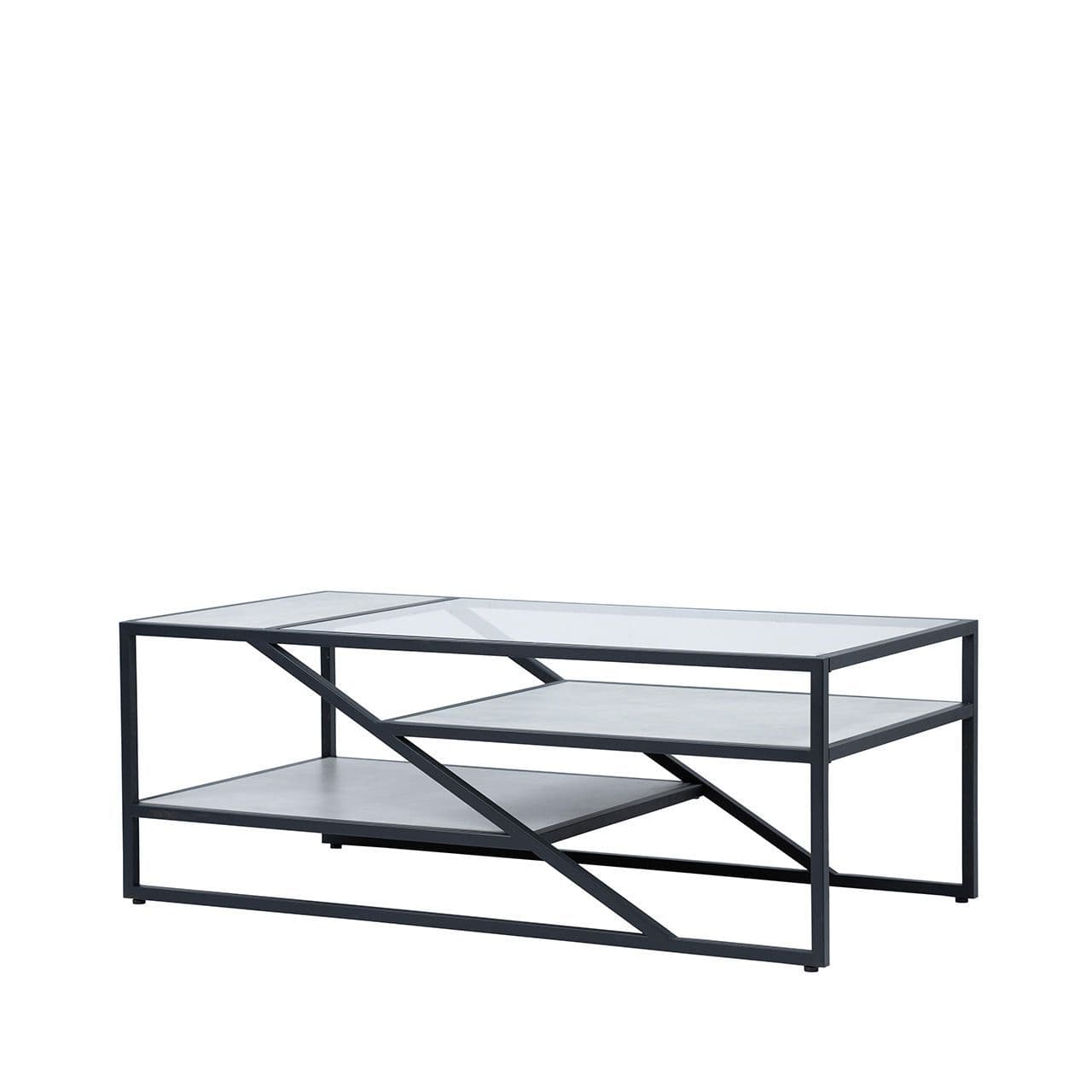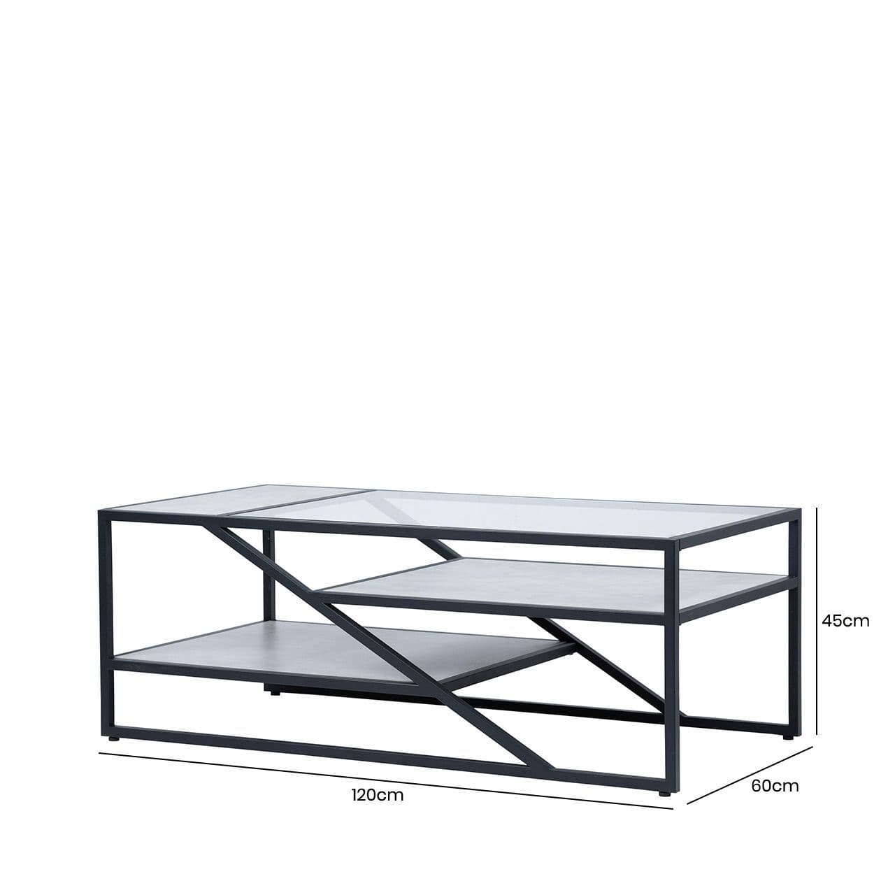 If you are seeking a sleek & minimalist aesthetic then this Ibarra coffee table will define the setting. Constructed with a black metal frame, clear glass tabletop and a two tiered grey wooden, faux concrete finished shelves, this unique piece also acts as the perfect lamp, occasional, bedside, display table