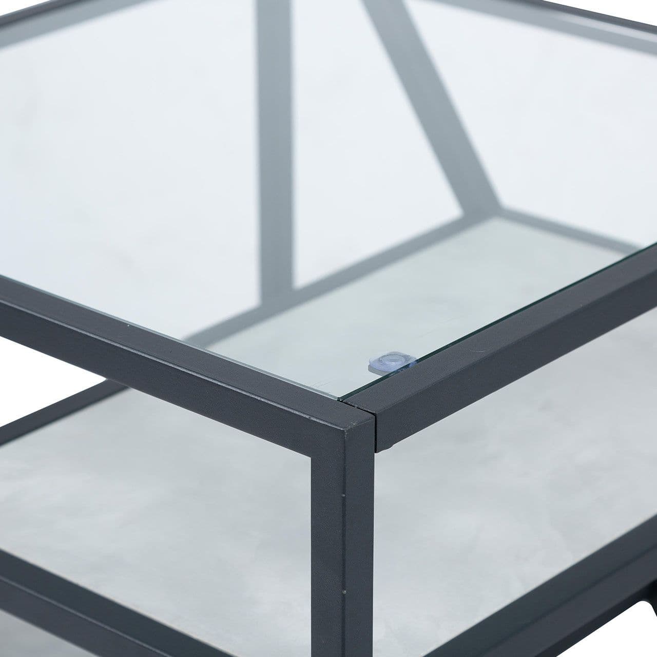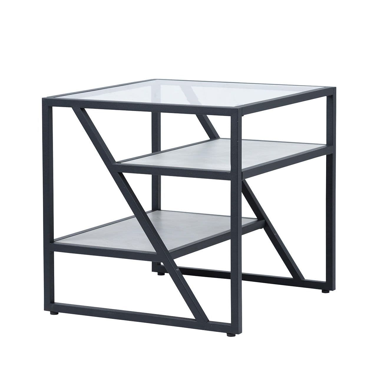 If you are seeking a sleek & minimalist aesthetic then this Ibarra end table will define the setting. Constructed with a black metal frame, clear glass tabletop and a two tiered grey wooden, faux concrete finished shelves, this unique piece also acts as the perfect lamp, occasional, bedside, display table