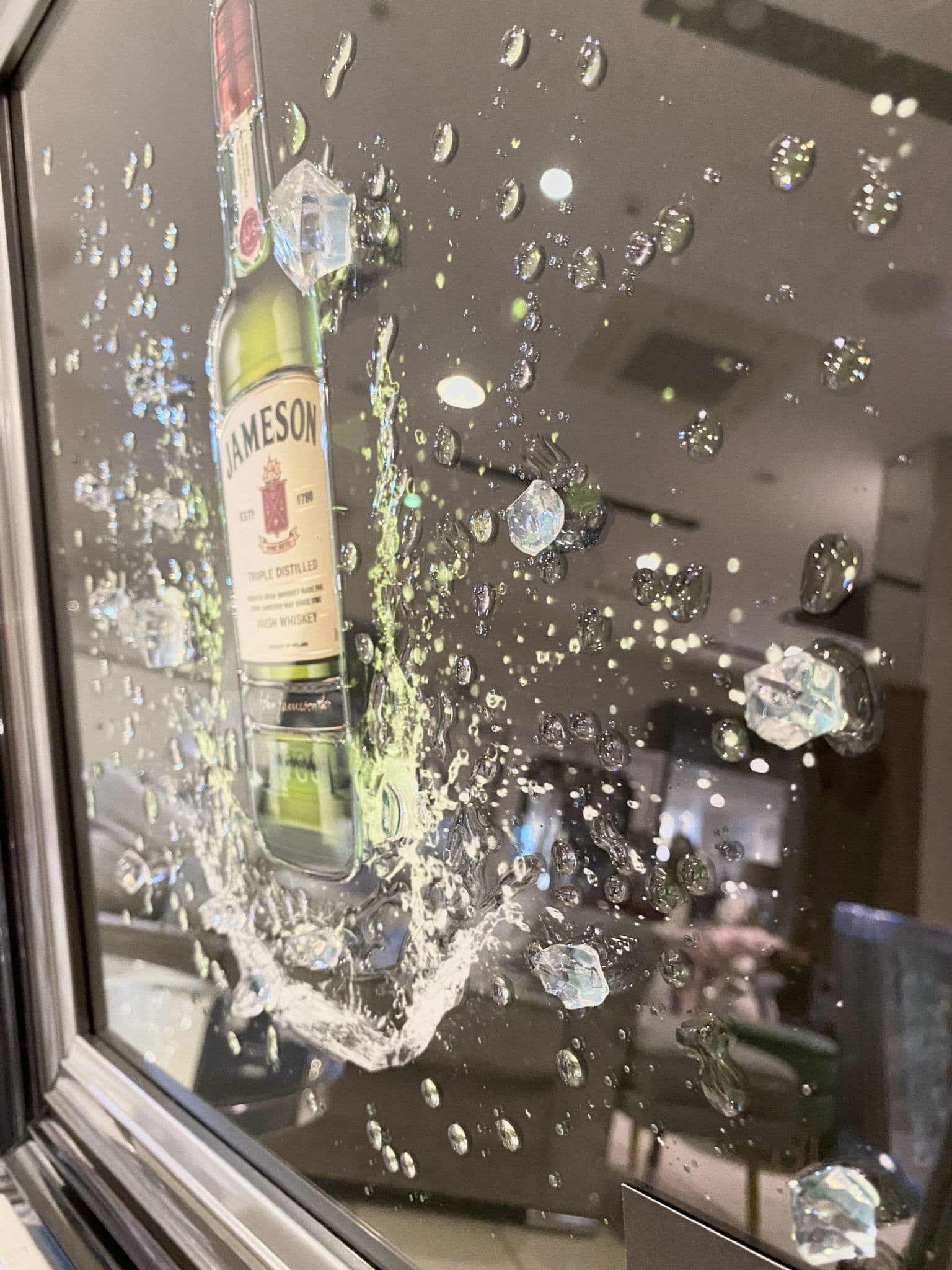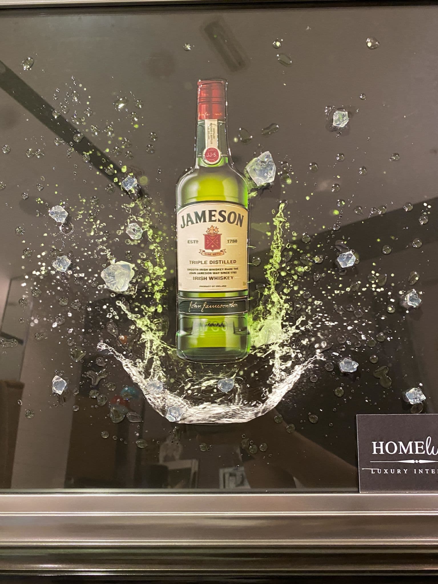 This picture features a 'Jameson Whisky Splash' that exhibits a rich design with glitter details around the picture, creating a smart look for your home. Finished with a black step frame.