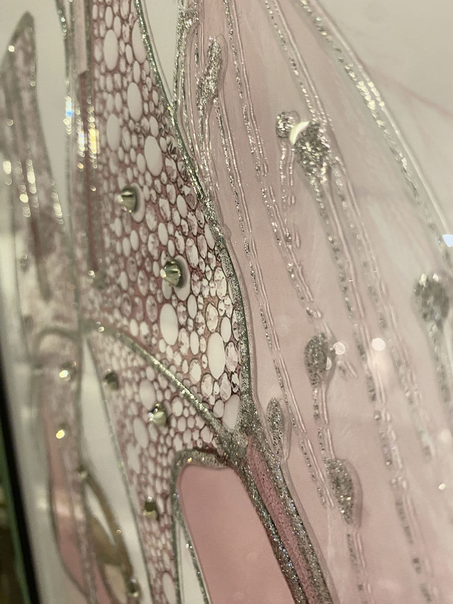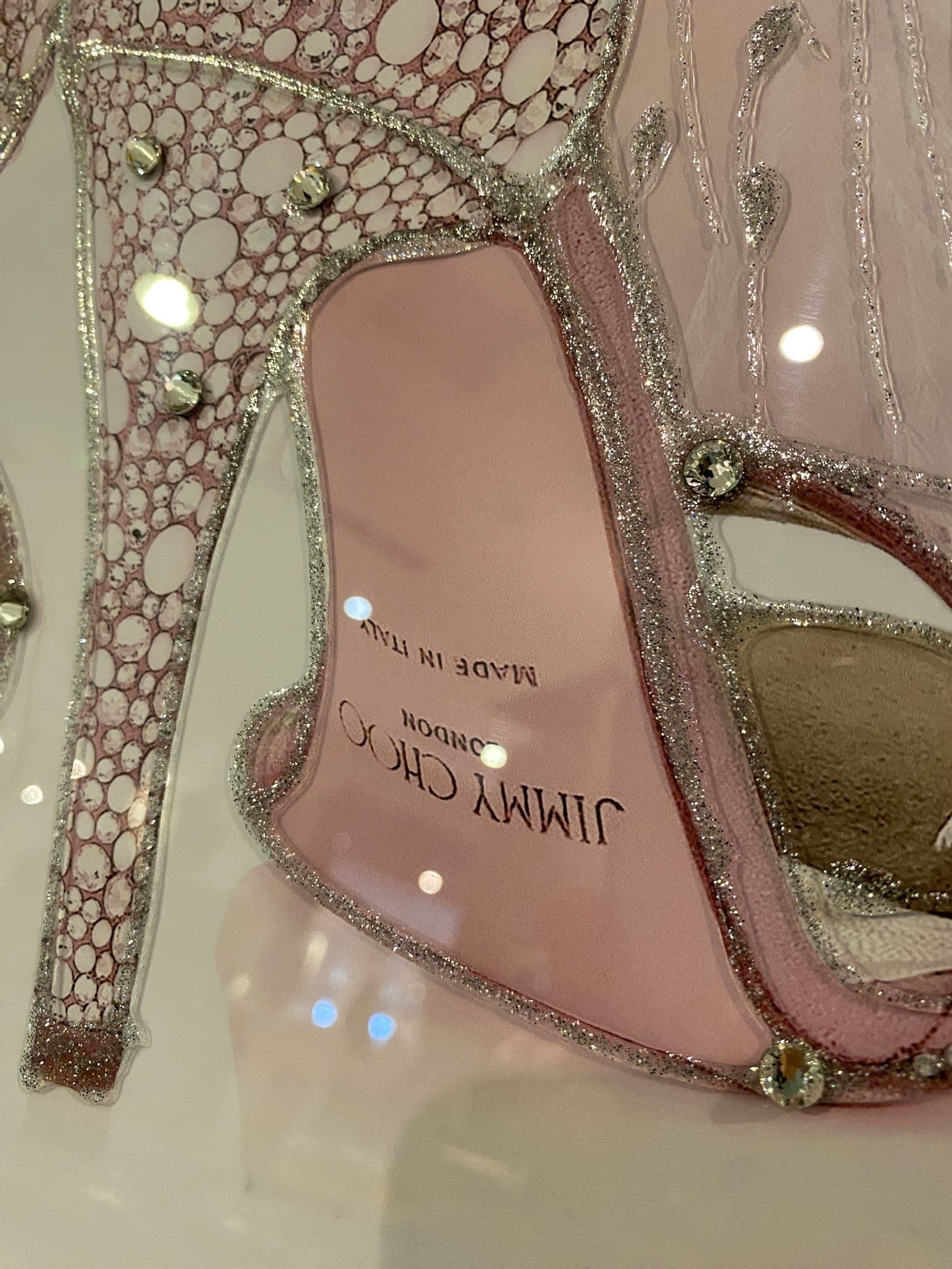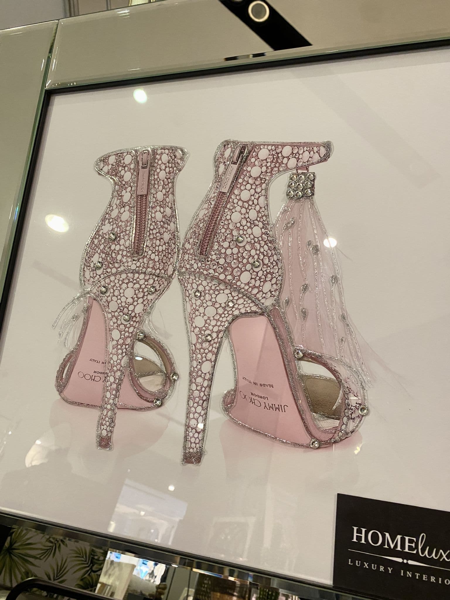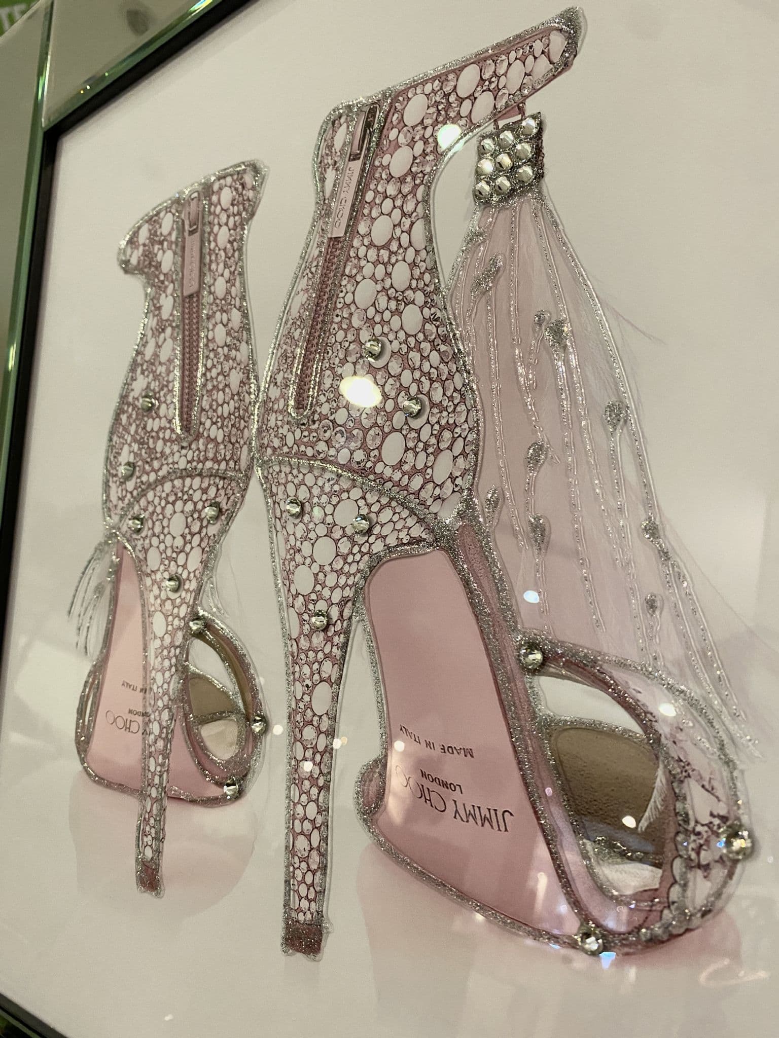 This picture features 'Jimmy Choo Pink Shoes Back', exhibiting a rich design with liquid details around the picture, creating a smart look for your home. Finished with a clear mirror frame.
