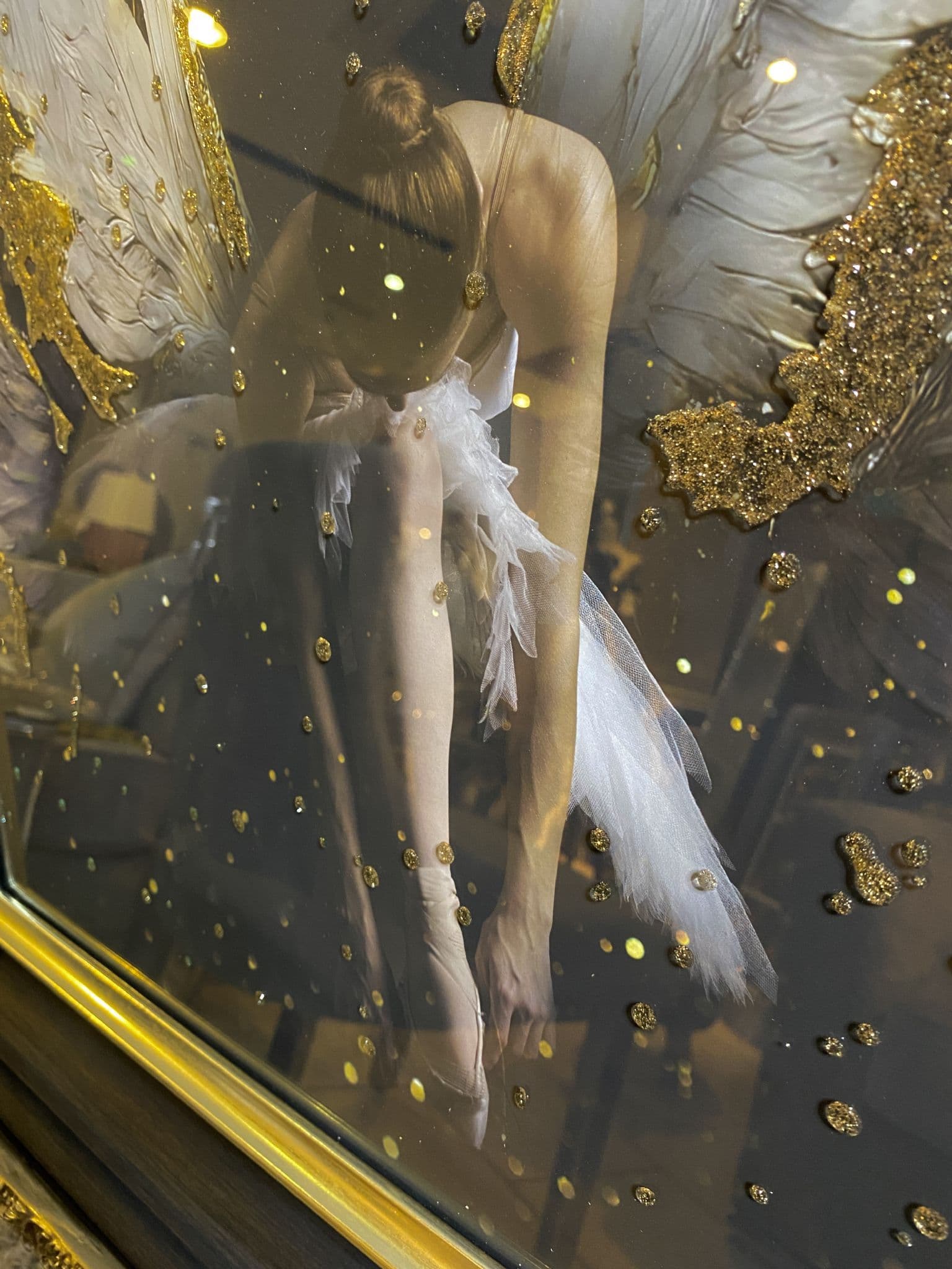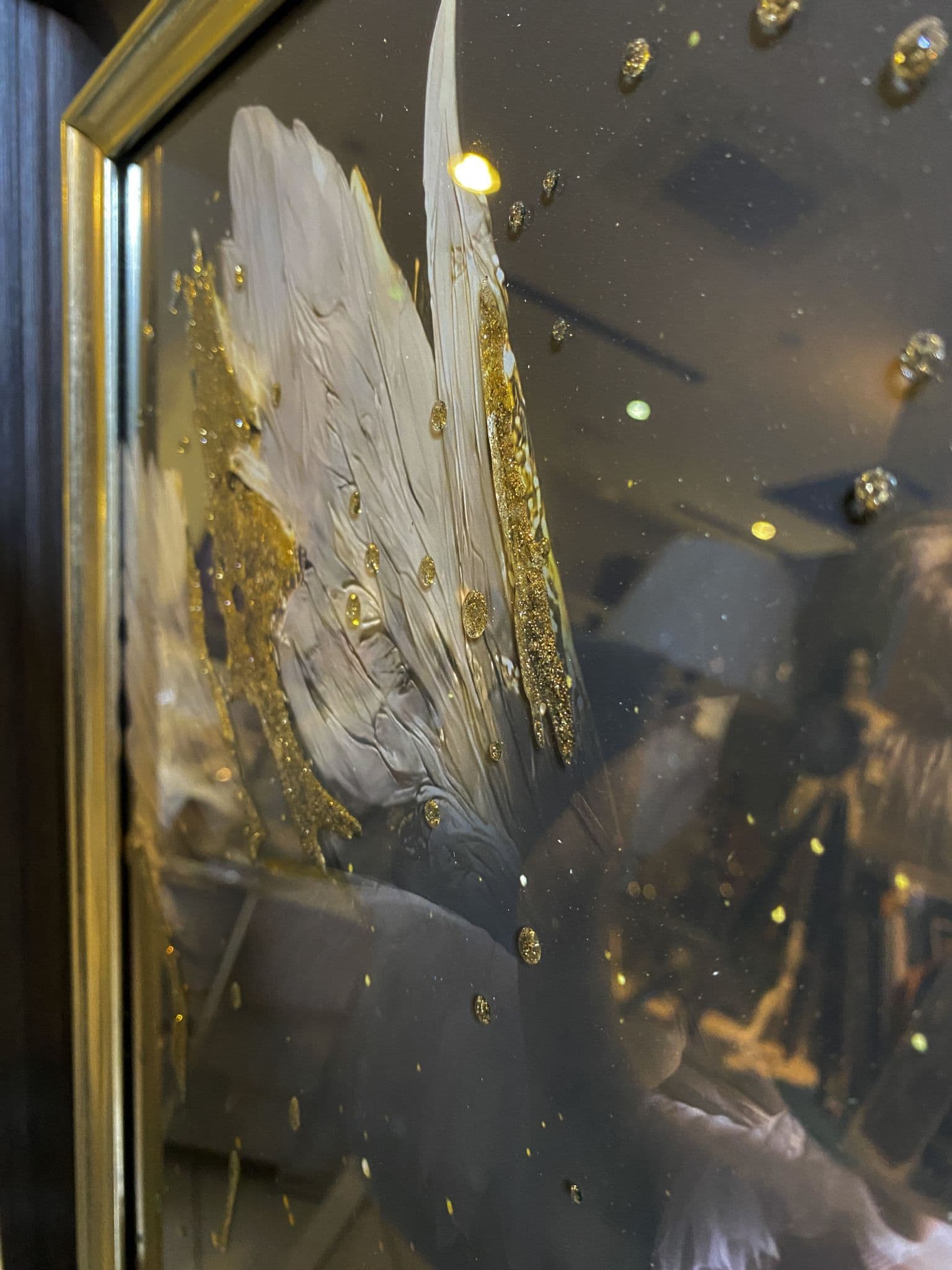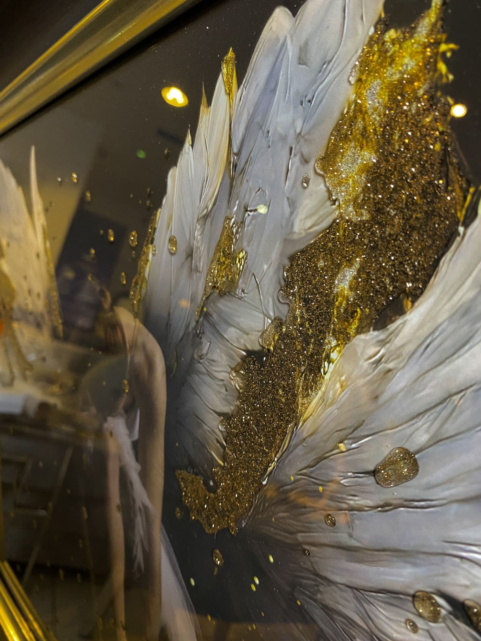 This picture features 'Kneeling Angel Wings Golden', exhibiting a rich design with liquid details around the picture, creating a smart look for your home. Finished with a chic black frame.