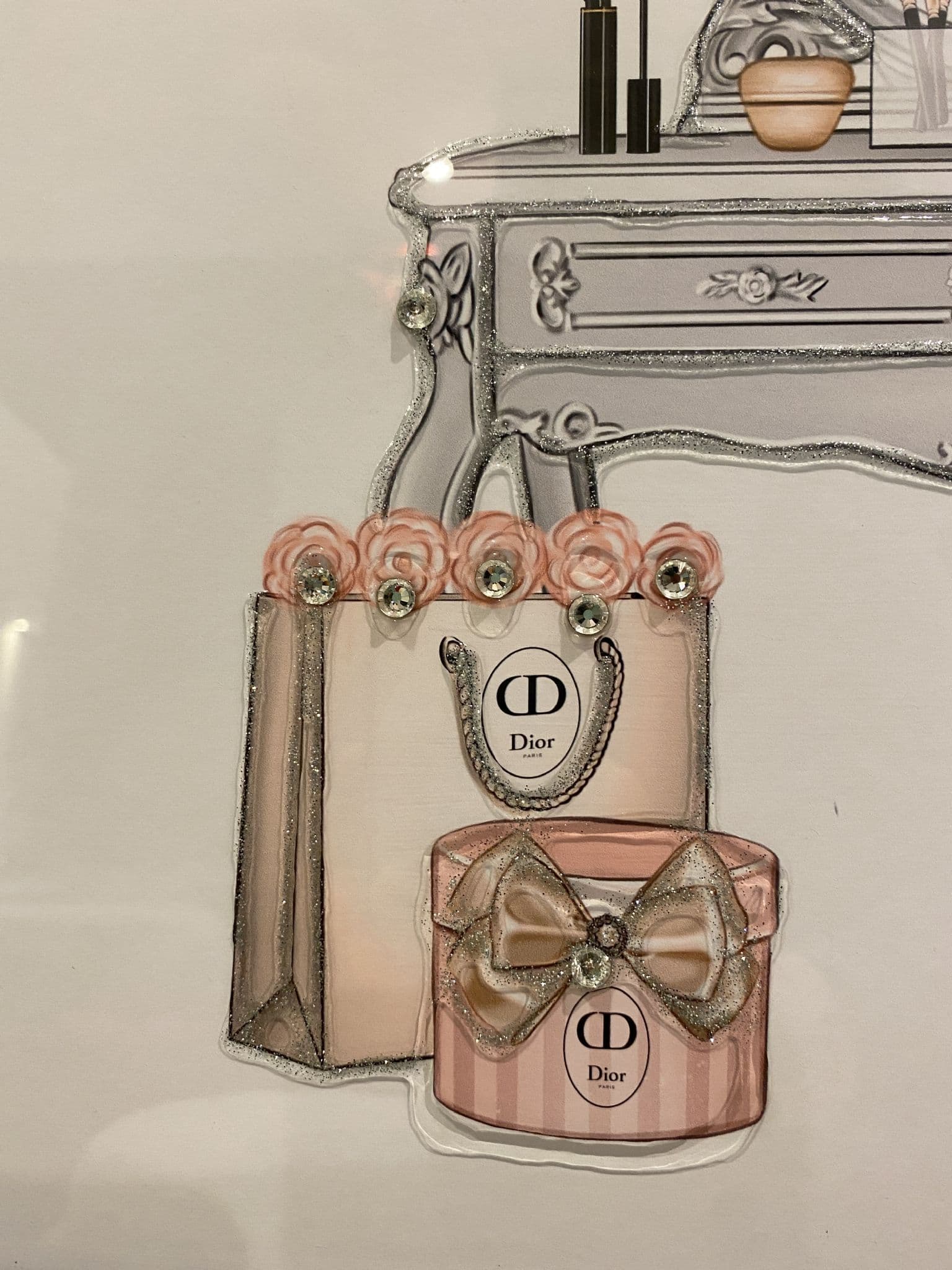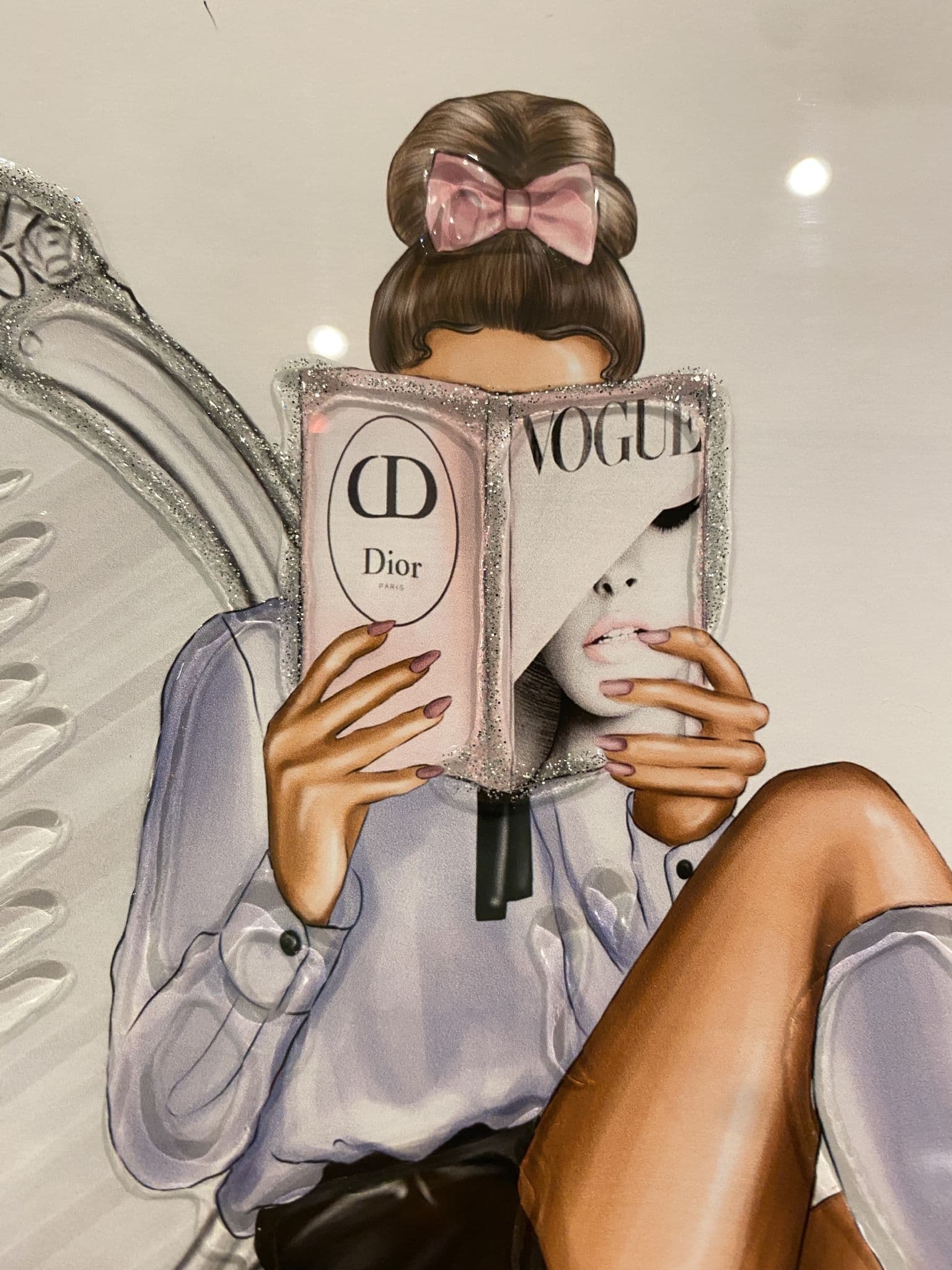 This picture is with a 'Lady Sitting On Dresser' which exhibits a classy vibe with glitter details around the picture creating a smart look for your home. Finished with a mirror frame.