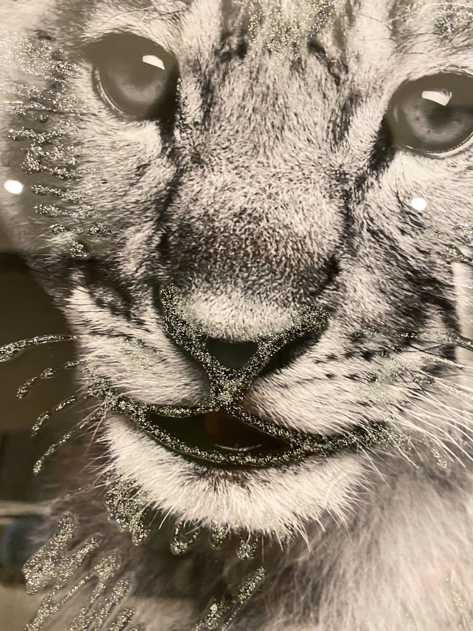 This picture is with a chic ' White Lion Cub' that exhibits a classy design with glitter details around the picture creating a smart look for your home. Finished with a mirror frame.