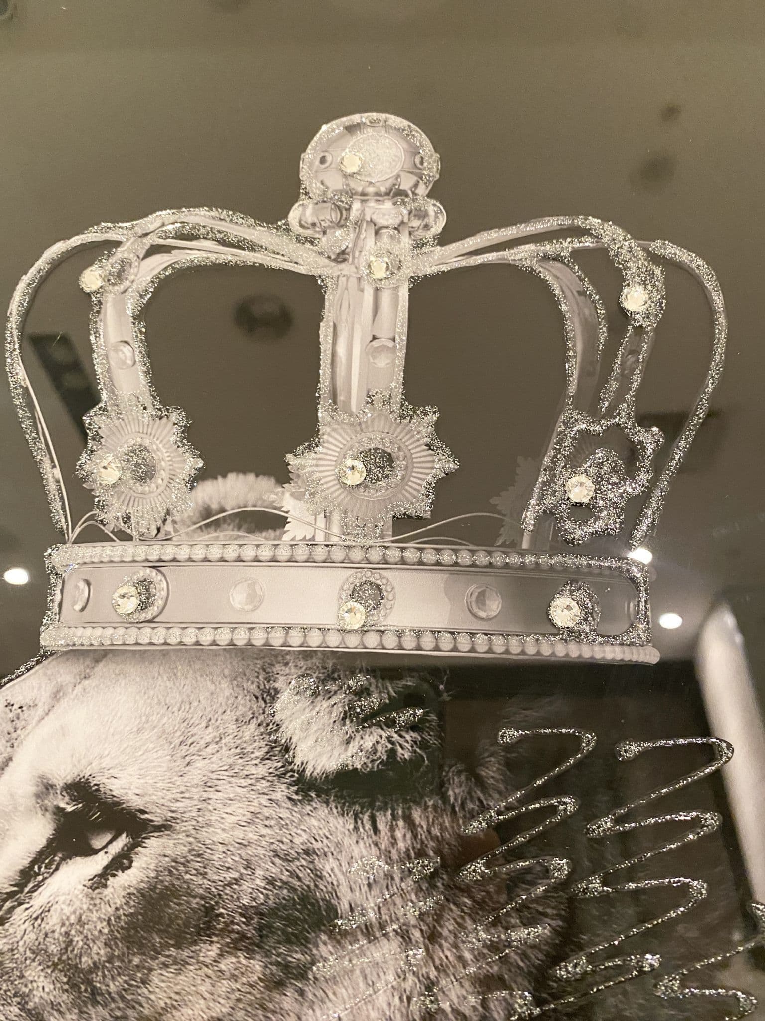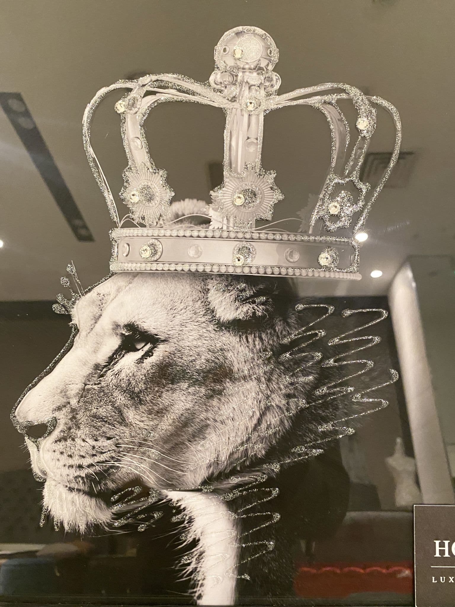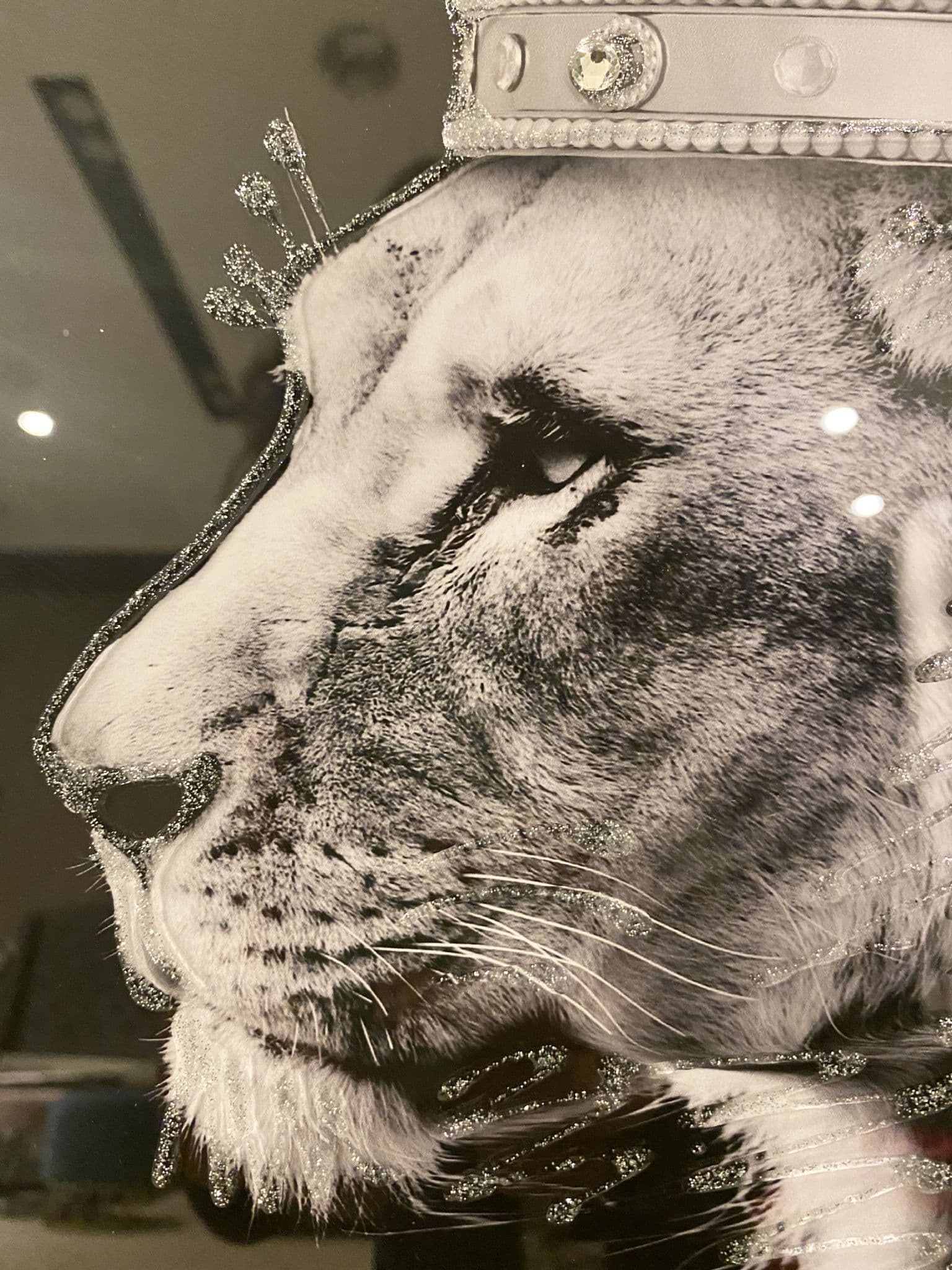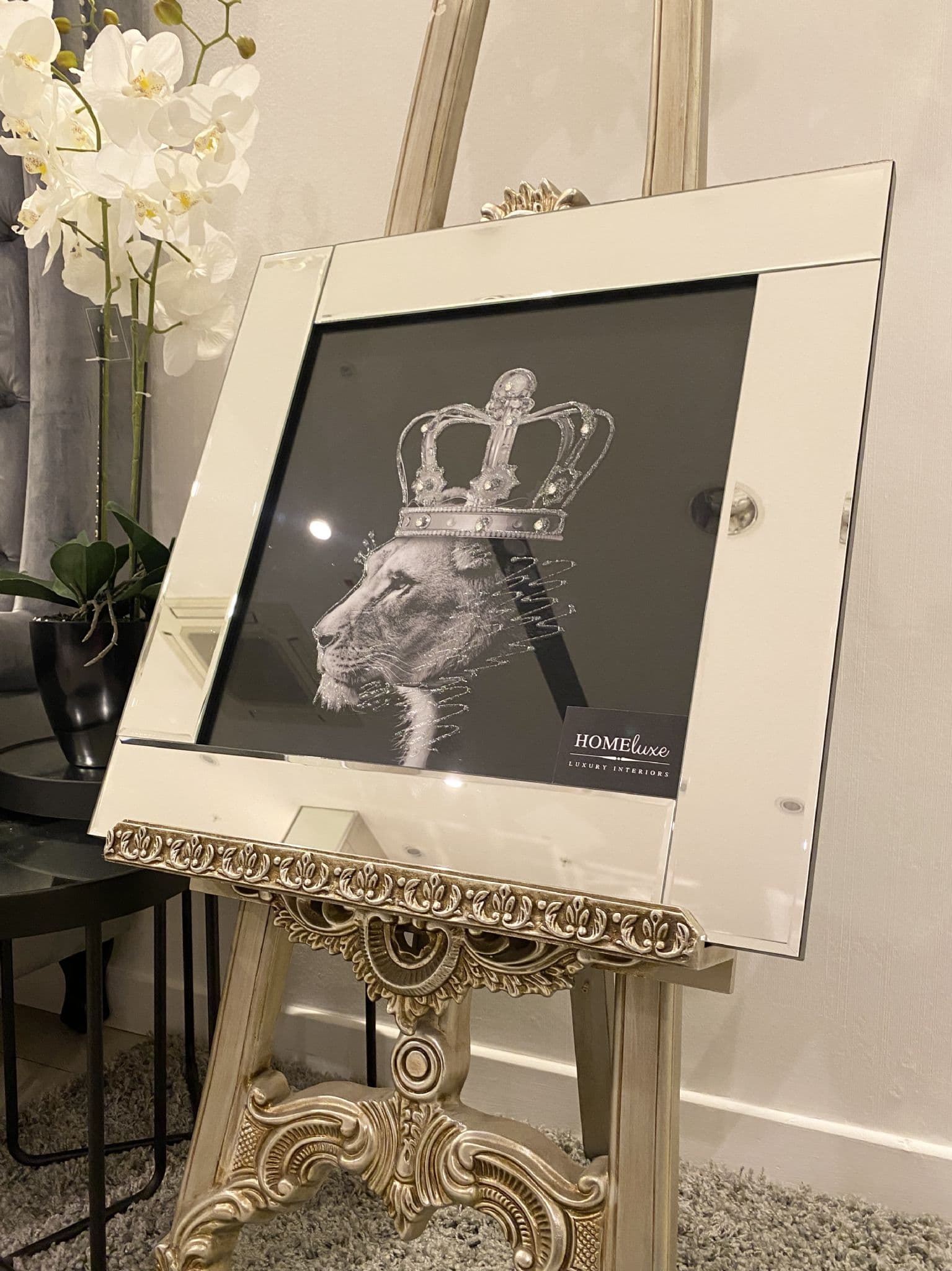 This picture is with a chic 'Silver Lioness Crown' that exhibits a classy design with glitter details around the picture creating a smart look for your home. Finished with a mirror frame.
