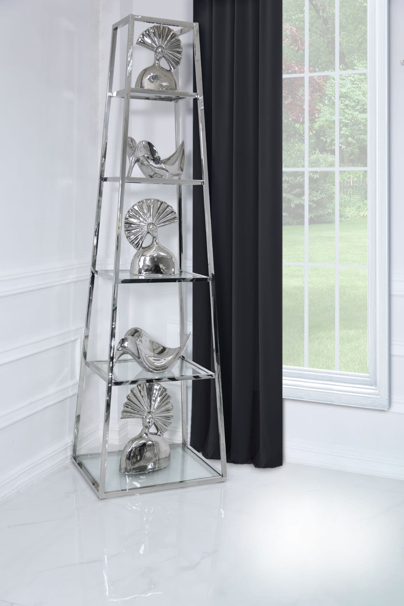 Display all your decorative pieces in style with this grand Logan stainless steel display unit. Comprising of a ladder construction styled frame with tiered glass shelves in order to exhibit larger to smaller sized items. Complete your artistic vision with this unit