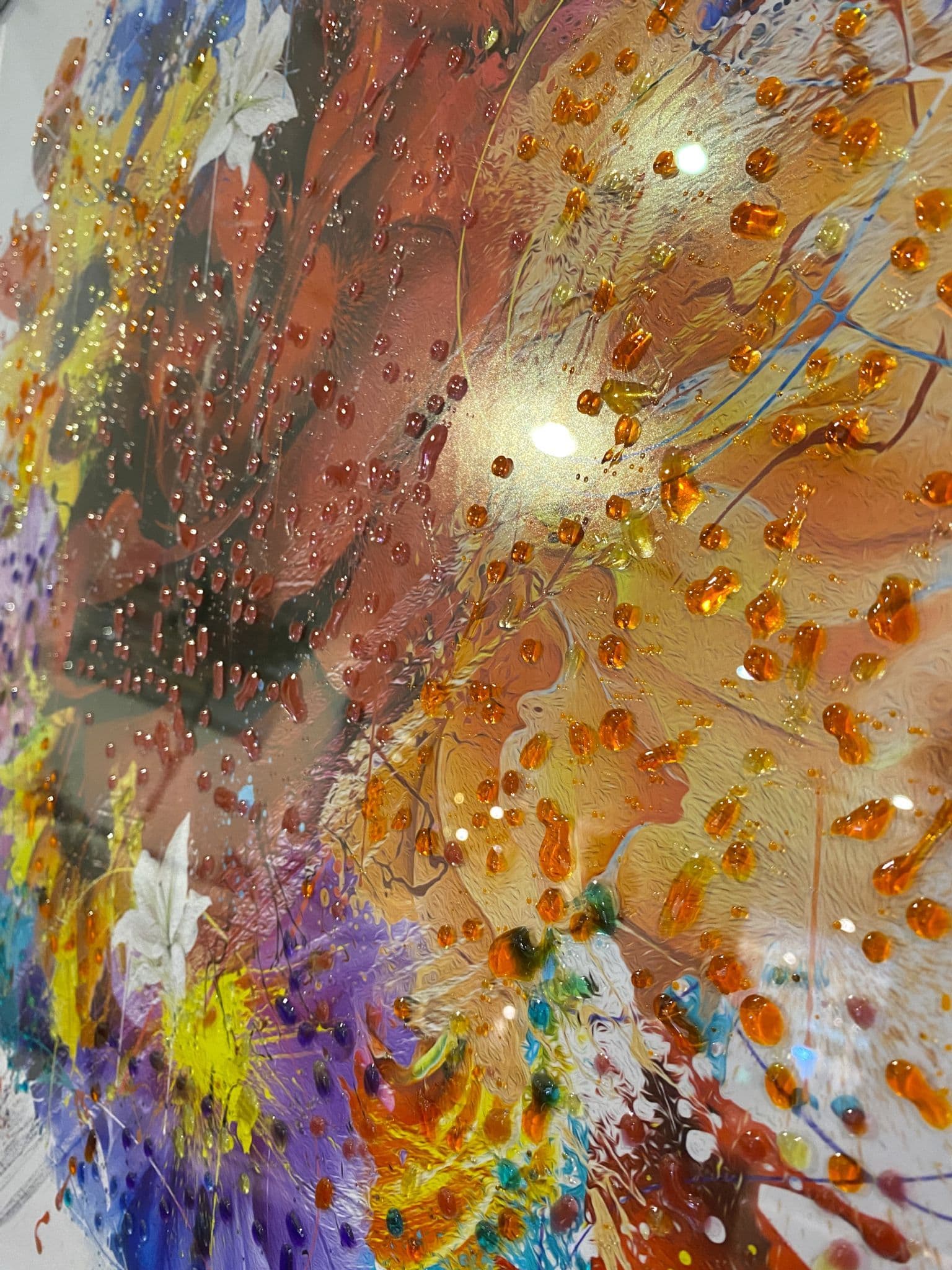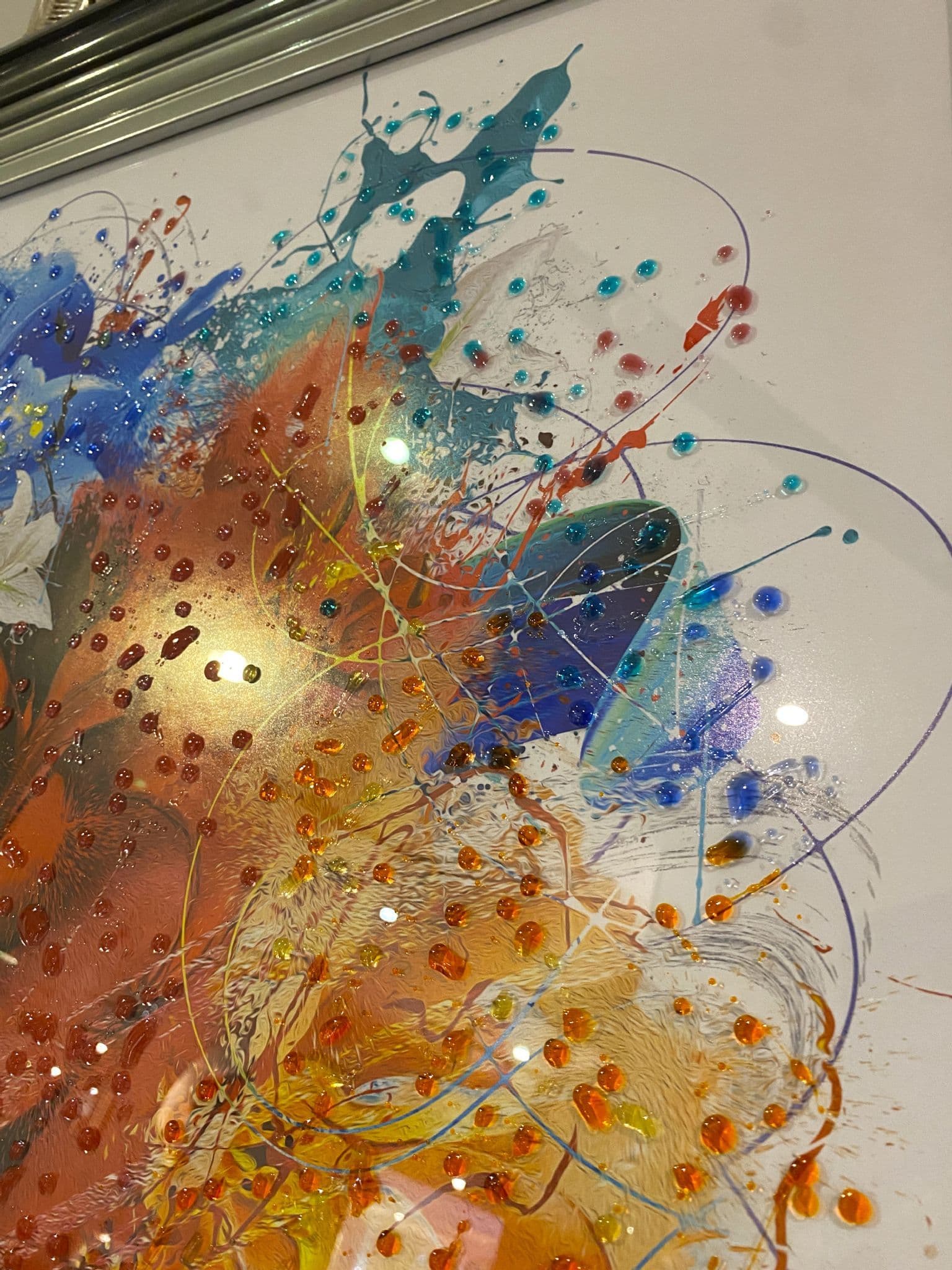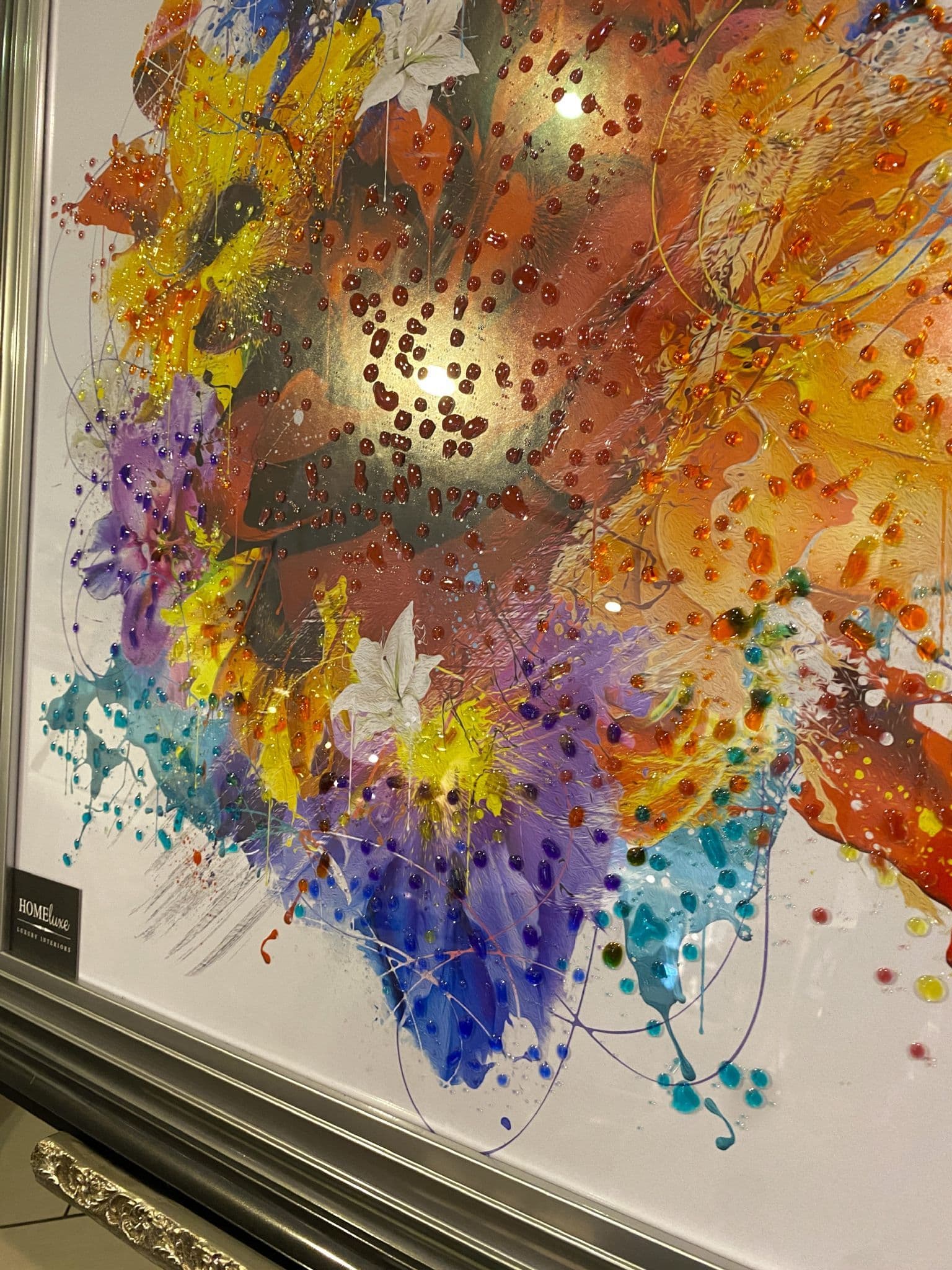 This picture features 'Lotus Flower Multicolour', exhibiting a rich design with liquid details around the picture, creating a smart look for your home. Finished with a black step frame.