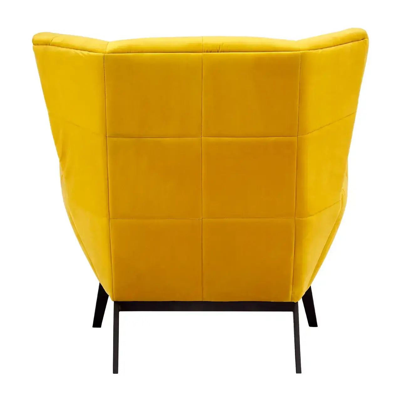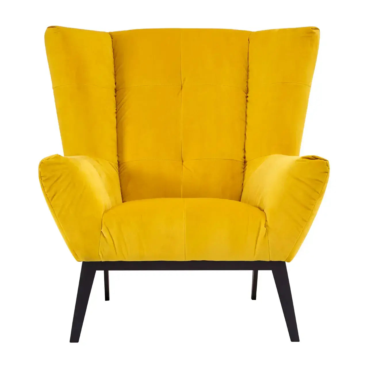 Add a touch of luxe and vintage charm to your home with the Maiko Yellow Fabric Armchair. Dressed in plush yellow velvet, this armchair combines a bold retro design with modern elegance. Its stitched backrest, tapered black metal legs, and wide armrests elevate both style and comfort. Perfect for creating a confident and cozy atmosphere, this armchair will be the centerpiece of any room.