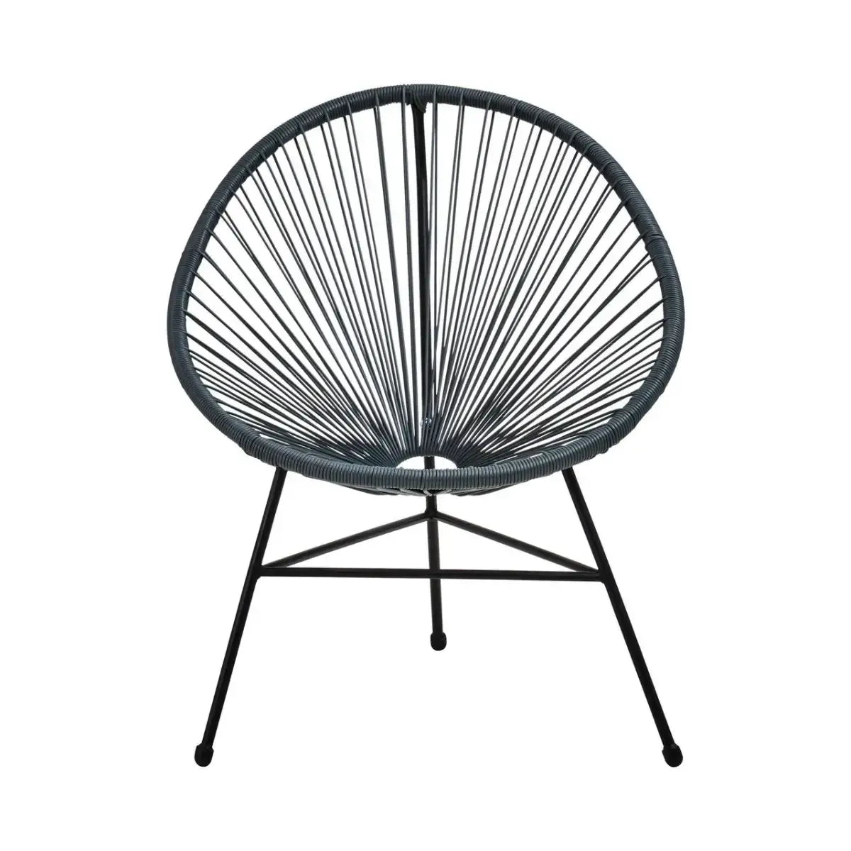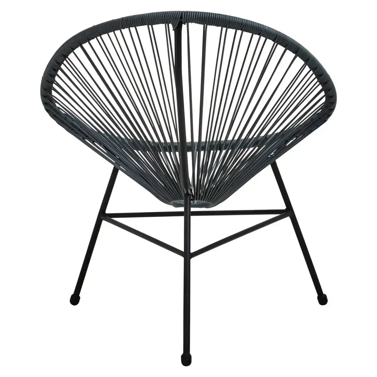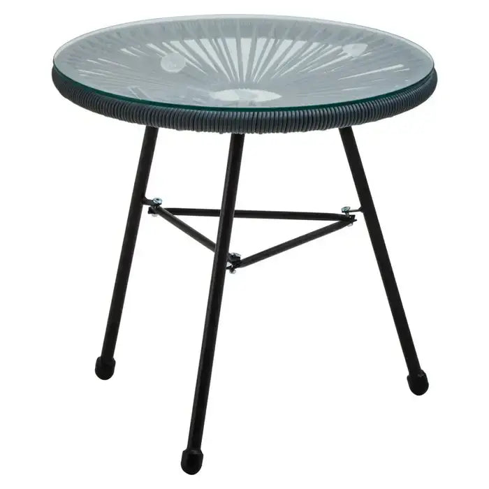 This patio furniture is a modern take on a traditional design. Its black steel base and rattan rope design offers limitless relaxation. This set, includes a grey gradient style and features a complementary tempered glass table, a modern touch to any outdoor settings.