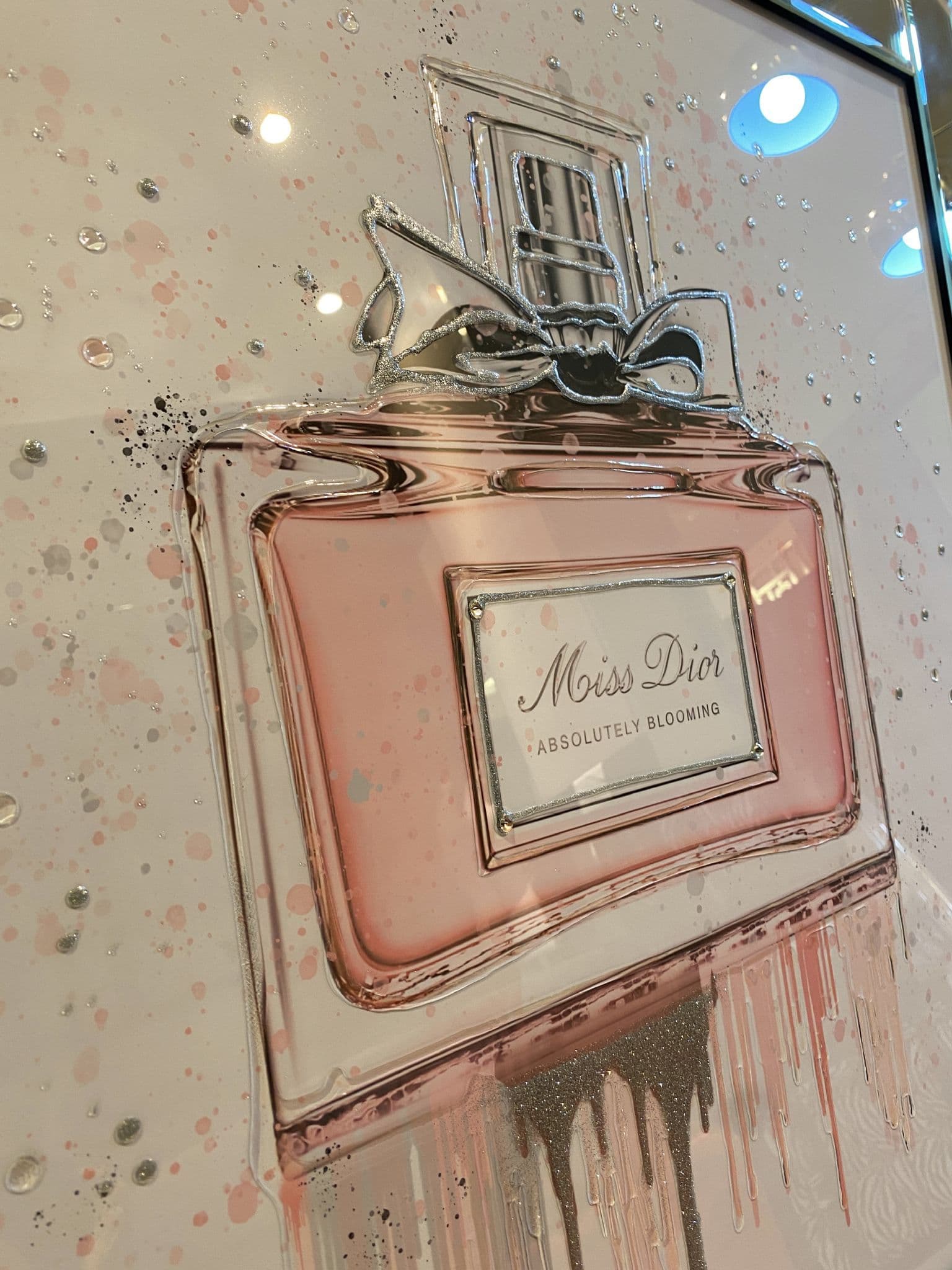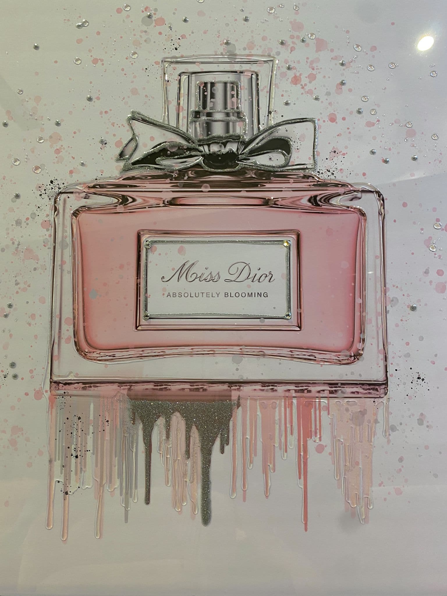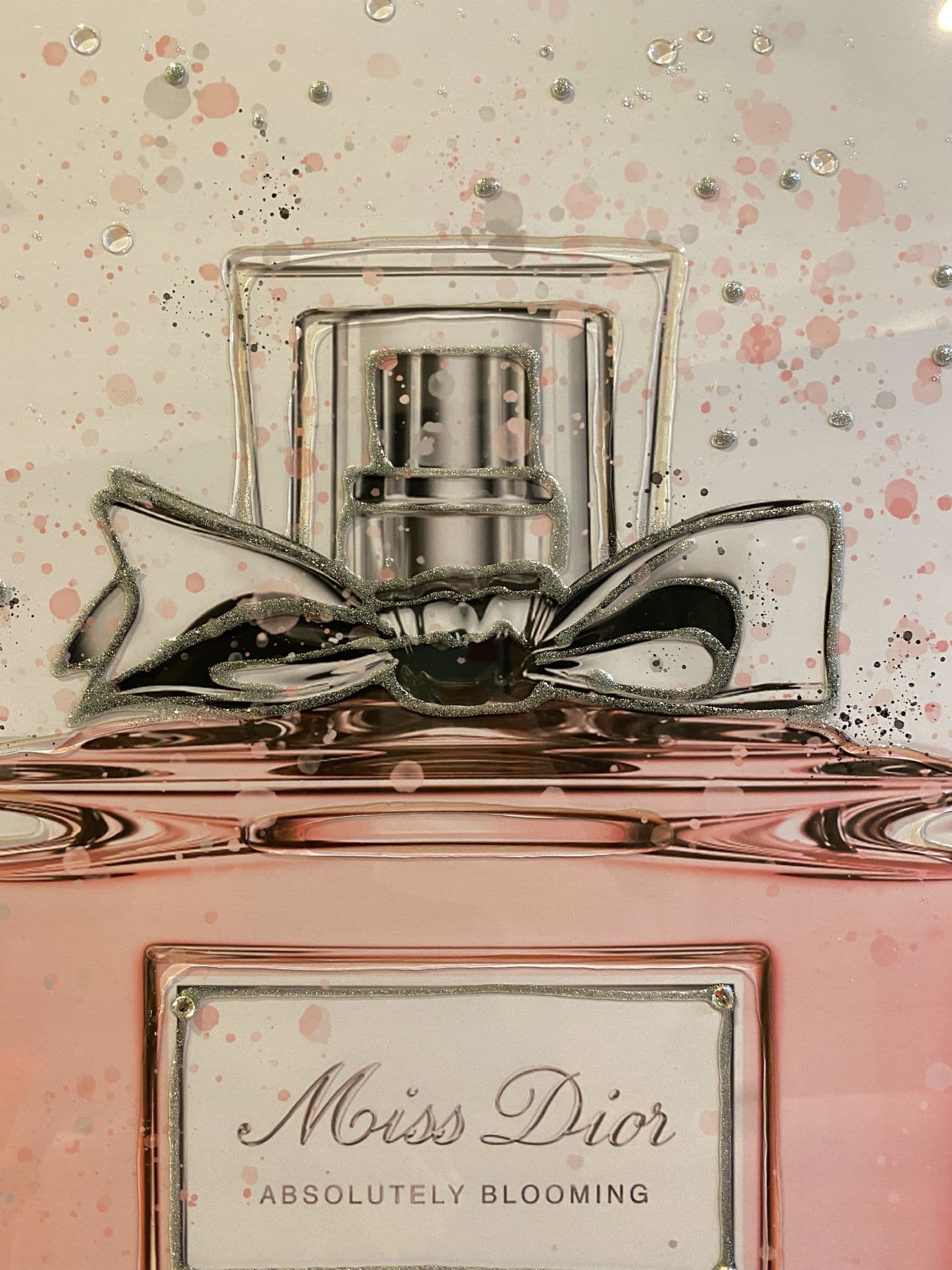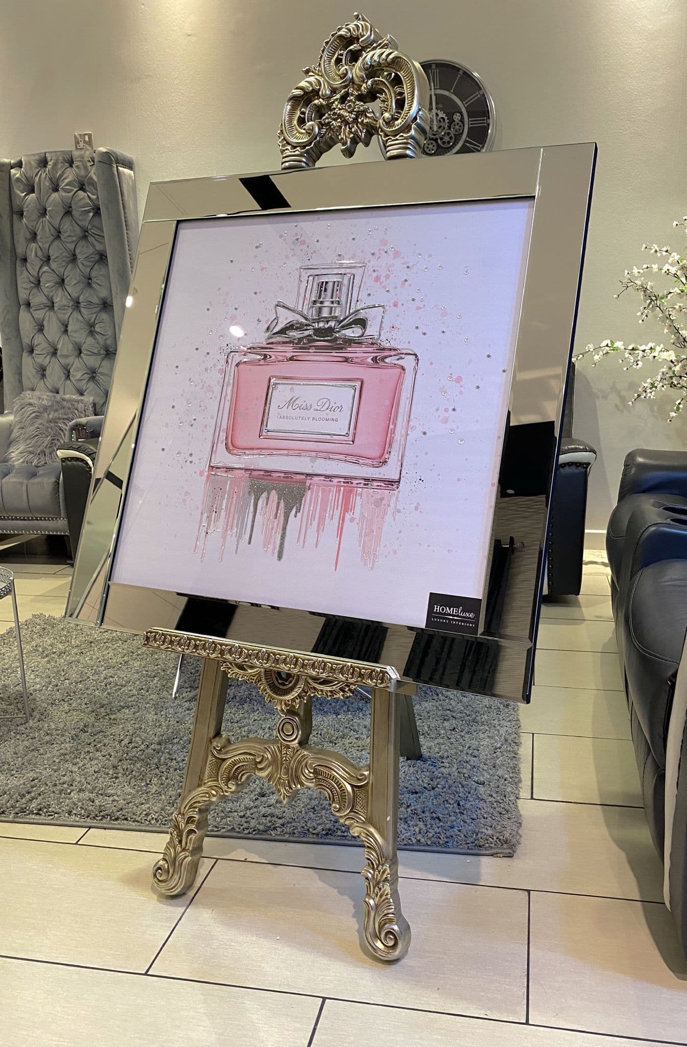 This picture is with a chic 'Miss Dior Bow Perfume Bottle' that exhibits a classy design with glitter details around the picture creating a smart look for your home. Finished with a mirror frame.