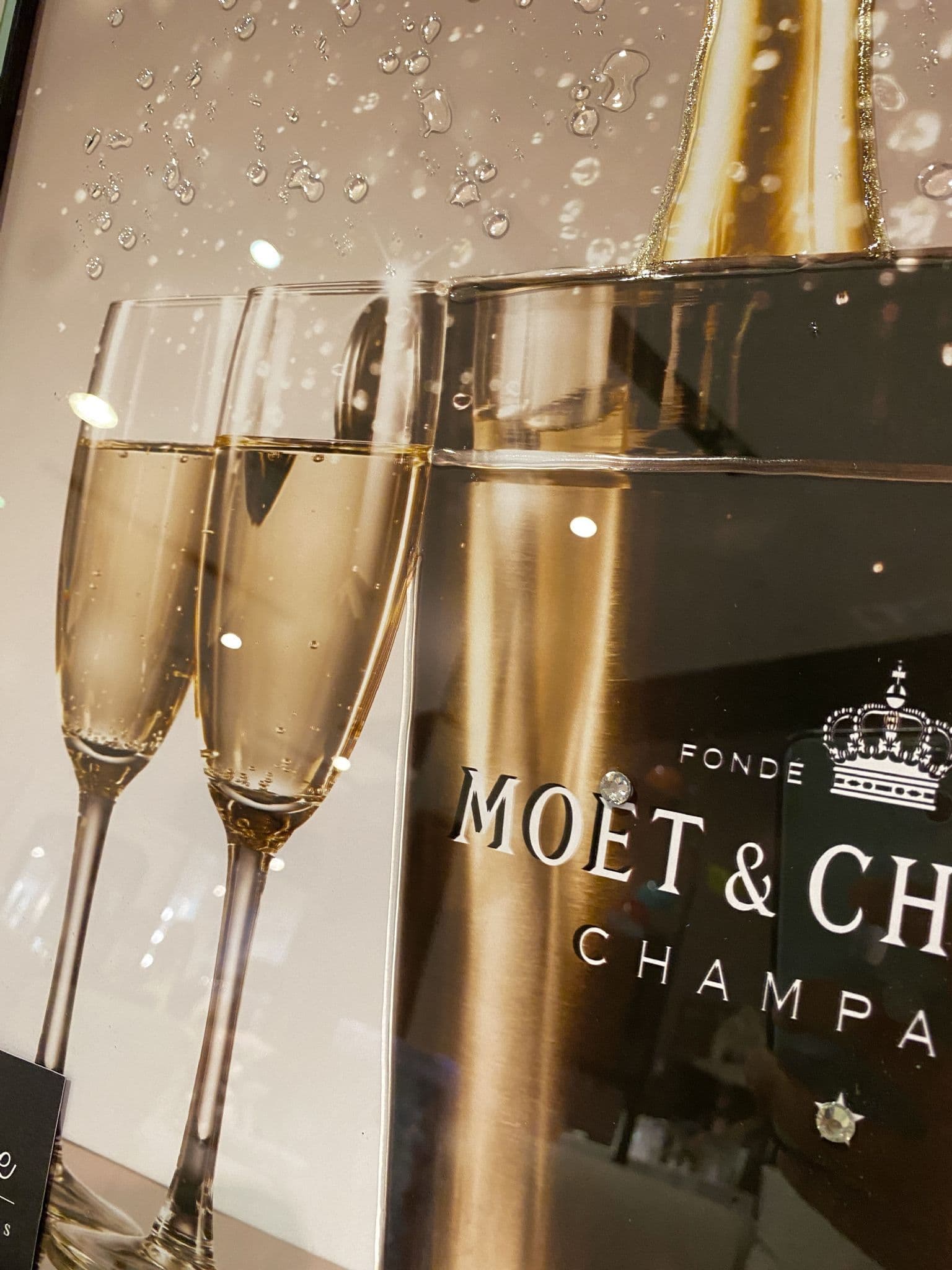 This picture features a 'Moet Champagne Sparkle' that exhibits a rich design with glitter details around the picture, creating a smart look for your home. Finished with a mirror frame.