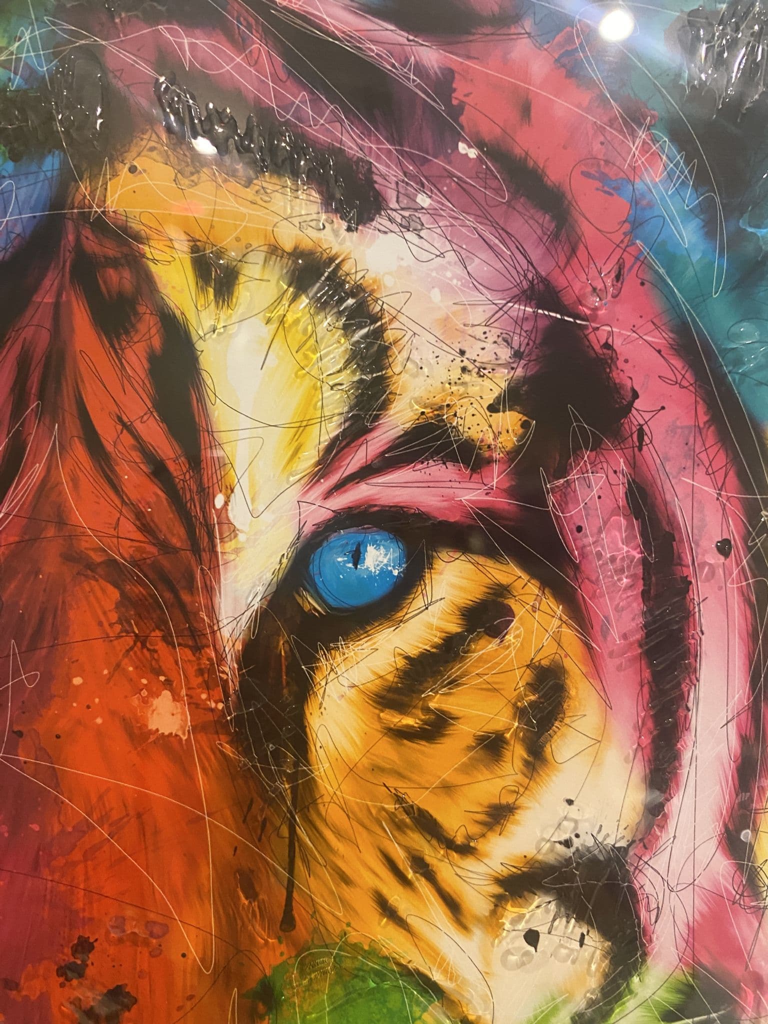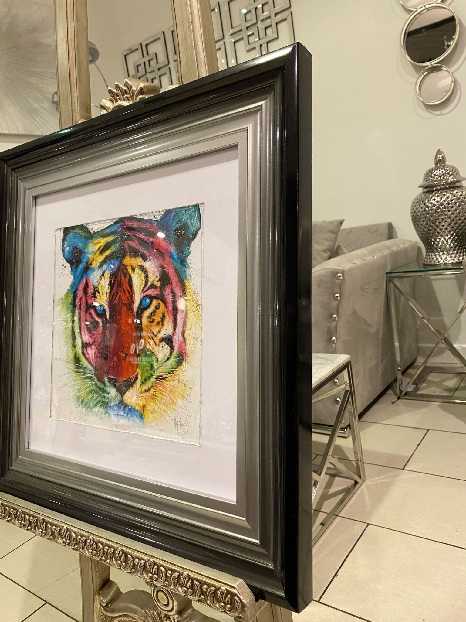 This picture is with a 'Multicolor Tiger' which exhibits a classy vibe with glitter details around the picture creating a smart look for your home. Finished with a black border step frame.