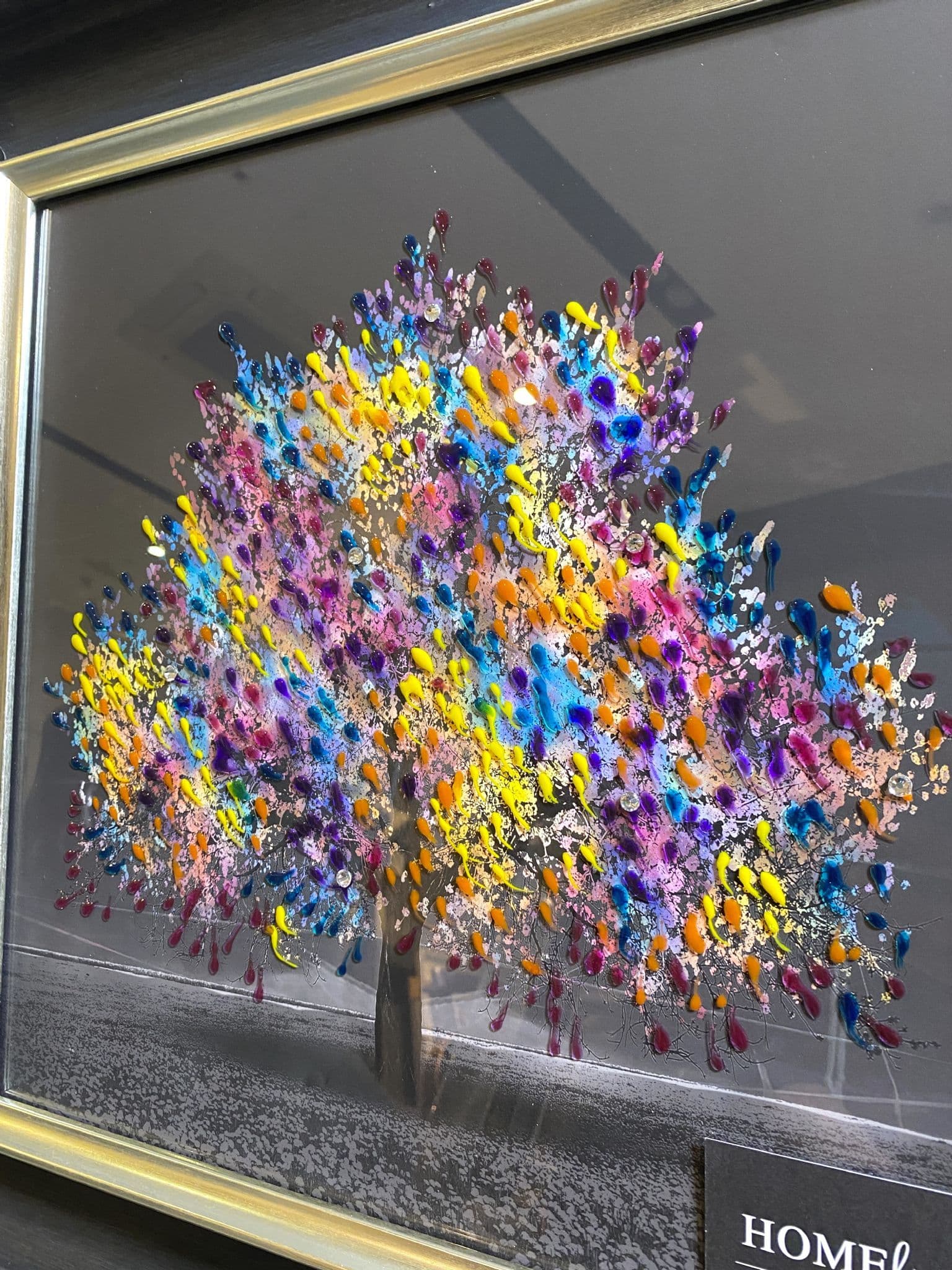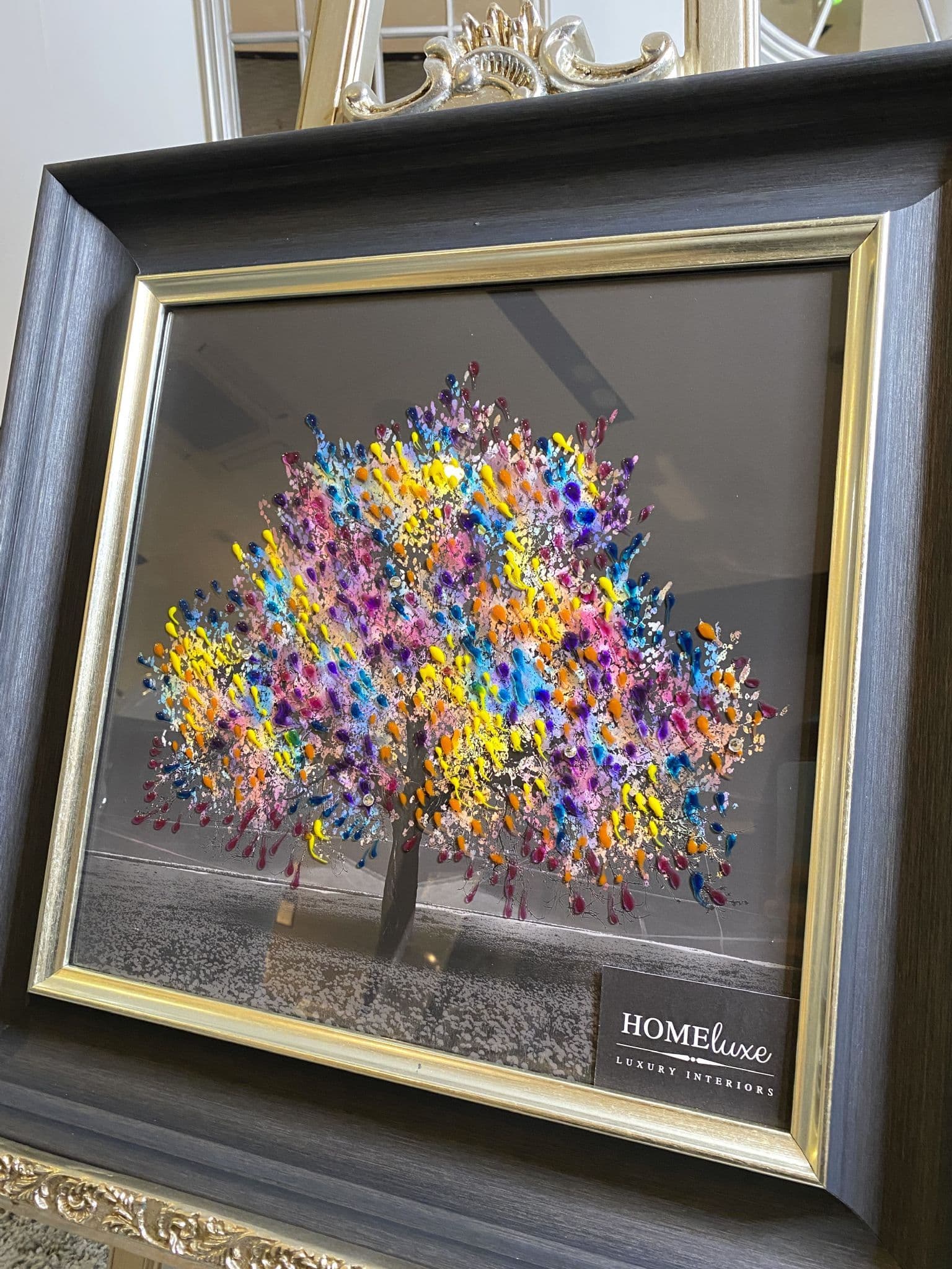 This picture features 'Multicolour Blossom Tree', exhibiting a rich design with liquid details around the picture, creating a smart look for your home. Finished with a black & gold frame.