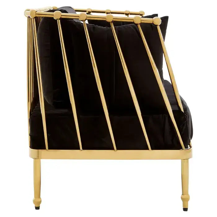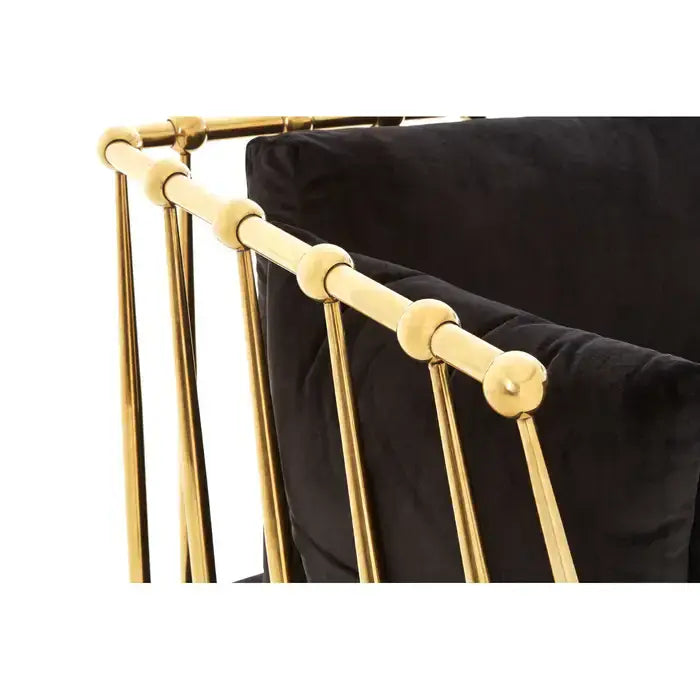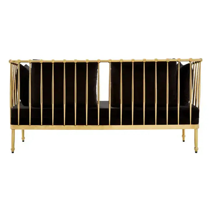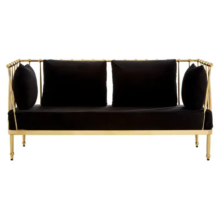 The framework of the Novo sofa is constructed of robust steel and sports a crisp golden finish, expressing a sense of elegance. Its sleek metallic body is softened by the velvety black velvet upholstery which covers the seat and five cushions, offering a smooth tactile feel. The Novo couch is a one-of-a-kind design piece that utilises metal bars to create a simple frame that is both stylish and fashionable