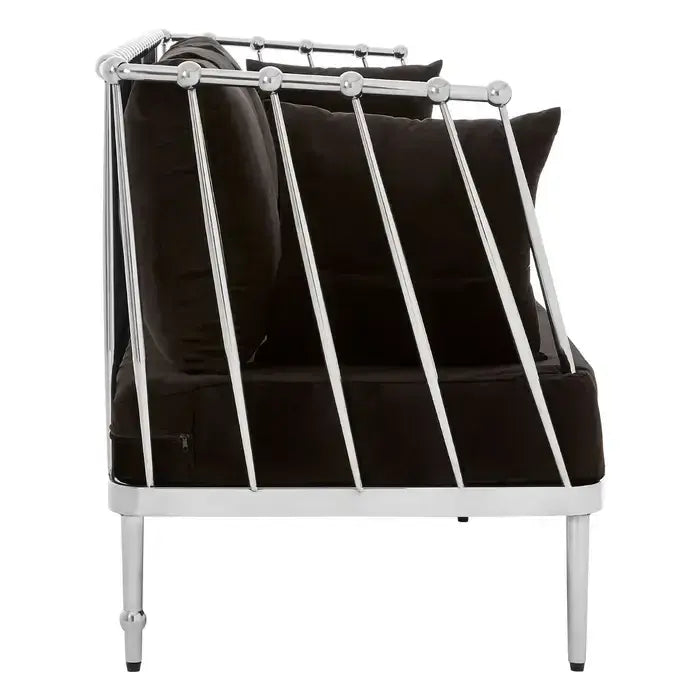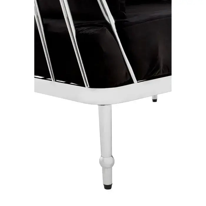 The framework of the Novo sofa is constructed of robust steel and sports a crisp silver finish, expressing a sense of elegance. Its sleek metallic body is softened by the velvety black velvet upholstery which covers the seat and five cushions, offering a smooth tactile feel. The Novo couch is a one-of-a-kind design piece that utilises metal bars to create a simple frame that is both stylish and fashionable