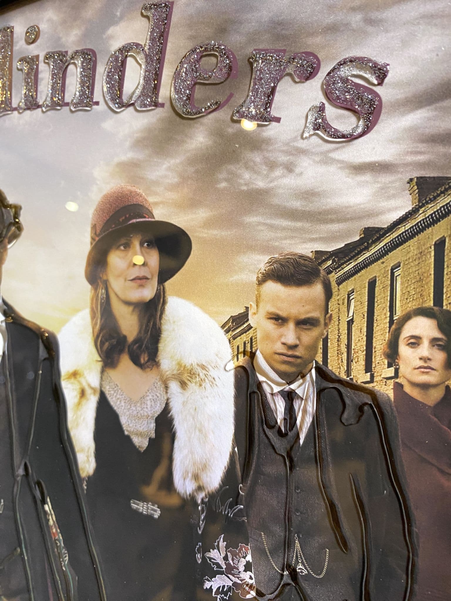 This picture features 'Peaky Blinders', exhibiting a rich design with liquid details around the picture, creating a smart look for your home. Finished with a black & gold frame.