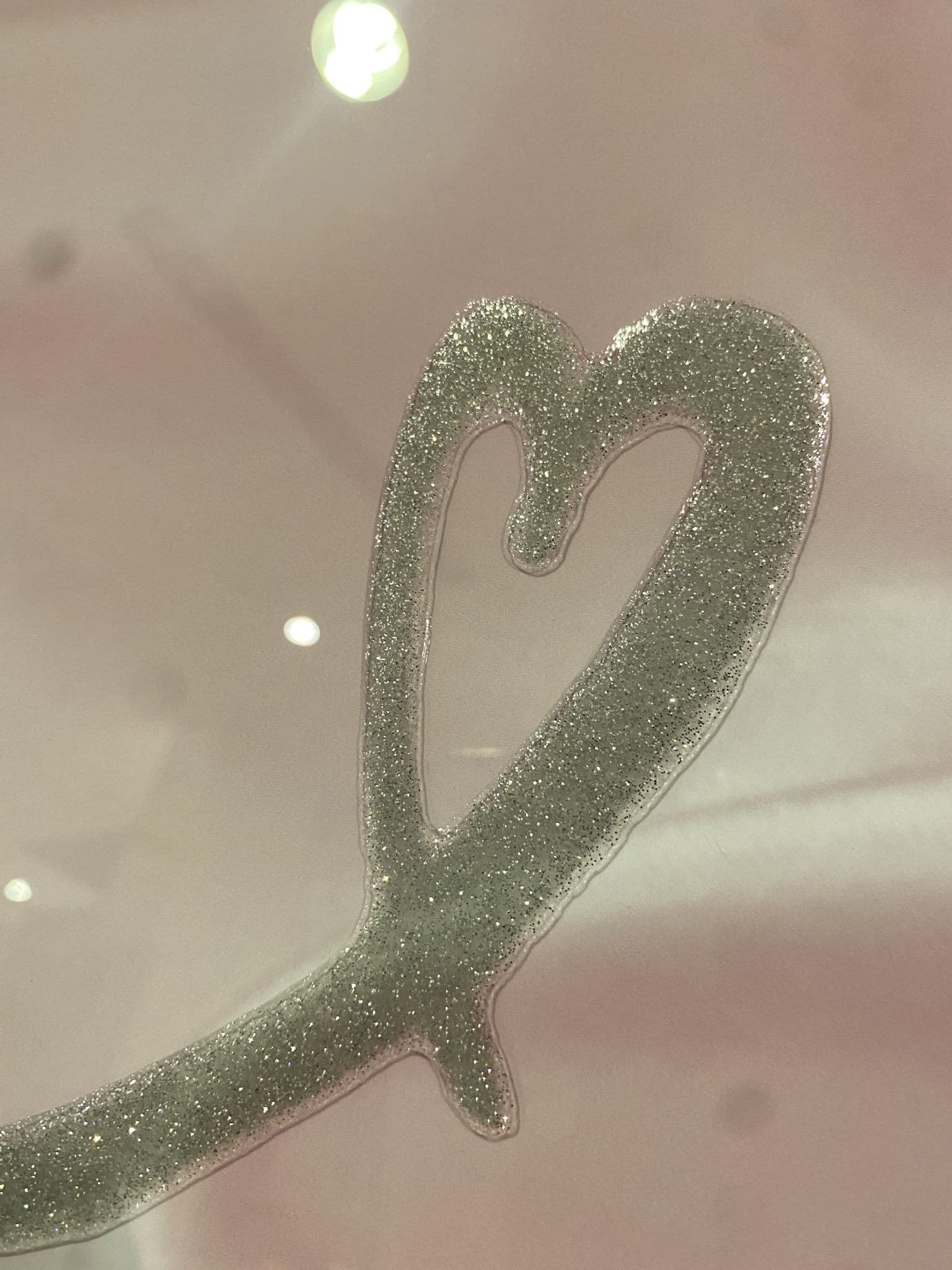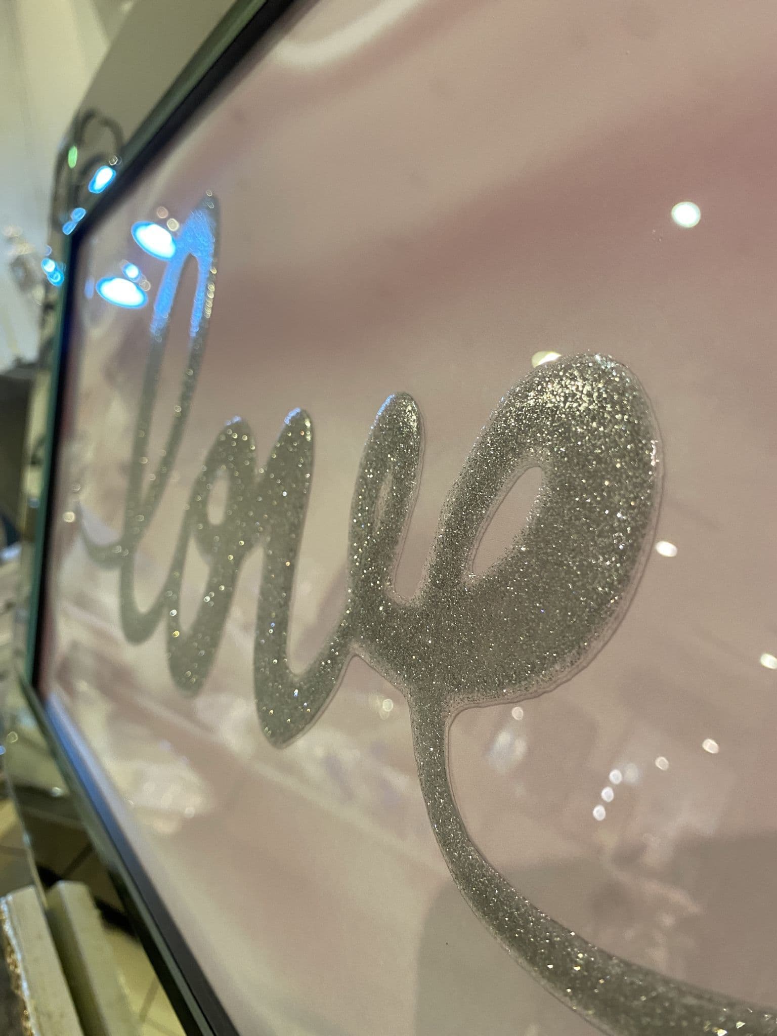 This picture features a 'Pink Love Font' that exhibits a rich design with glitter details around the picture, creating a smart look for your home. Finished with a chrome step frame.