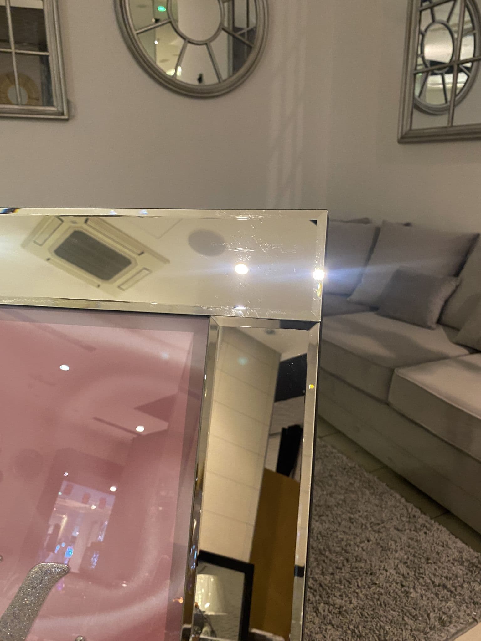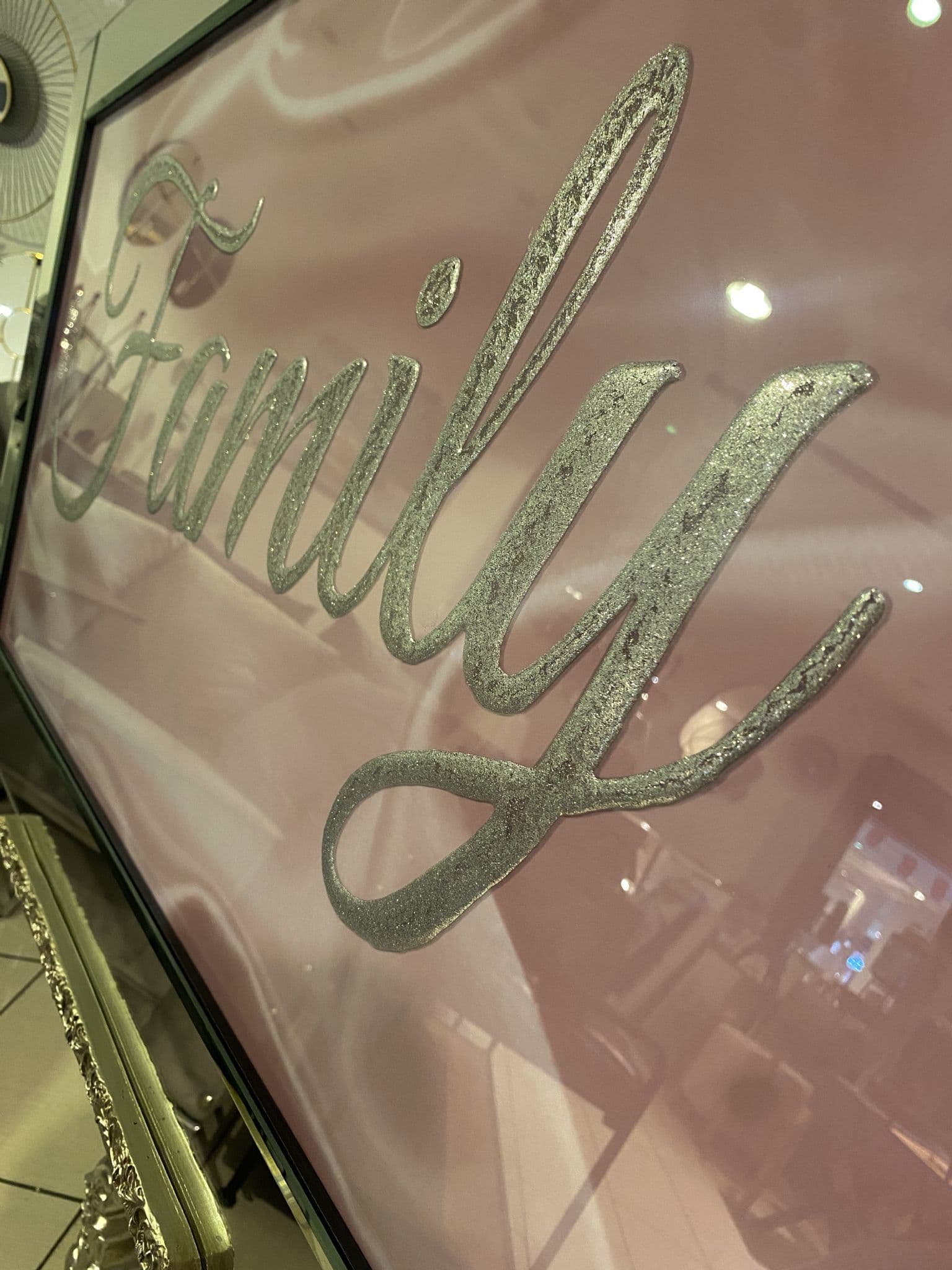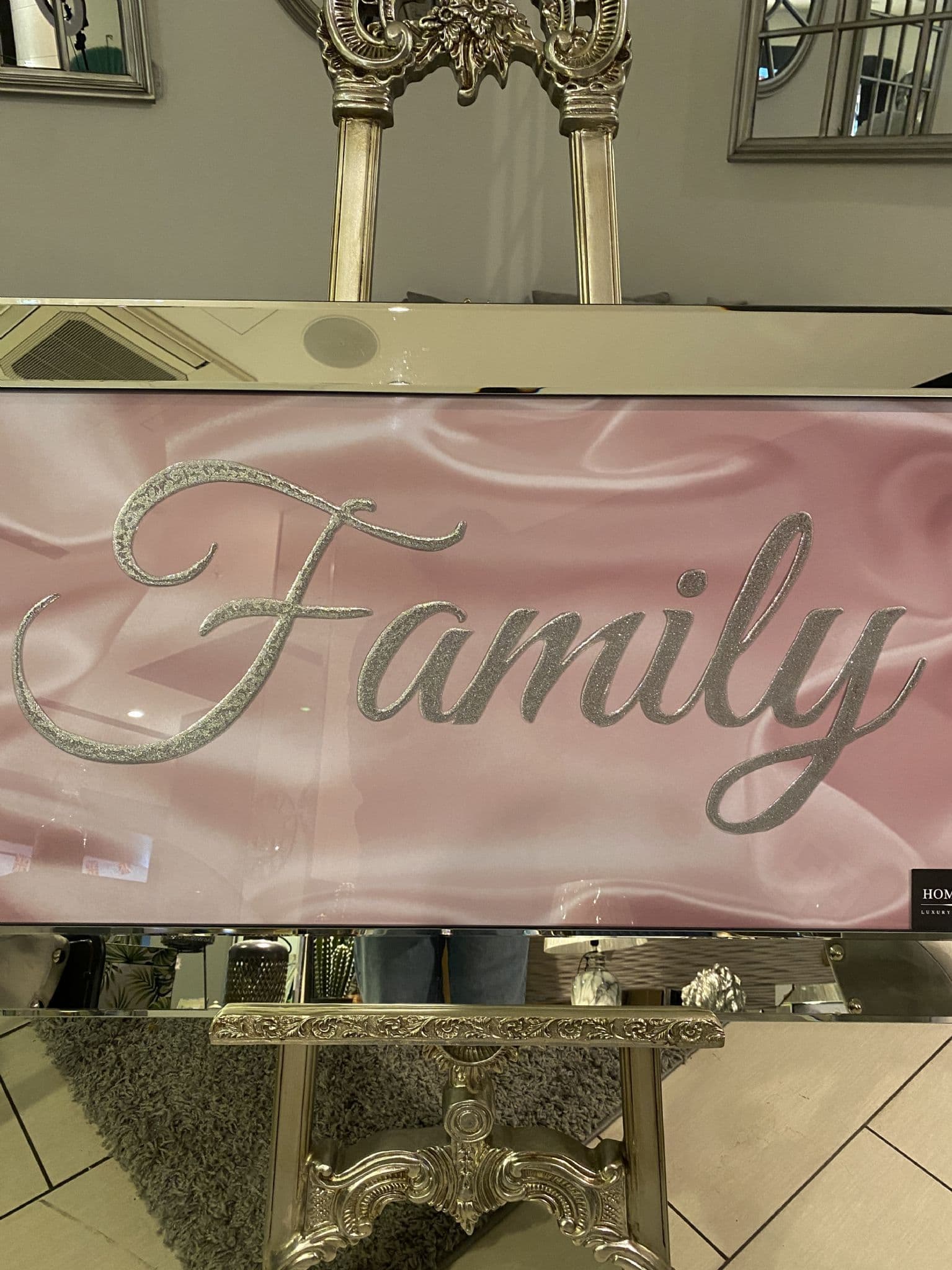 This picture features 'Pink Silk Family Silver Glitter', exhibiting a rich design with liquid details around the picture, creating a smart look for your home. Finished with Mirror Frame.
