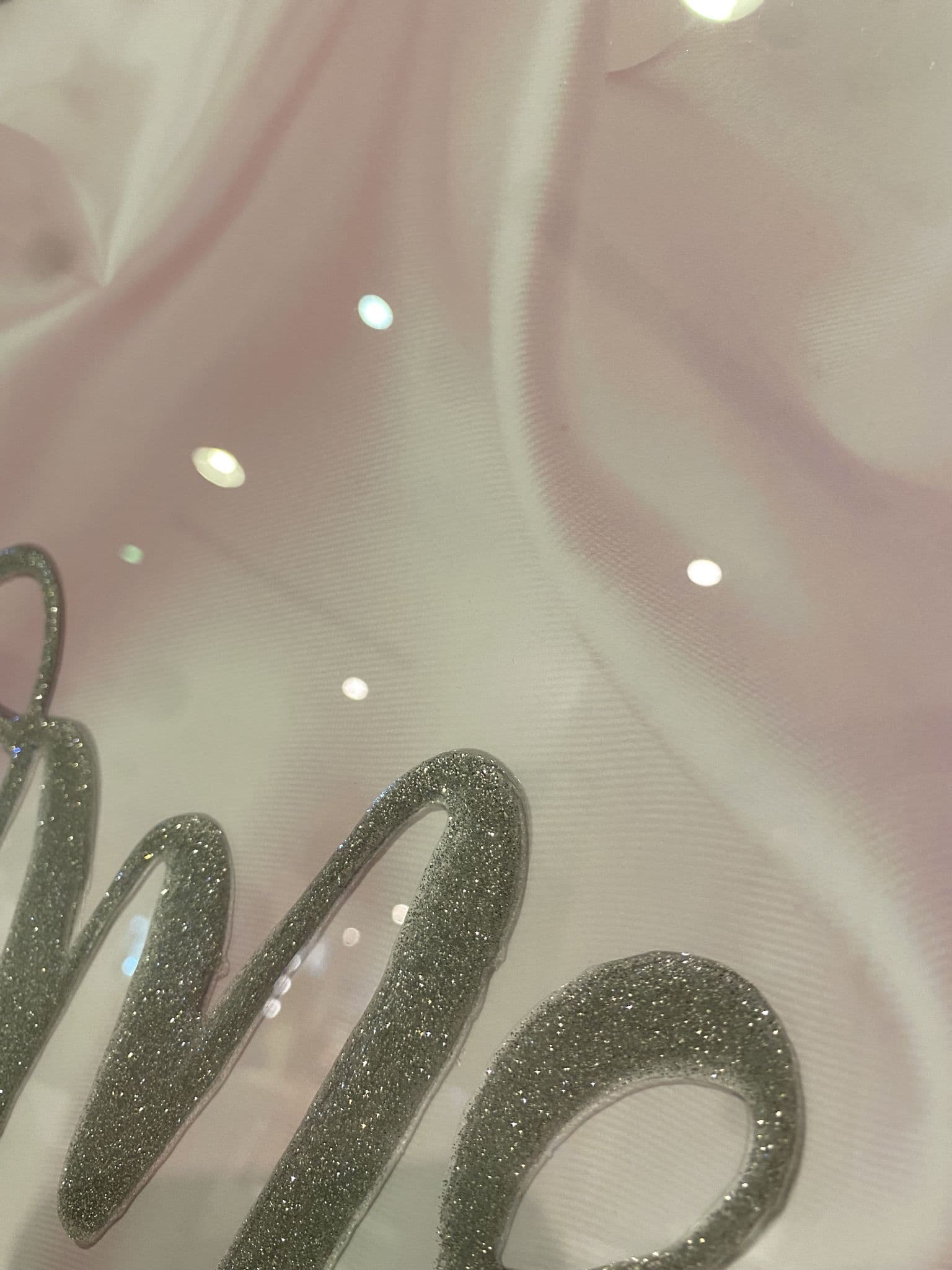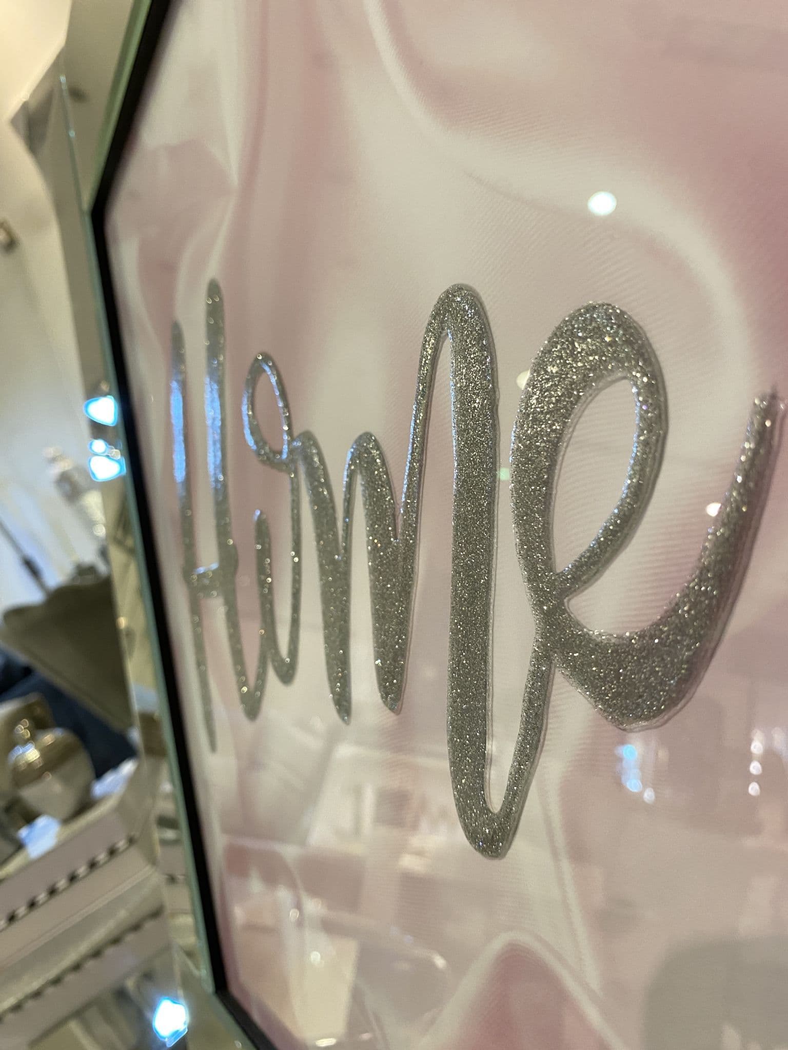 This picture features a 'Pink Silk Home Font' that exhibits a rich design with glitter details around the picture, creating a smart look for your home. Finished with a mirror frame.