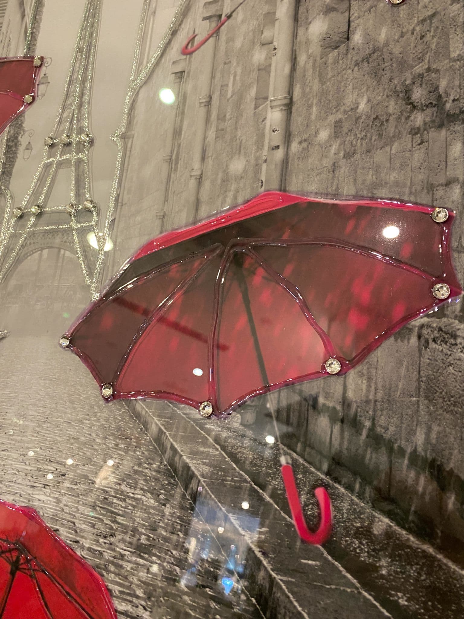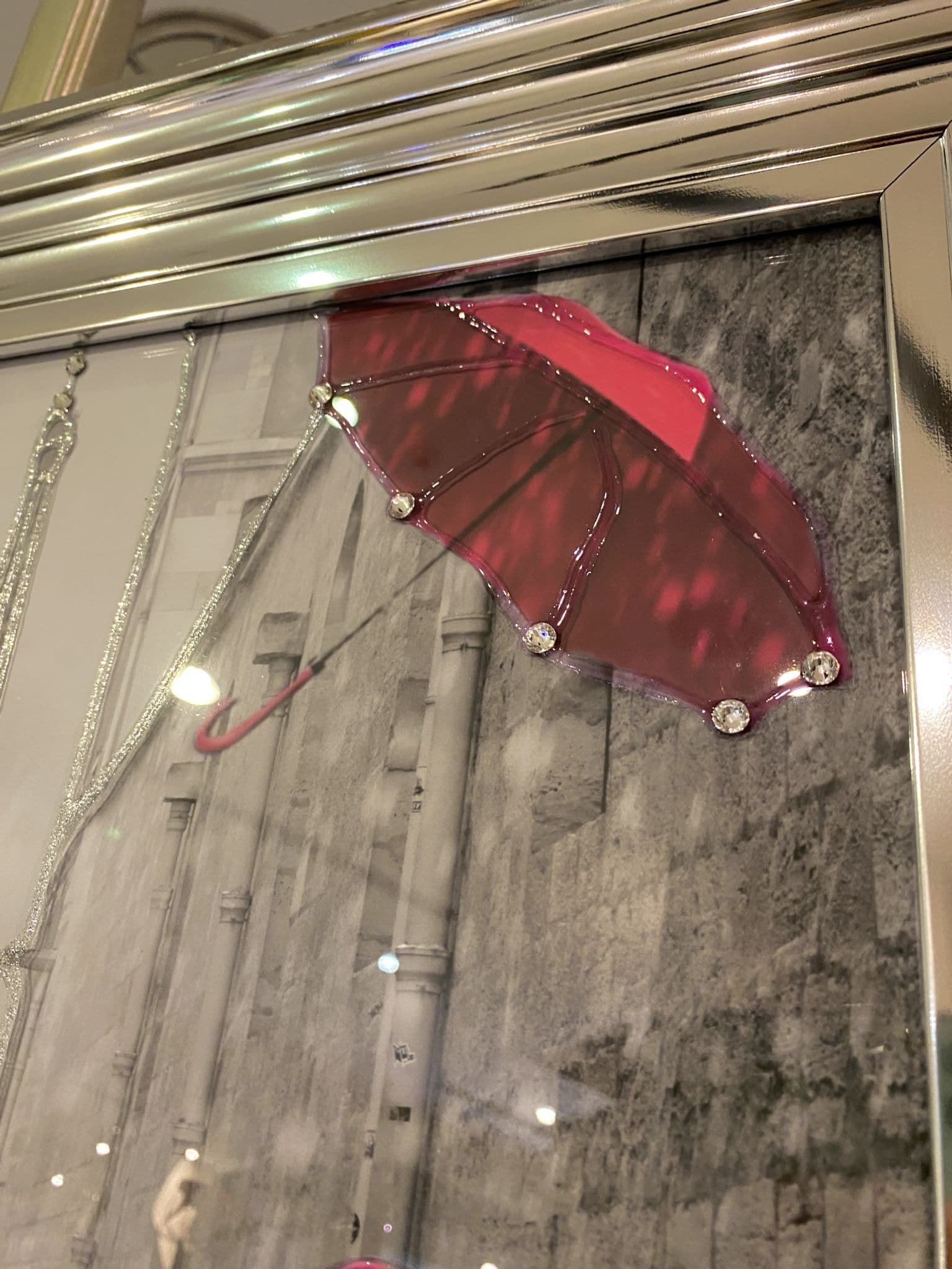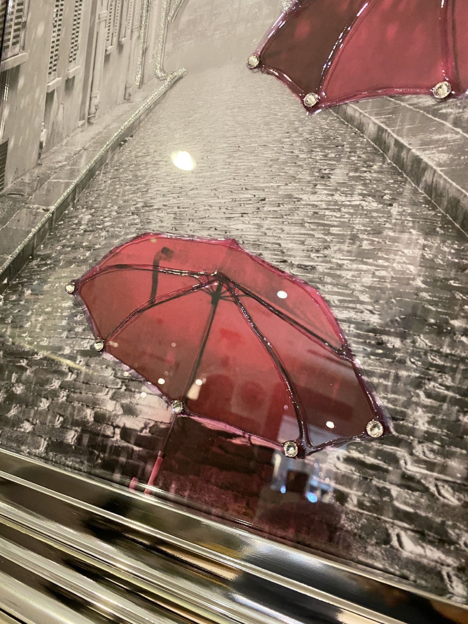 This picture features 'Pink Umbrellas Rain In Paris', exhibiting a rich design with liquid details around the picture, creating a smart look for your home. Finished with a Chrome Step Frame.