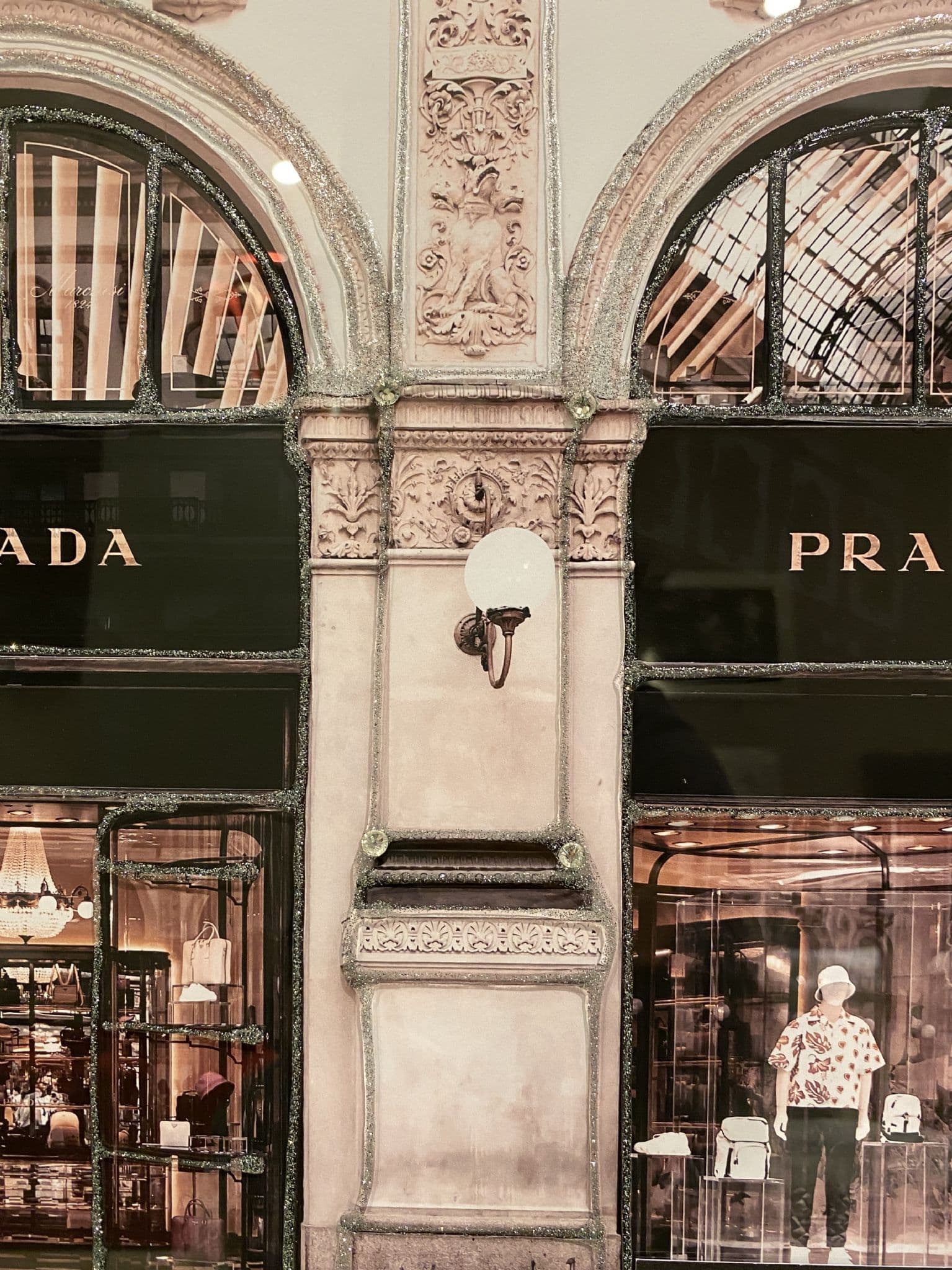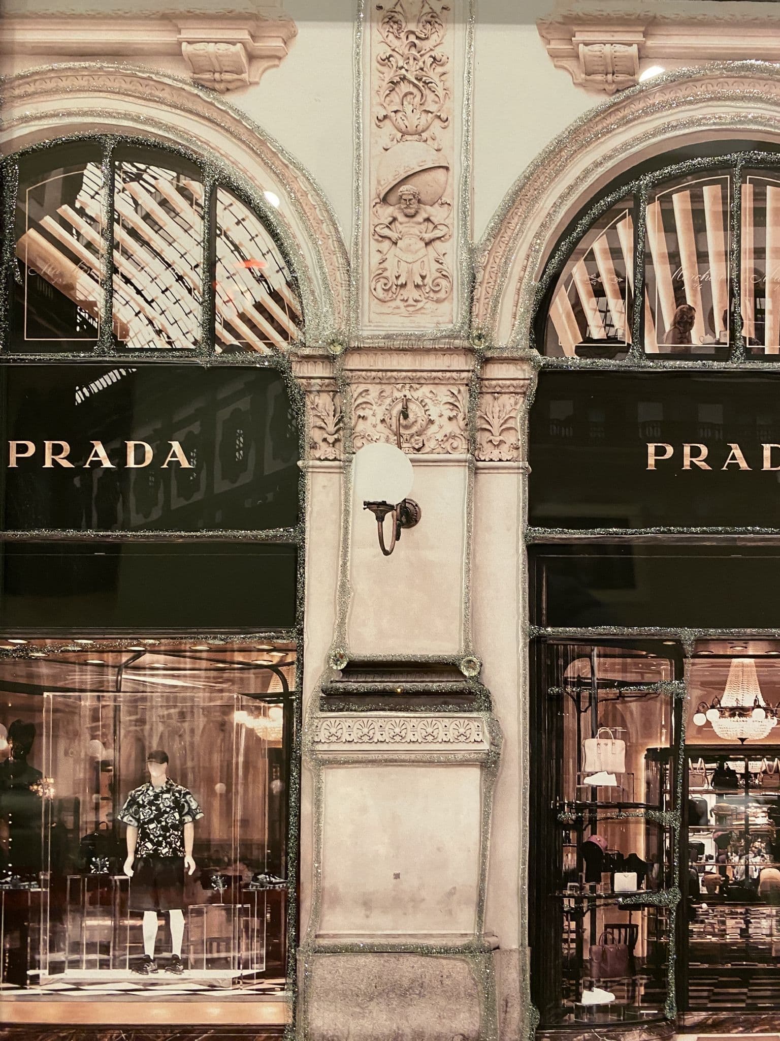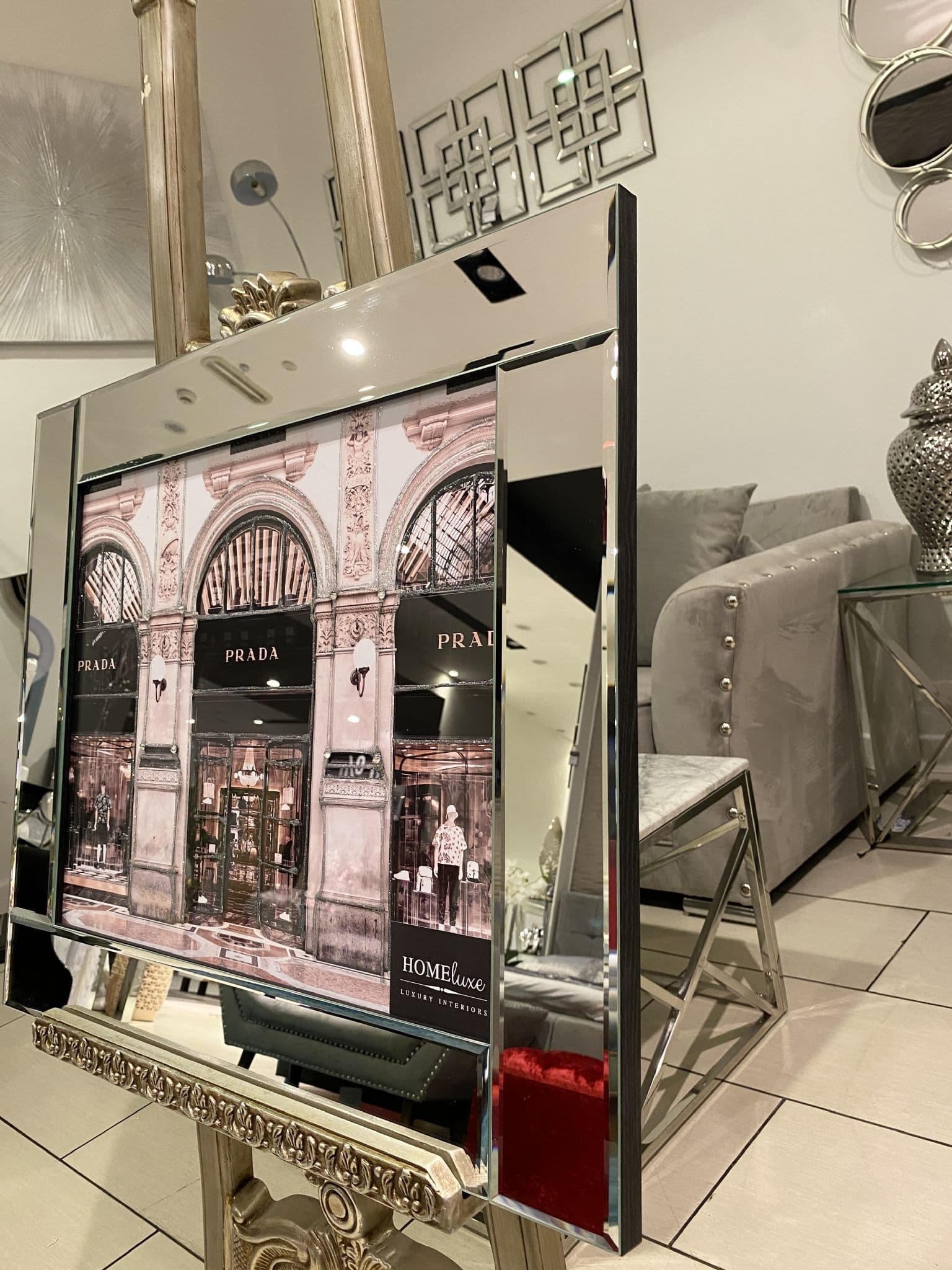 This picture is with a 'Prada Shop Front' which exhibits a classy vibe with glitter details around the picture creating a smart look for your home. Finished with a mirror frame.