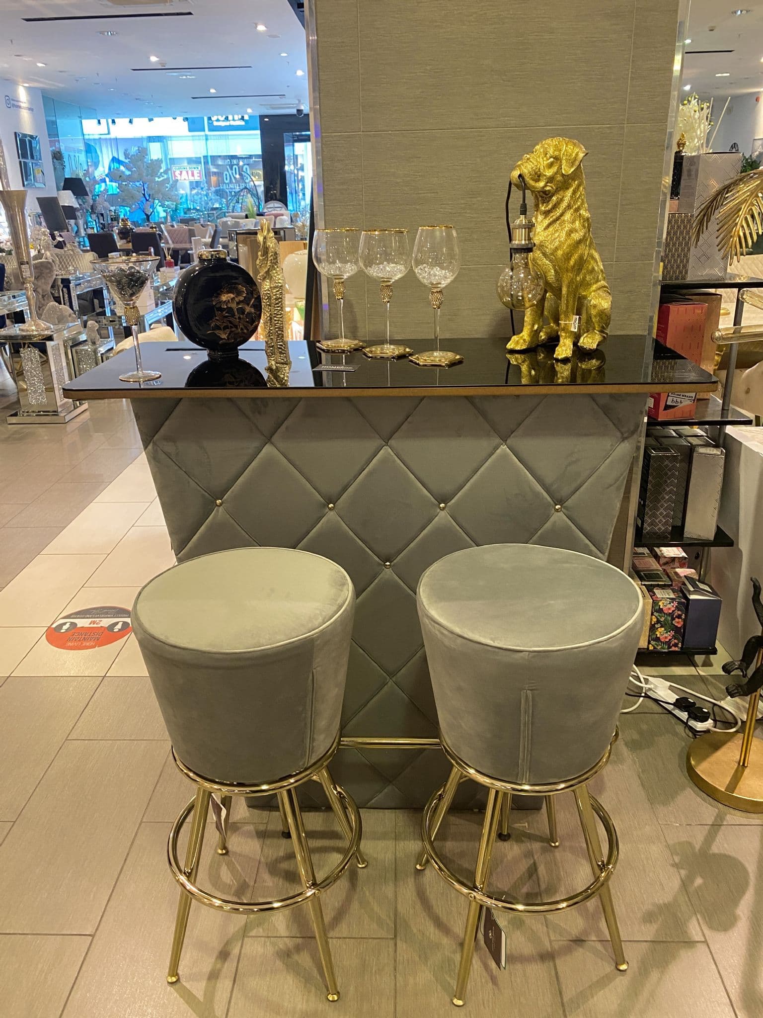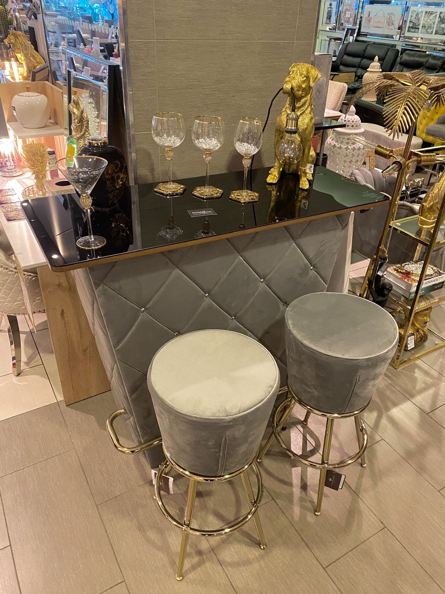 This luxury Preston Bar Set is the perfect accent for any modern interior. Decorative and functional, wrapped with a soft grey velvet design, two complementary stools with champagne, golden detailing to further elevate its class and featuring discrete storage compartments. Making this set a must have essential for any at home-bar
