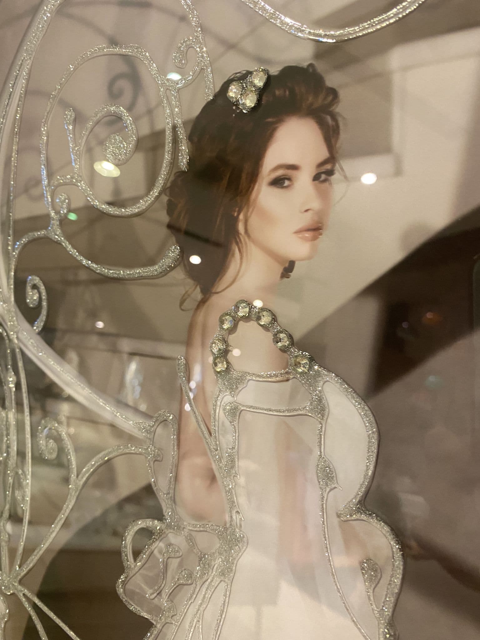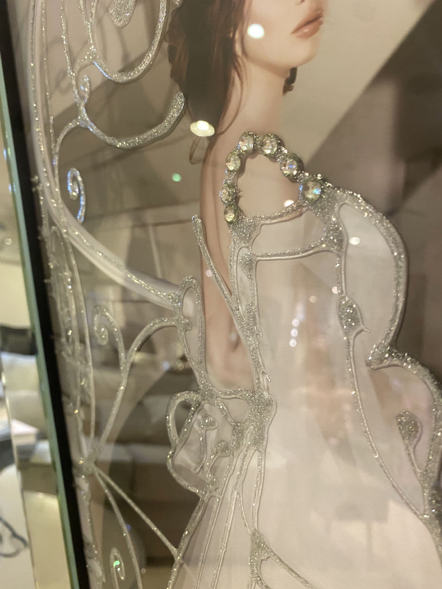 This picture features a 'Princess White Dress' that exhibits a rich design with glitter details around the picture, creating a smart look for your home. Finished with a chrome step frame.