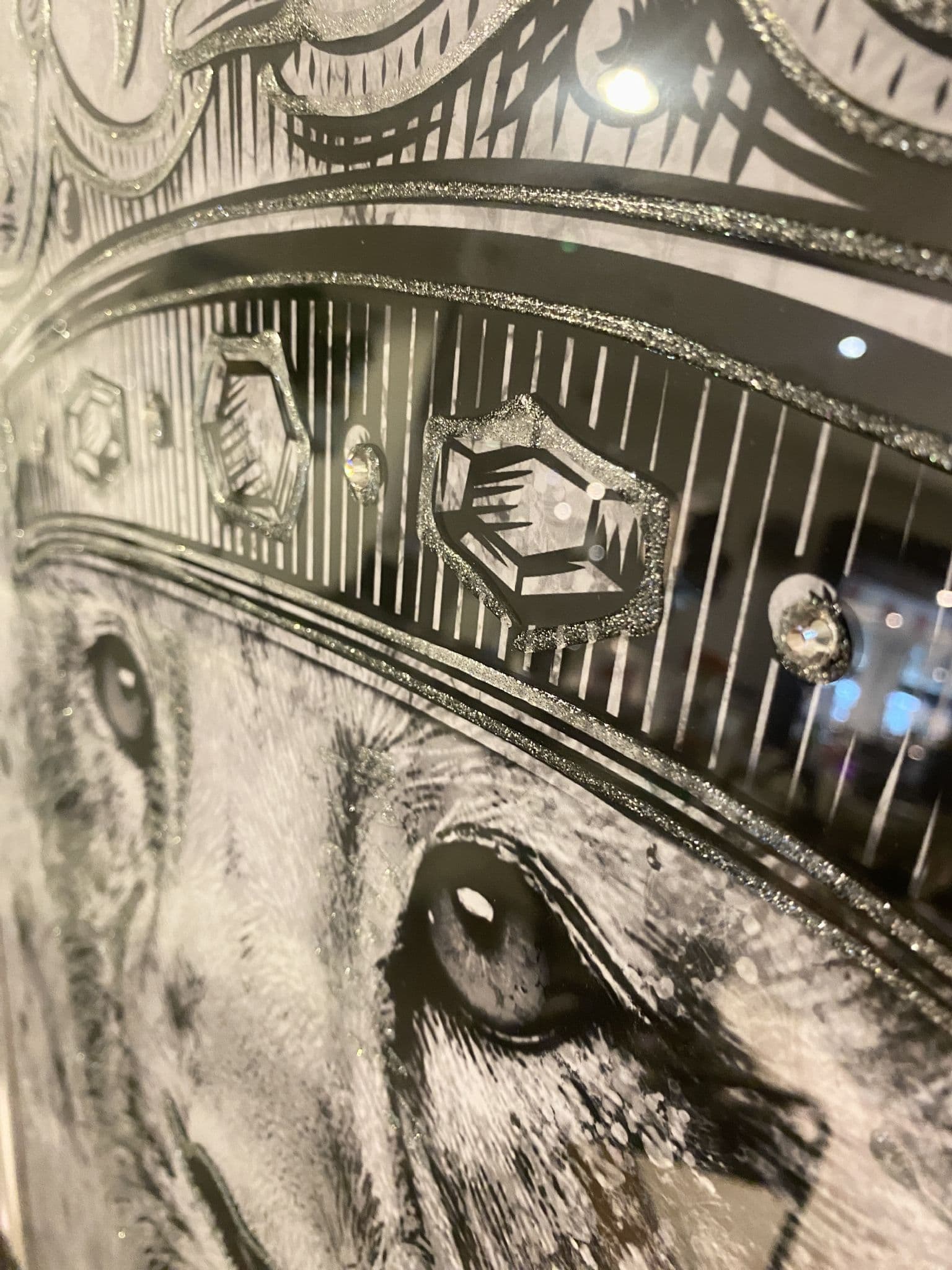 This picture features 'Queen Of Hearts Lioness', exhibiting a rich design with liquid details around the picture, creating a smart look for your home. Finished with a Chrome Step Frame.
