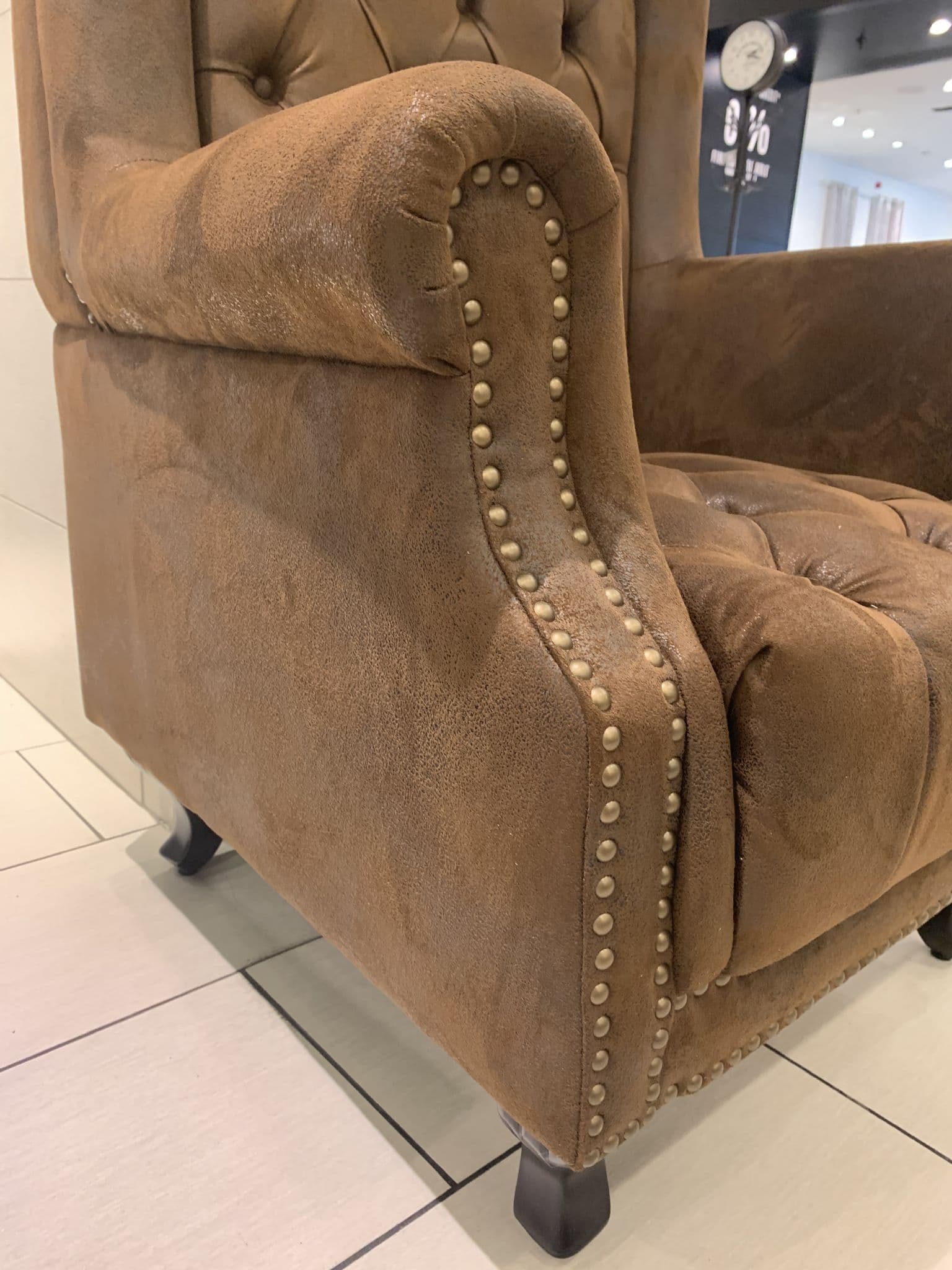 This striking chair is upholstered in luxurious brown microfibre rustic effect, soft and highly durable.