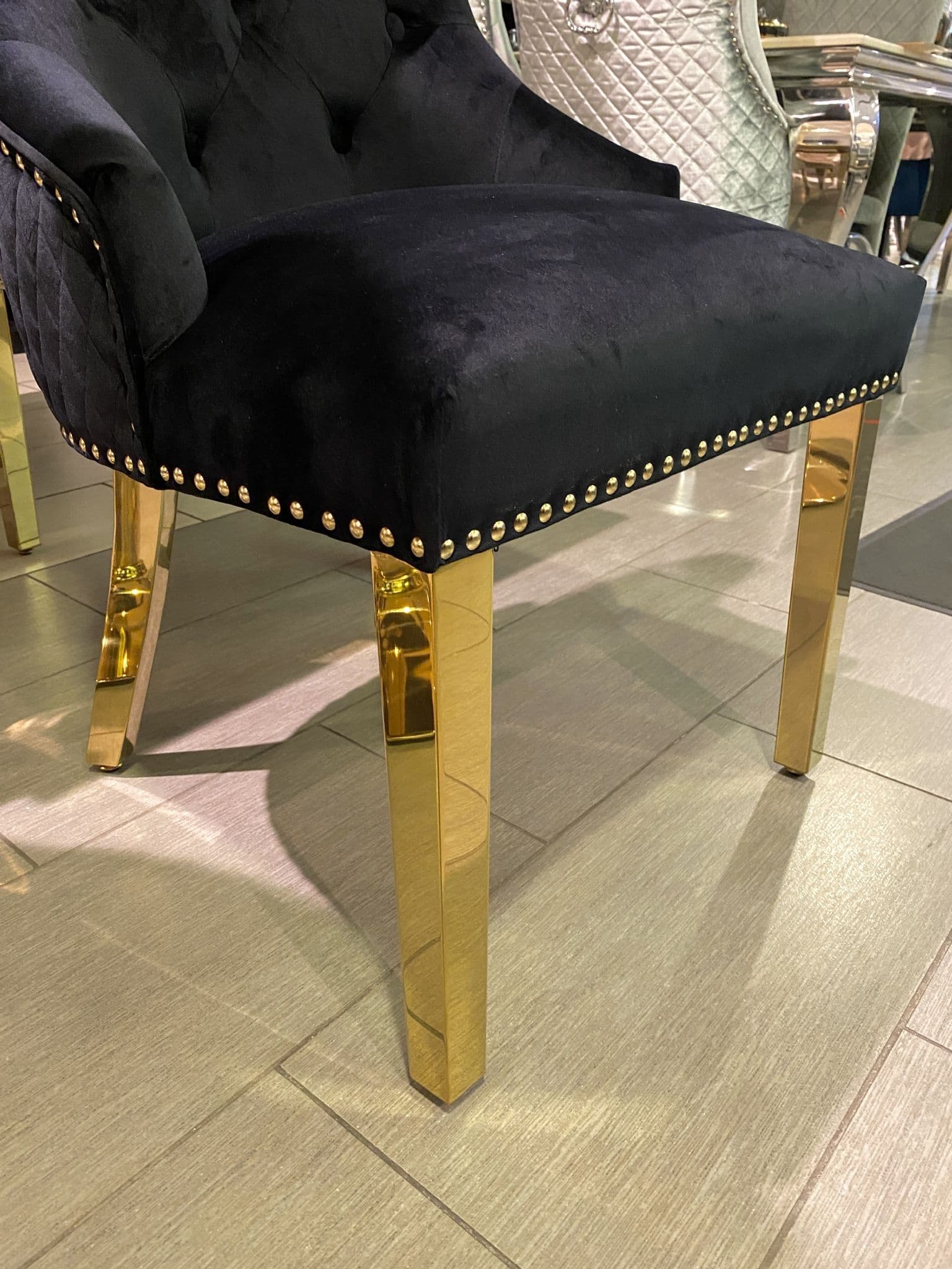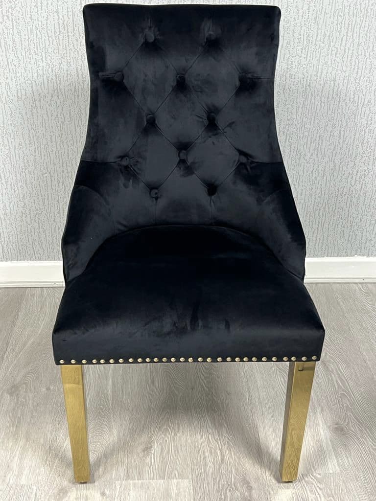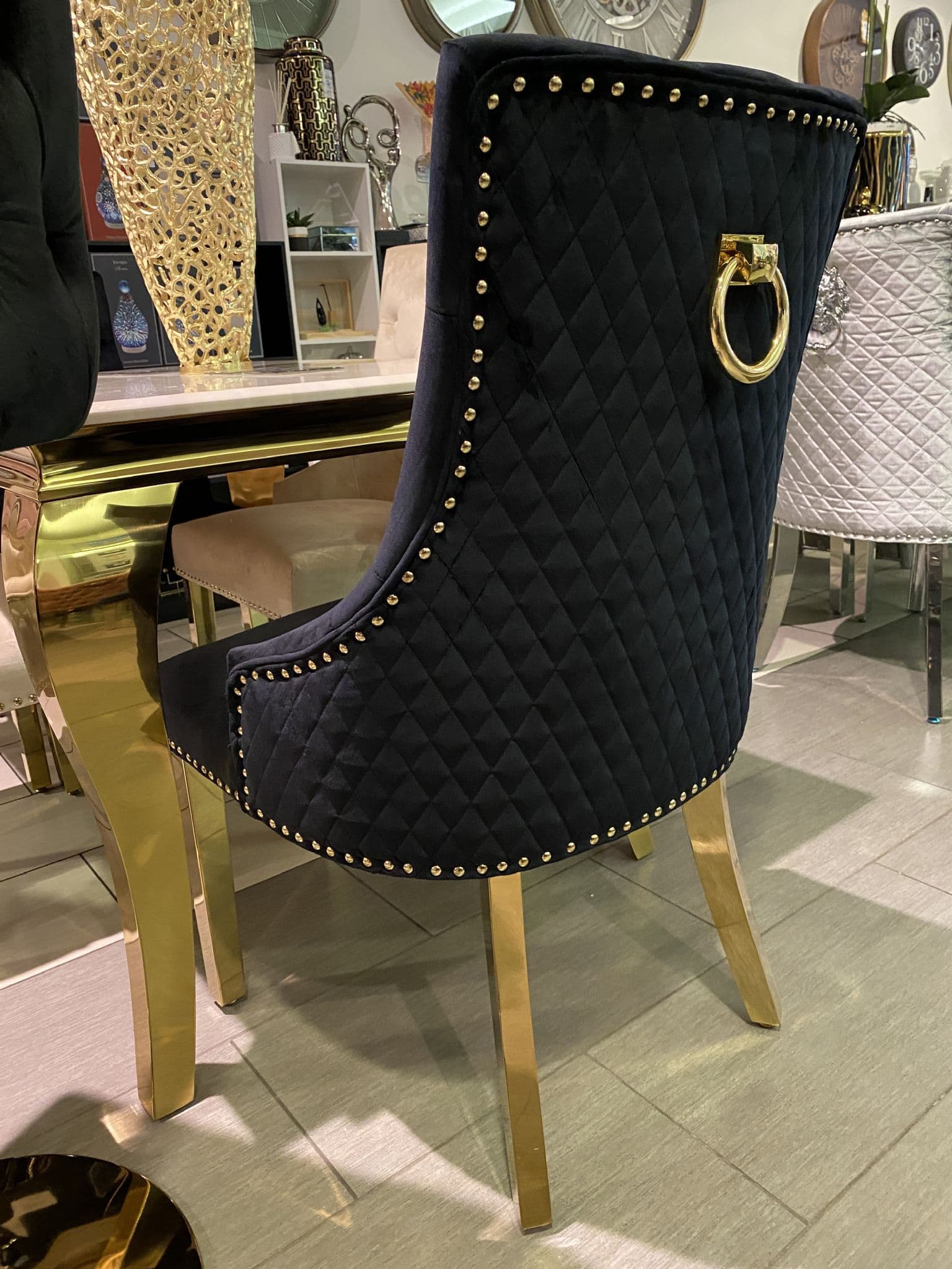 Add a flare of glamour to any living space or dining area with these luxurious Majestic Dining Chairs, embodying a comfortable rich velvet fabric, with a majestic ring knocker back and detailed stud outlining to add an extra touch of class, with prominent gold legs and a curved back architecture, making this product fashionable and functional. This product comes in a range of different colours available online.