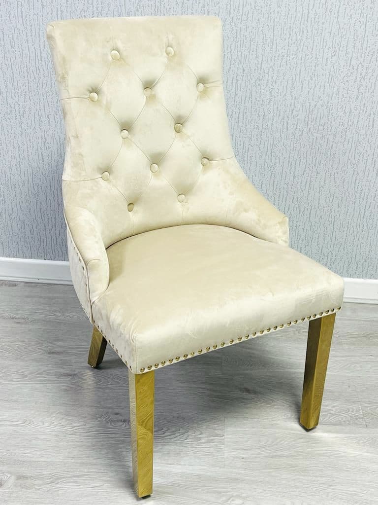 Add a flare of glamour to any living space or dining area with these luxurious Majestic Dining Chairs, embodying a comfortable rich velvet fabric, with a majestic ring knocker back and detailed stud outlining to add an extra touch of class, with prominent gold legs and a curved back architecture, making this product fashionable and functional. This product comes in a range of different colours available online.