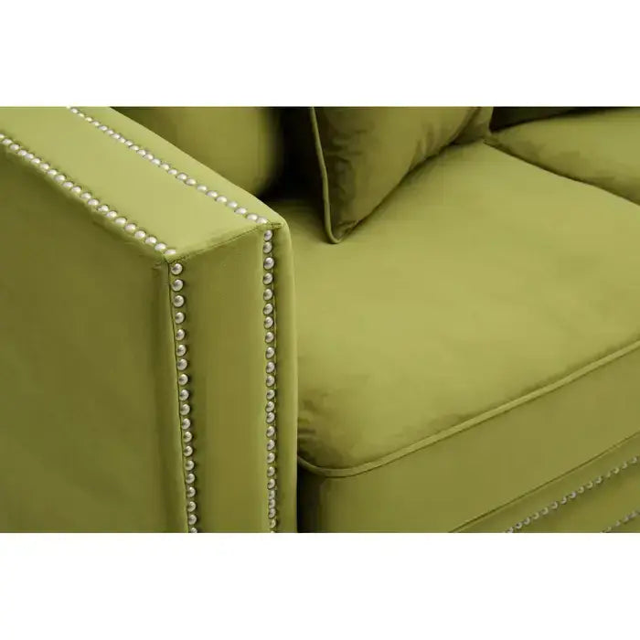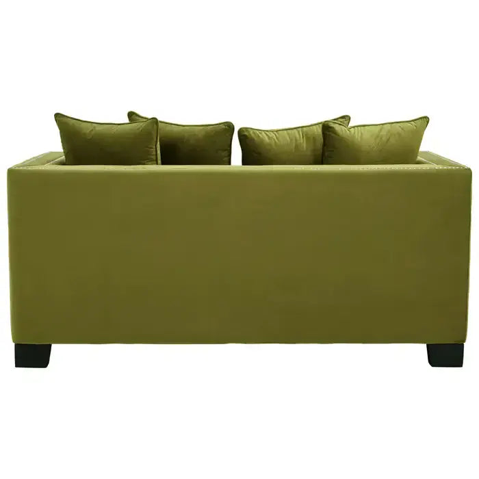 This two-seater sofa is upholstered in a vibrant moss velvet and boasts a thickly padded seat with complementing cushions. It's designed with an ergonomic backrest and elevated armrests with a metallic nailhead trim on its exterior. Contrasting the rare fabric, the natural rubberwood feet are painted black.