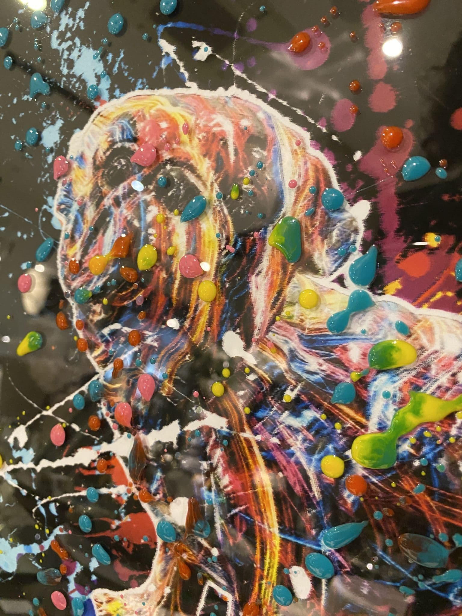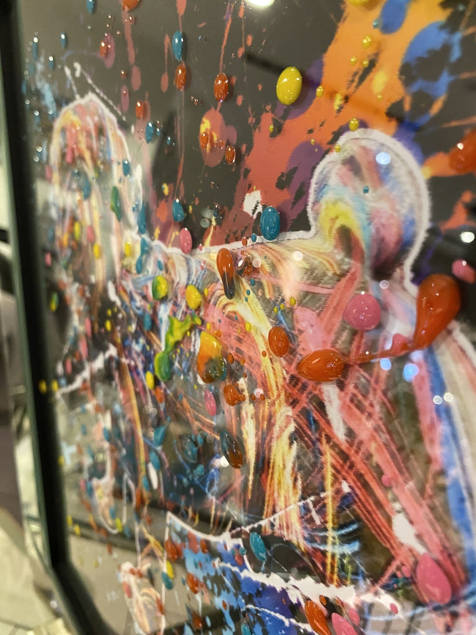 This picture features 'Supernova Ballon Dog Multicolour', exhibiting a rich design with liquid details around the picture, creating a smart look for your home. Finished with a Mirror Frame.