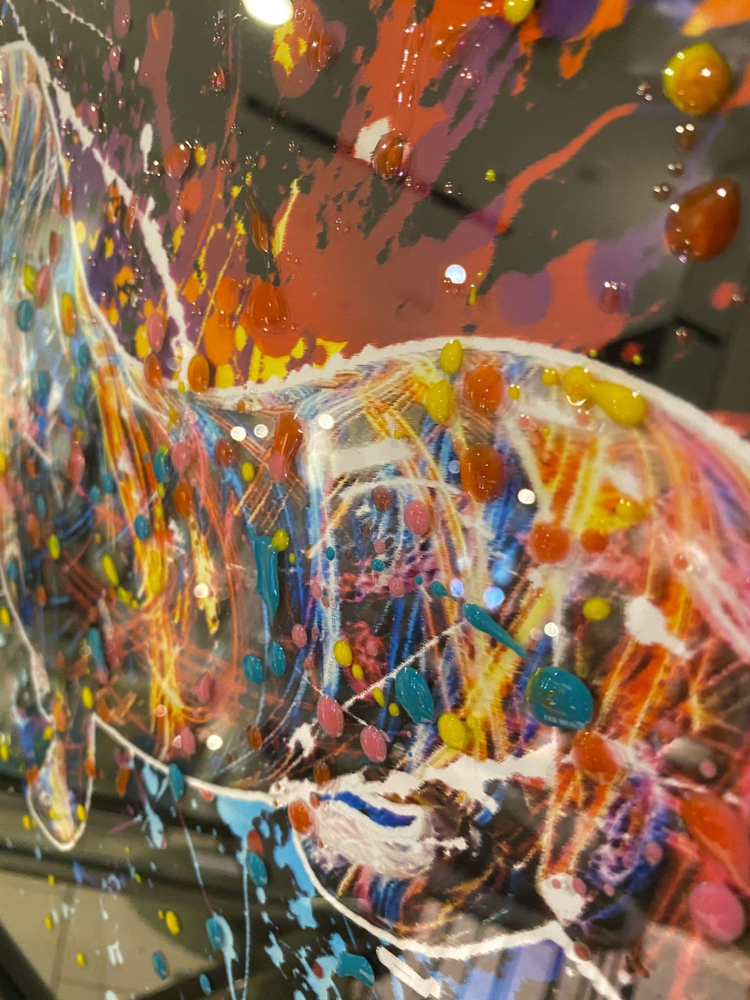 This picture features 'Supernova Pug Multicolour', exhibiting a rich design with liquid details around the picture, creating a smart look for your home. Finished with a Mirror Frame.