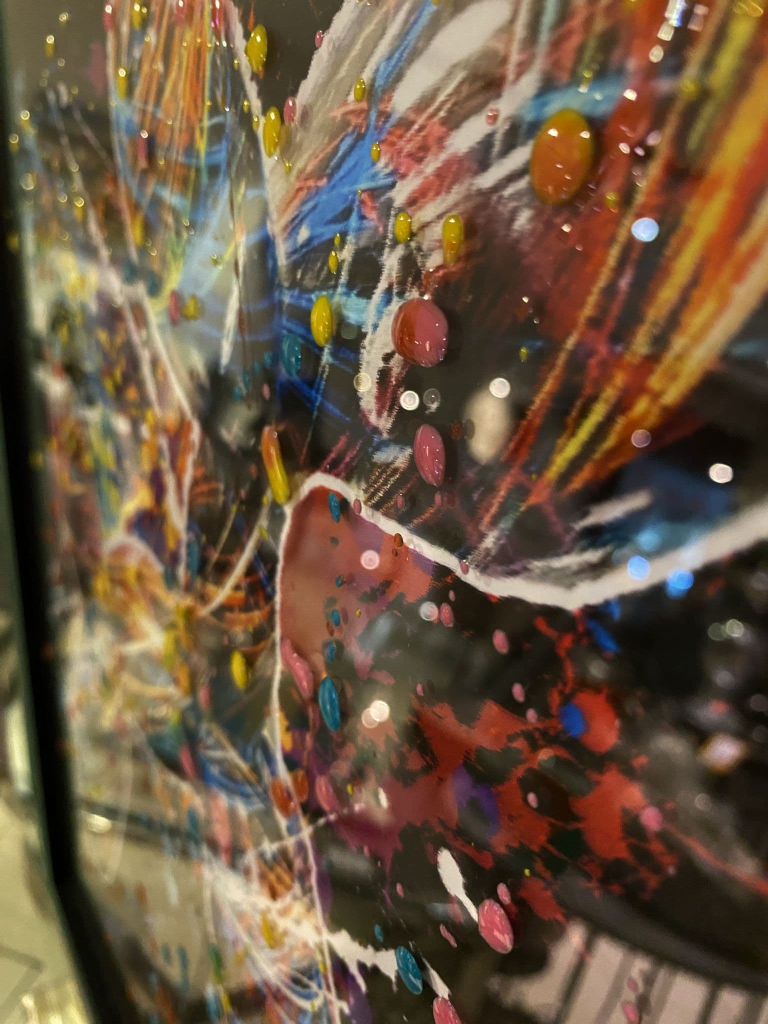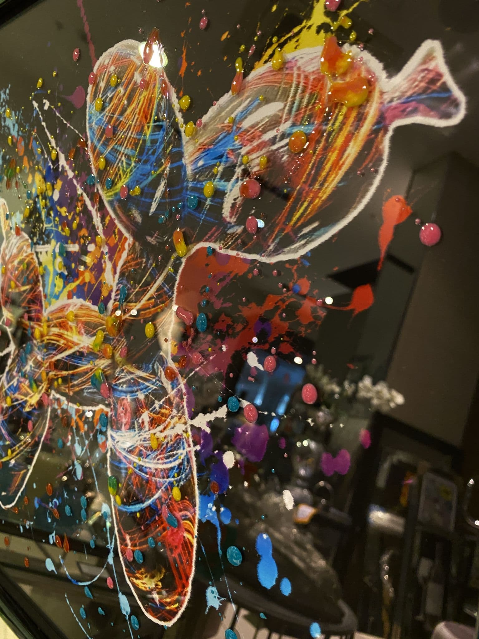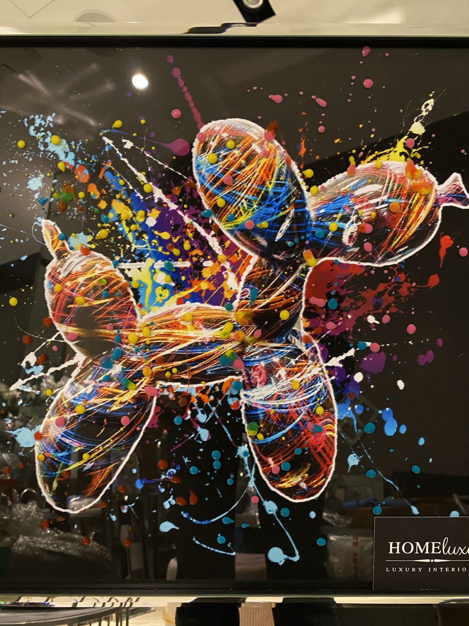 This picture features 'Supernova Sausage Dog Multicolour', exhibiting a rich design with liquid details around the picture, creating a smart look for your home. Finished with a Mirror Frame.