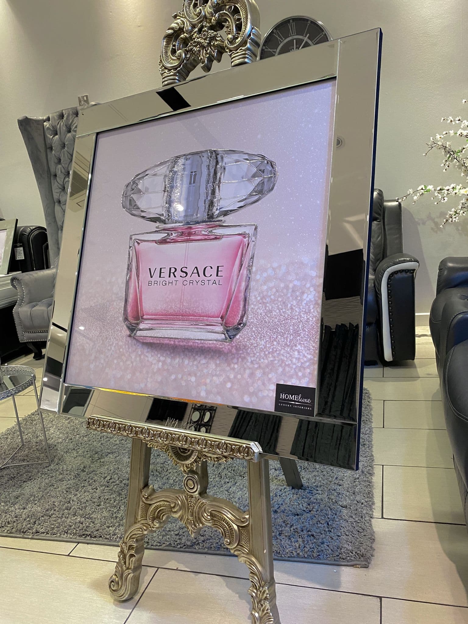 This picture is with a chic 'Versace Crystal Perfume Bottle' that exhibits a classy design with glitter details around the picture creating a smart look for your home. Finished with a mirror frame.