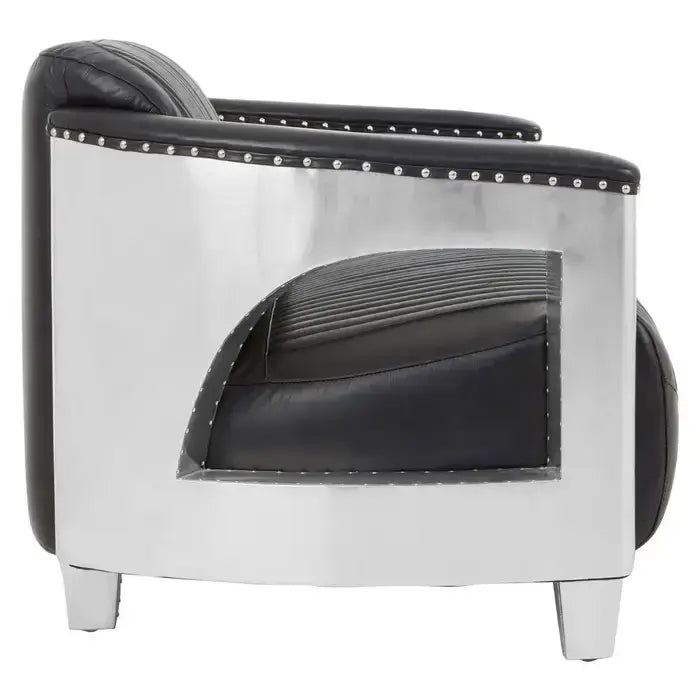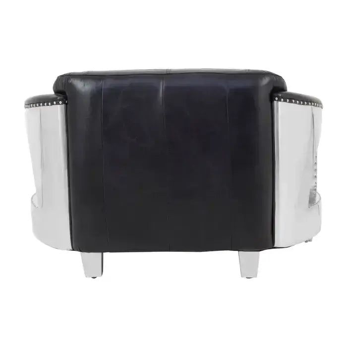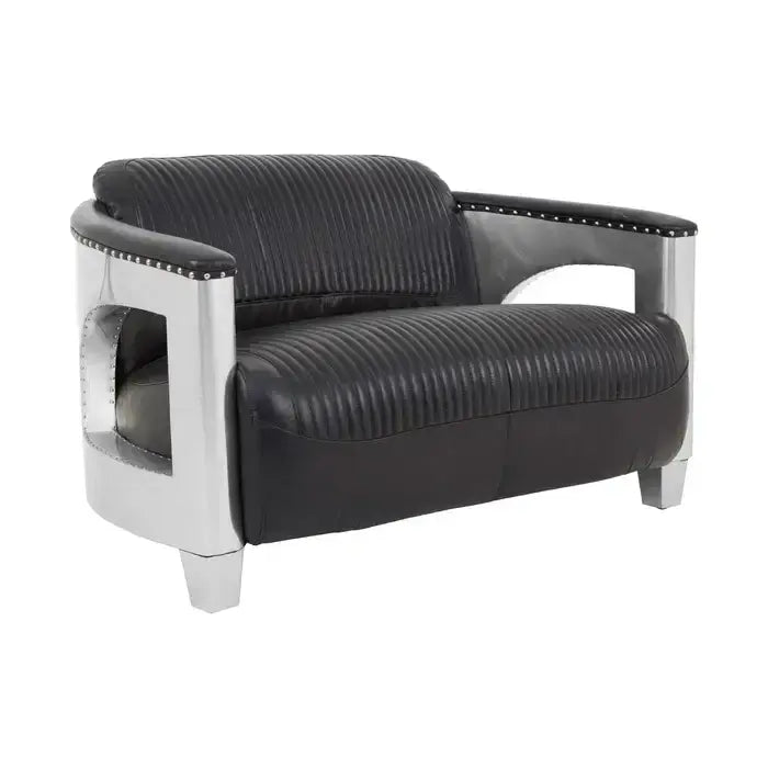 Boasting channel tufted leather upholstery and sleek metal arms, this two-seater Victor sofa emits a gently vintage vibe. Leather and metal stud details provide depth and an elegant industrial appearance.