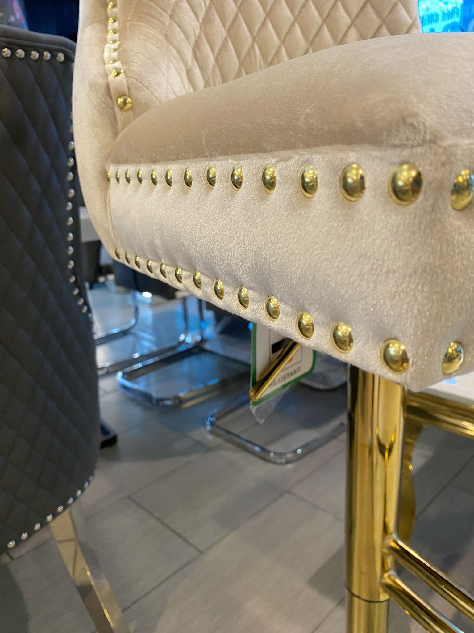 Add a flare of glamour to any living space or dining area with this Victoria Cream Velvet Barstool, embodying a comfortable rich velvet fabric, with a majestic lion knocker back and detailed stud outlining to add an extra touch of class, with a prominent, golden leg/footrest and a curved back architecture, making this product fashionable and functional. This product comes in a range of different colours available online.