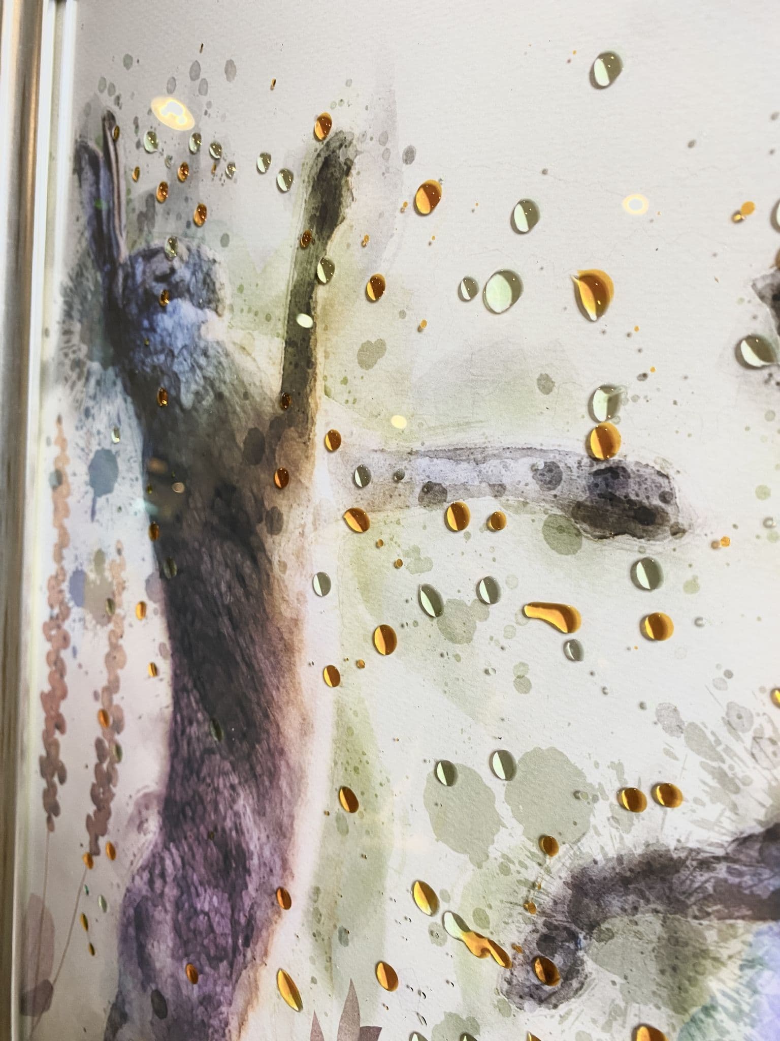 This picture features 'Waterpaint Hares Multicolour', exhibiting a rich design with liquid details around the picture, creating a smart look for your home. Finished with a chic black frame.