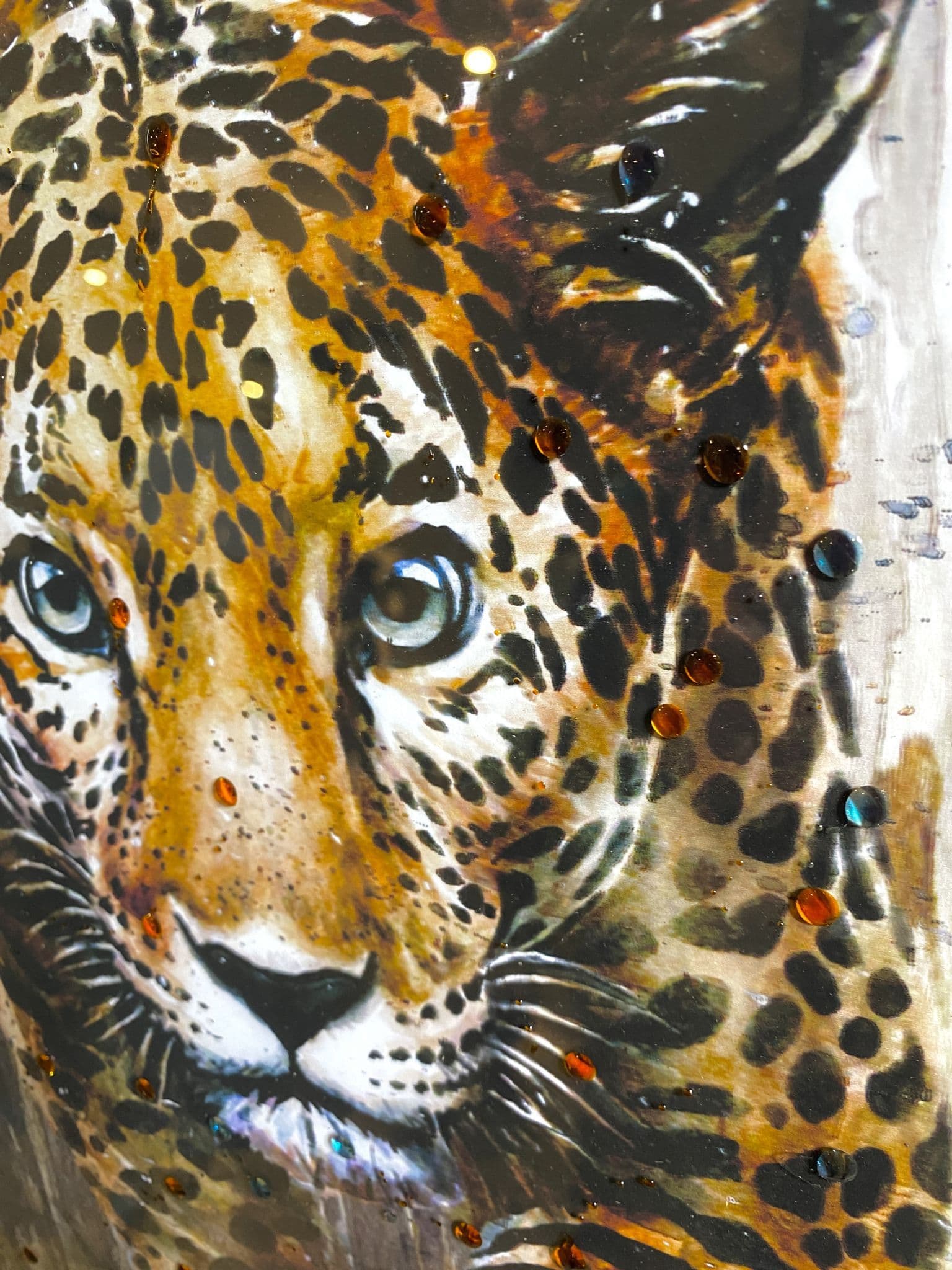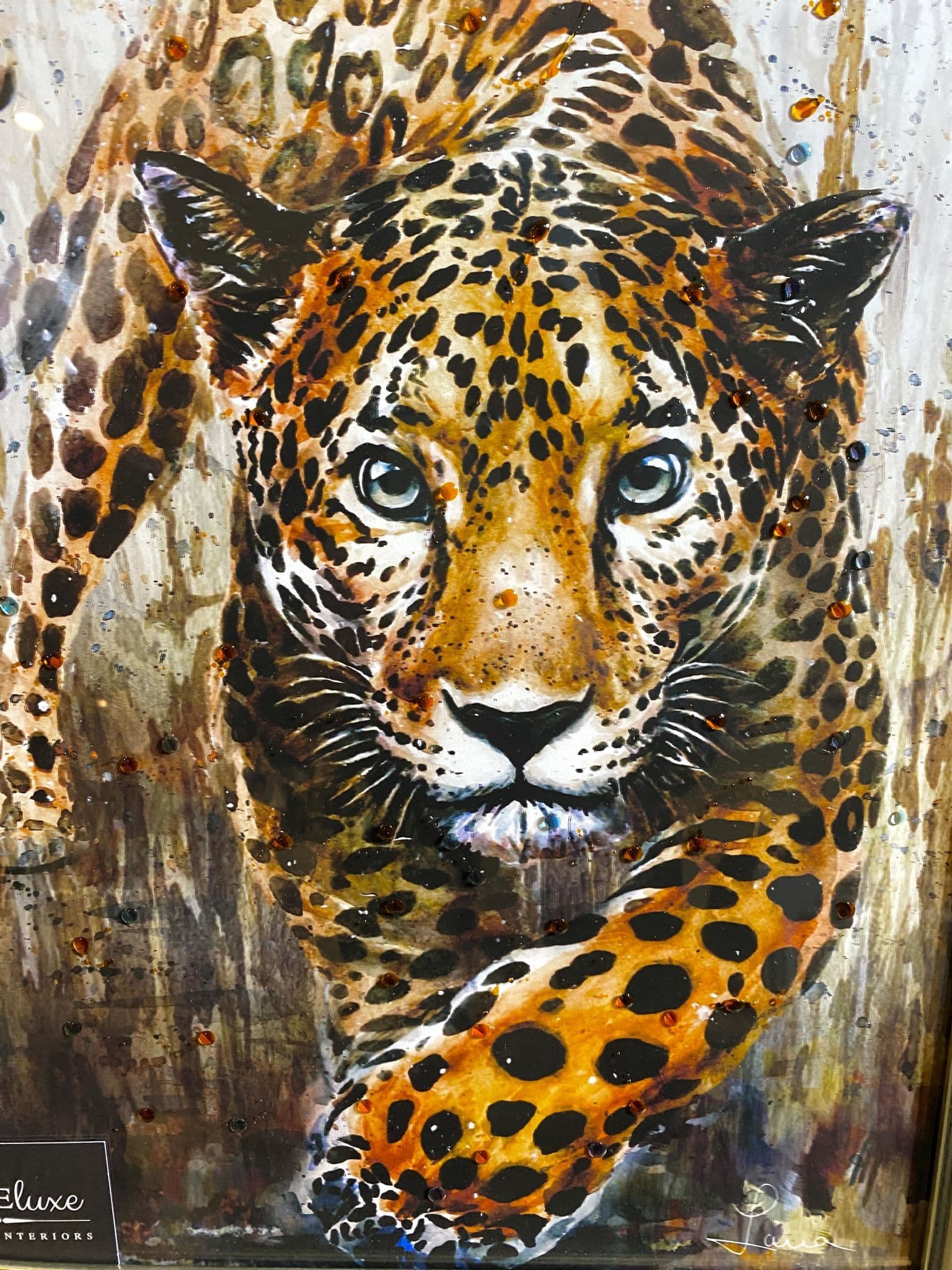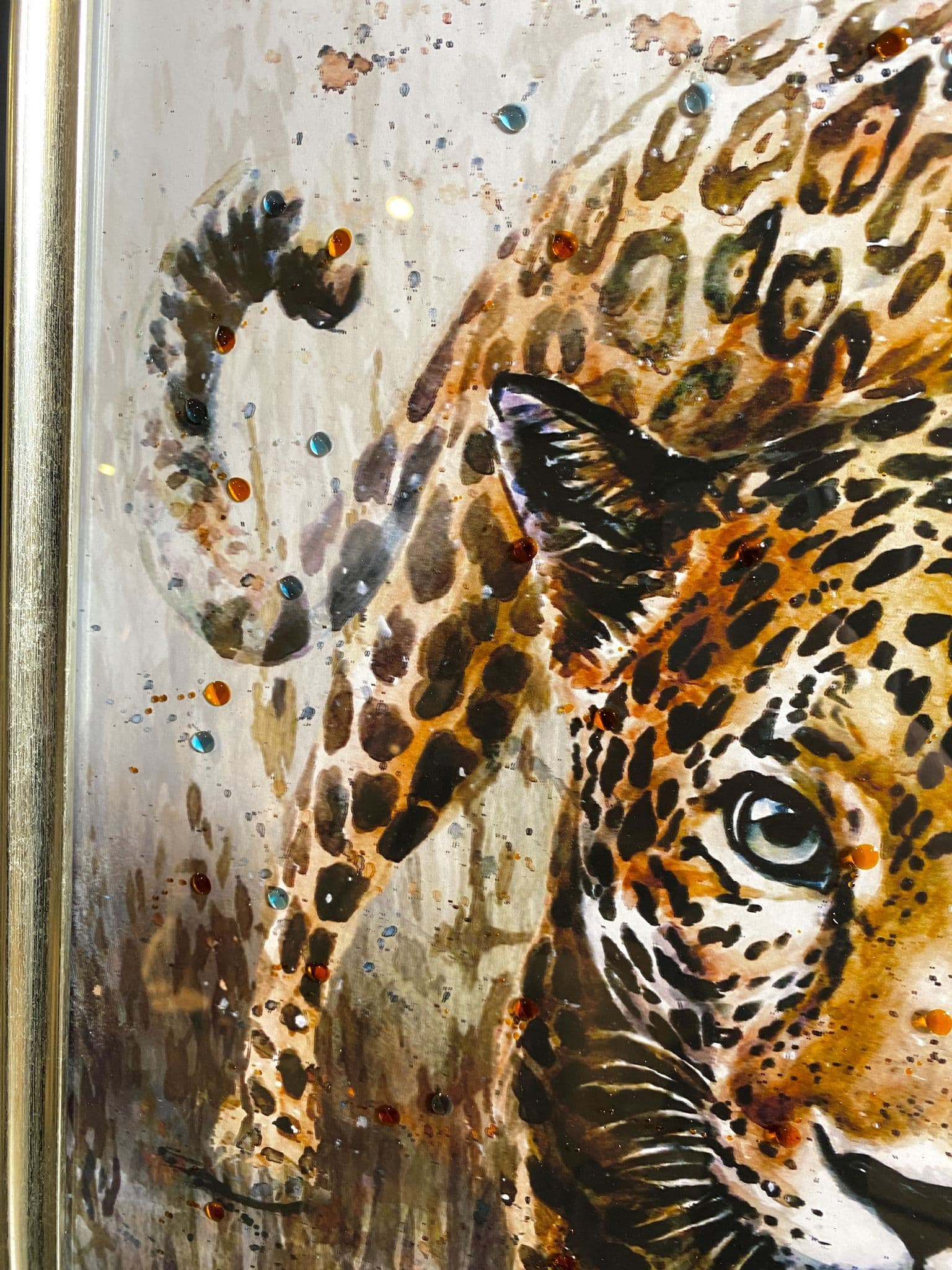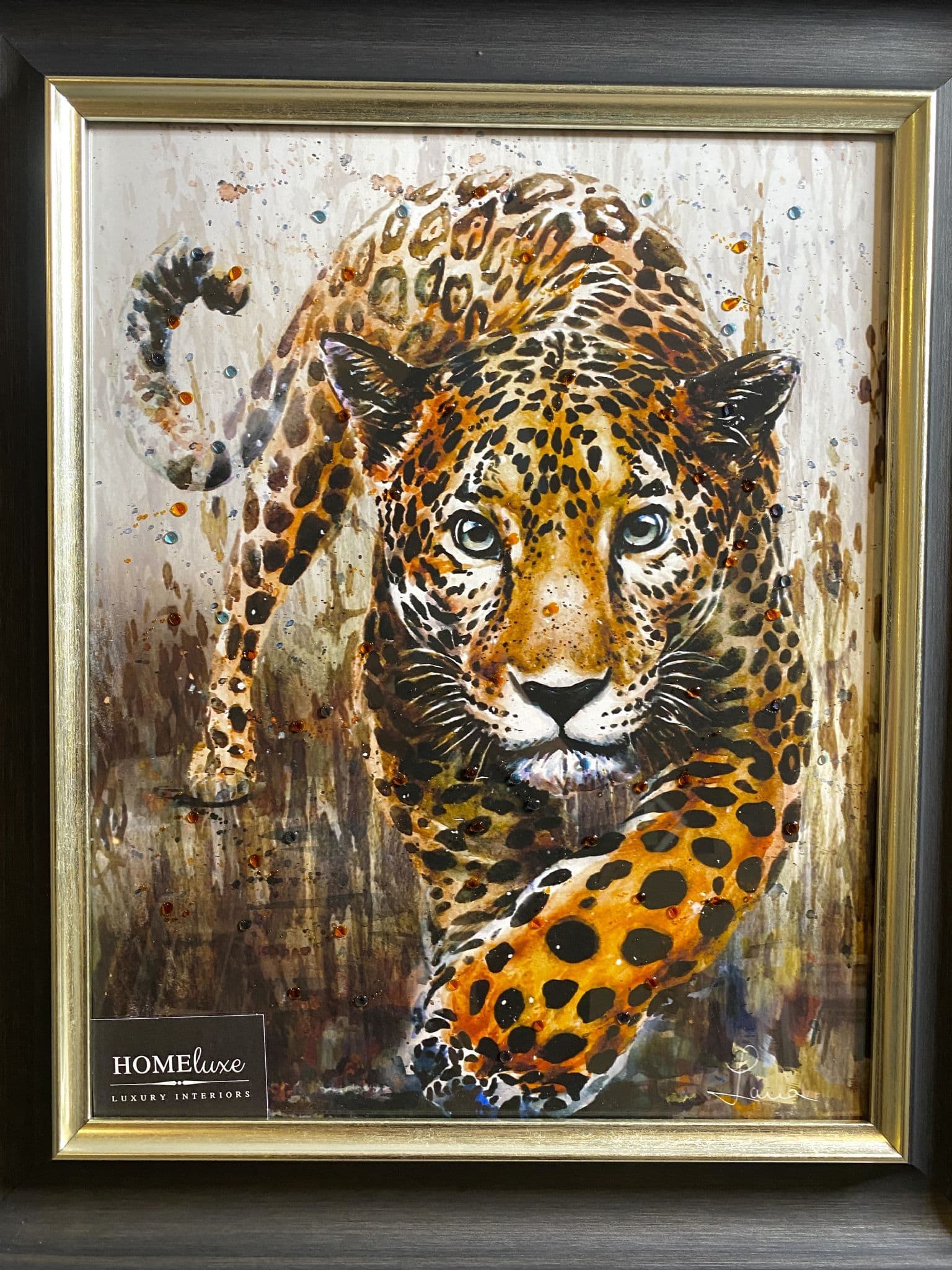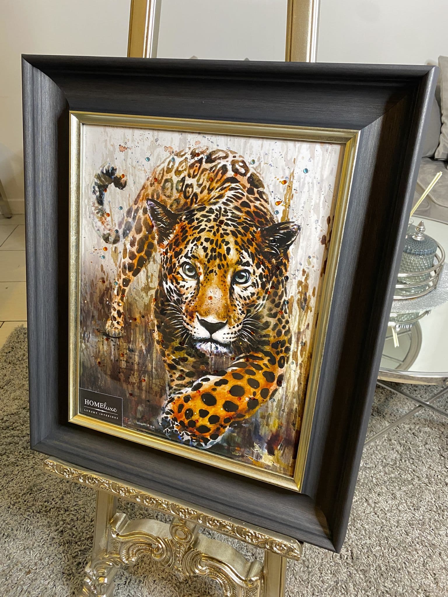 This picture features 'Waterpaint Leopard', exhibiting a rich design with liquid details around the picture, creating a smart look for your home. Finished with a chic black frame.