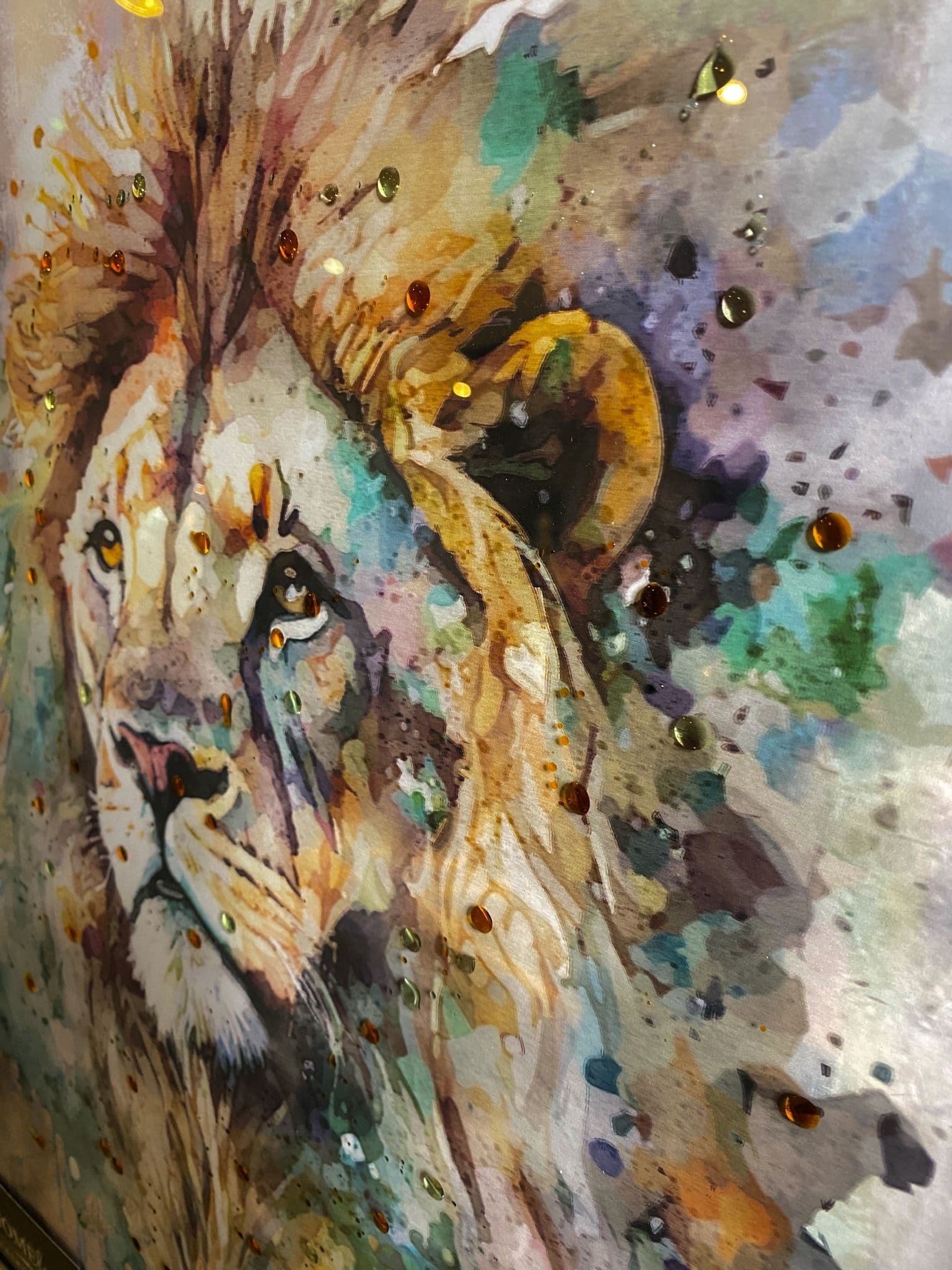 This picture features 'Waterpaint Lion', exhibiting a rich design with liquid details around the picture, creating a smart look for your home. Finished with a chic black frame.