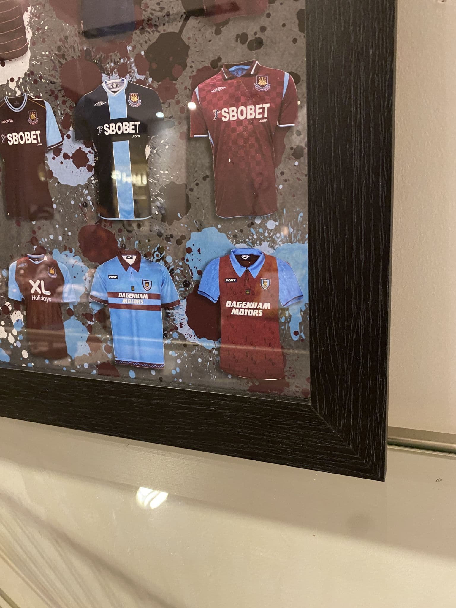 This picture features 'West Ham Football Strip Collection', exhibiting a rich design with liquid details around the picture, creating a smart look for your home. Finished with a black frame.