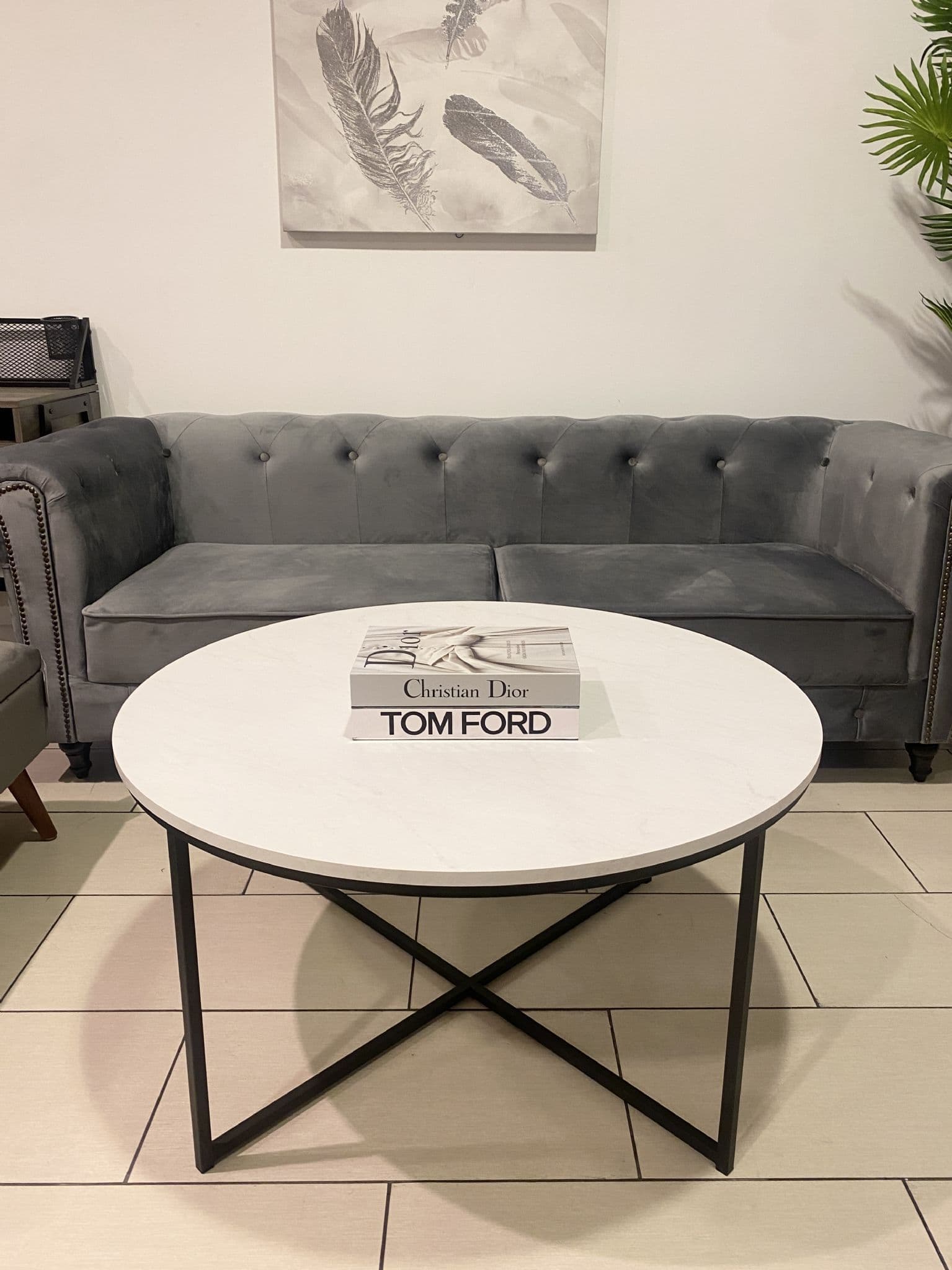 Luxrurios and modern style coffee table. This White Faux Marble Round Coffee Table highlights a touch of elegance for any modern interior. Constructed of a durable, black metal base with a high grade, MDF white faux marble finish, making this piece a statement for your living area.