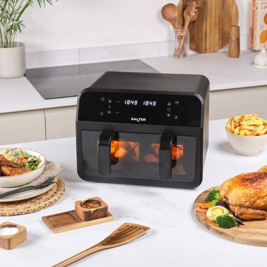 Transform your family mealtimes with the Salter Dual View Air Fryer, featuring a versatile 7-litre capacity that adapts to your needs. This innovative appliance comes with a removable divider, allowing you to switch instantly between a single extra-large 7L cooking zone—perfect for roasting a whole chicken—or two independent 3.5L zones to cook mains and sides simultaneously.