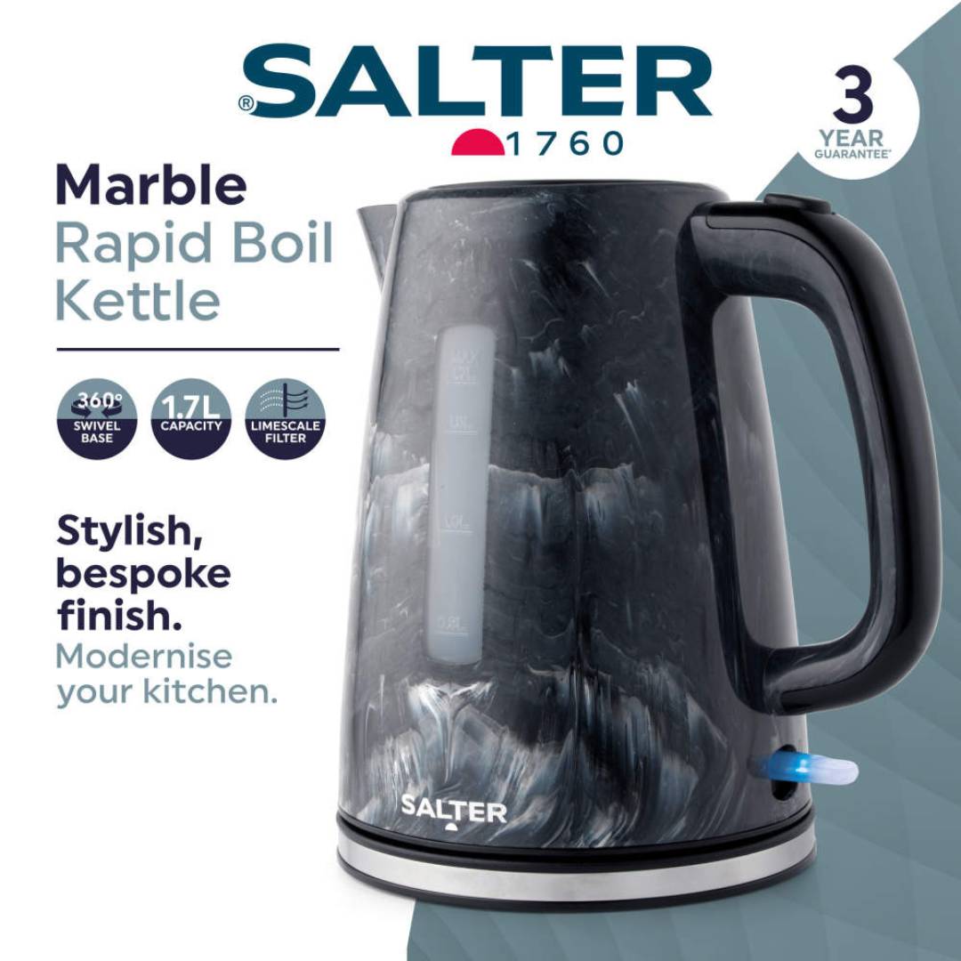 Add a touch of contemporary elegance to your countertop with the Salter Marble Effect Kettle. Finished in a stylish black with a unique marble pattern—meaning no two kettles are exactly alike—this appliance is designed to stand out. It doesn't just look good; with a powerful 3000W rapid boil element, it reduces waiting time so you can enjoy your tea or coffee faster.