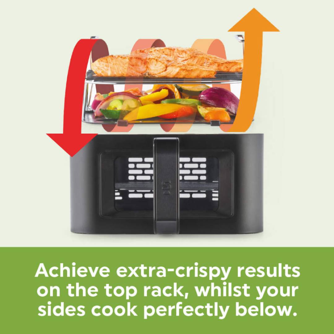 9L Dual Capacity: Features two 4.5L baskets to cook main meals and sides simultaneously.