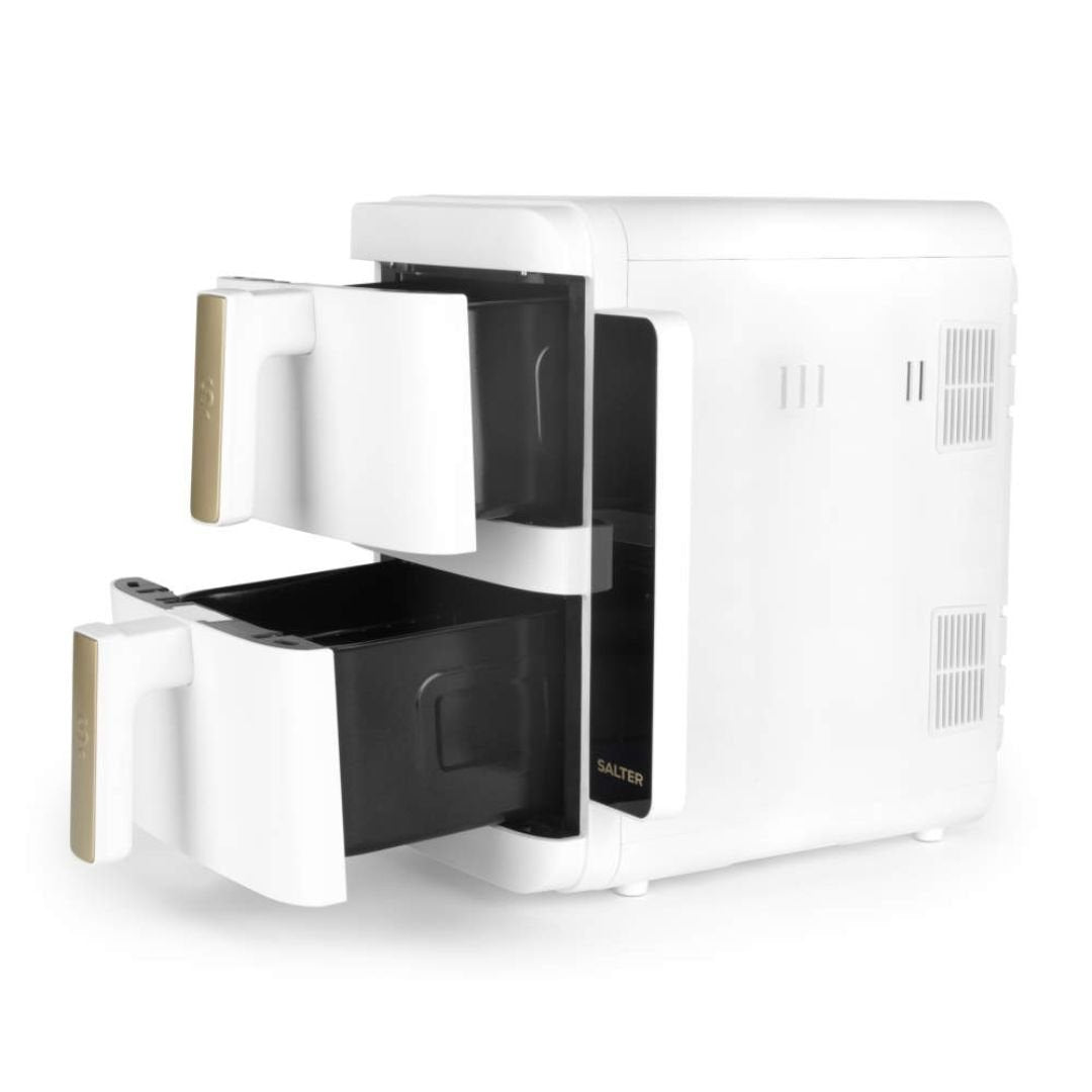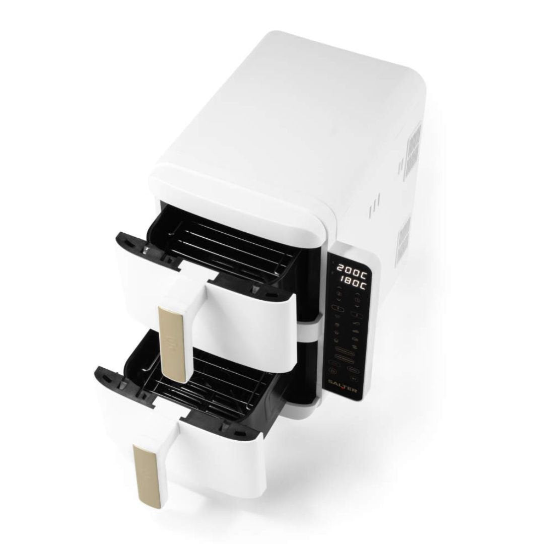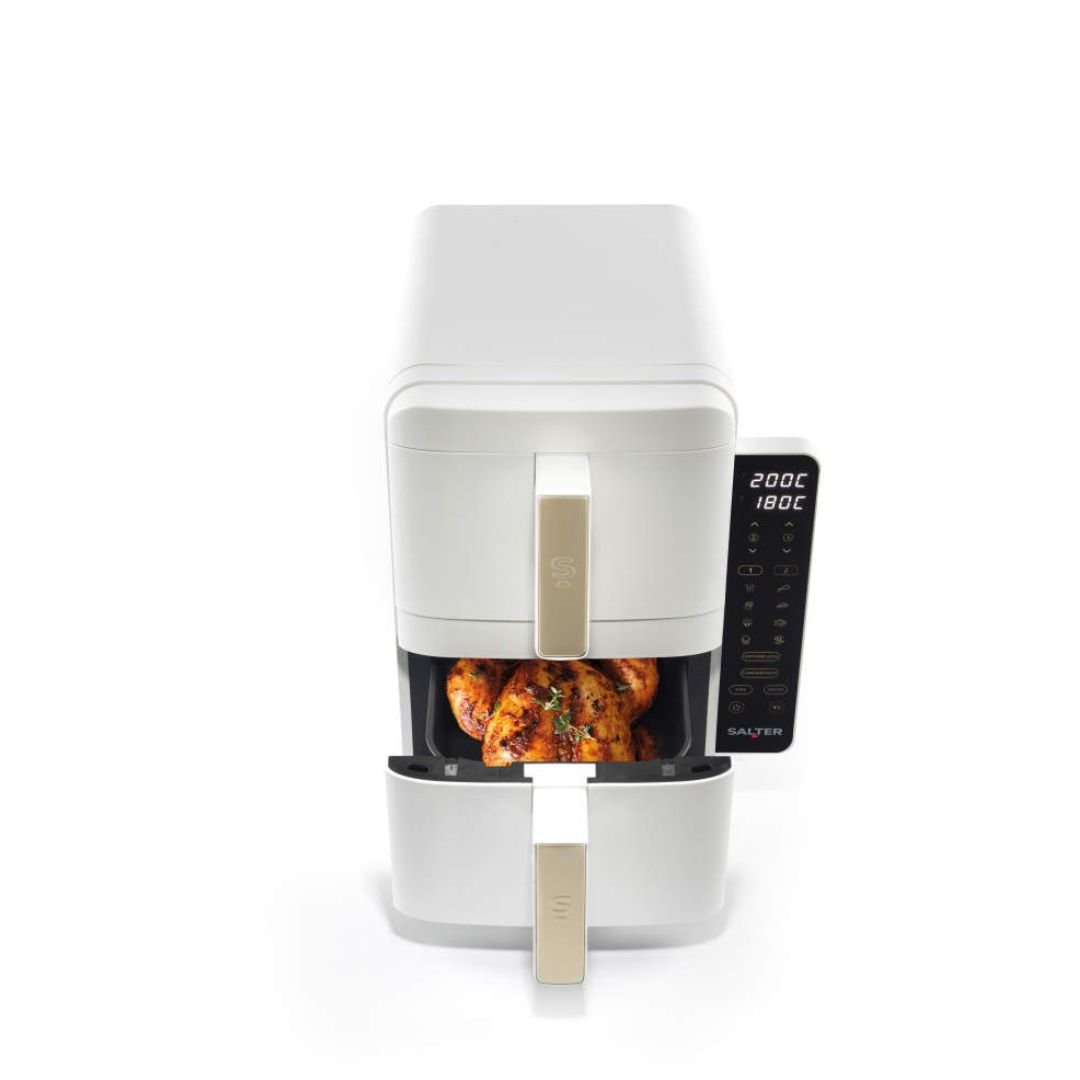Revolutionize your meal prep with the Salter VertiCook Ultra Air Fryer, featuring a unique vertical stackable design that saves precious countertop space. Finished in a sleek White body with elegant Gold handles, this appliance is 40% slimmer than standard models, fitting neatly under kitchen cabinets (approx. 39cm clearance).