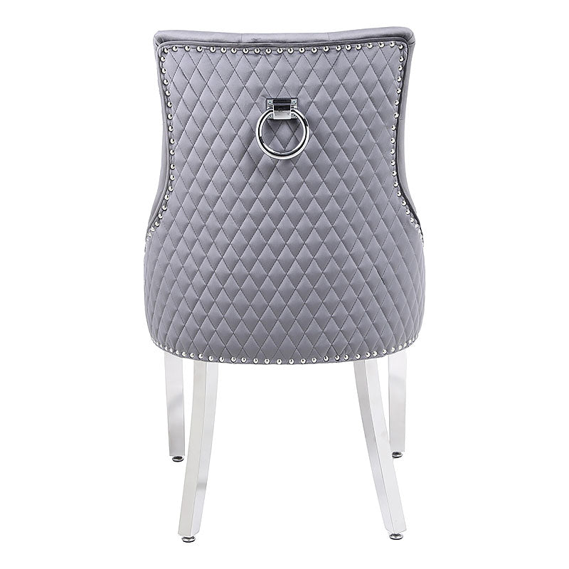 Add refined elegance to your dining space with the Set of 2 Minister Grey Velvet & Chrome Dining Chairs with Round Ring Knocker, exclusively from Home Luxe Interior. Designed with a traditional silhouette and modern materials, these chairs offer both comfort and sophistication for any stylish interior.