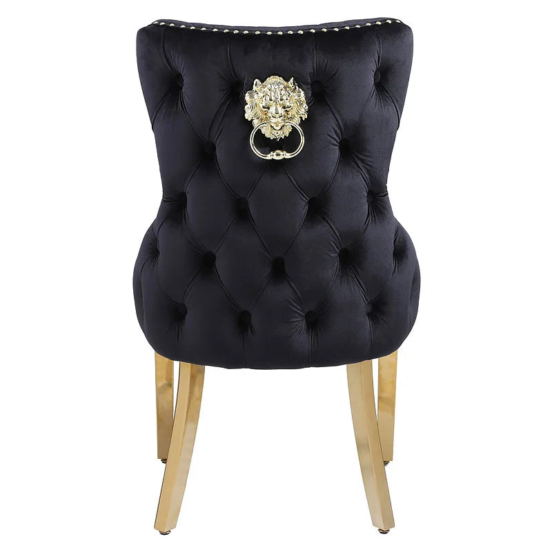 Bring opulence and sophistication into your space with the Set of 2 Victoria Black Velvet & Gold Dining Chairs with Lion Ring Knocker, exclusively from Home Luxe Interior. These chairs are a perfect blend of regal style and luxurious comfort, ideal for high-end dining rooms, vanity corners, or statement seating.