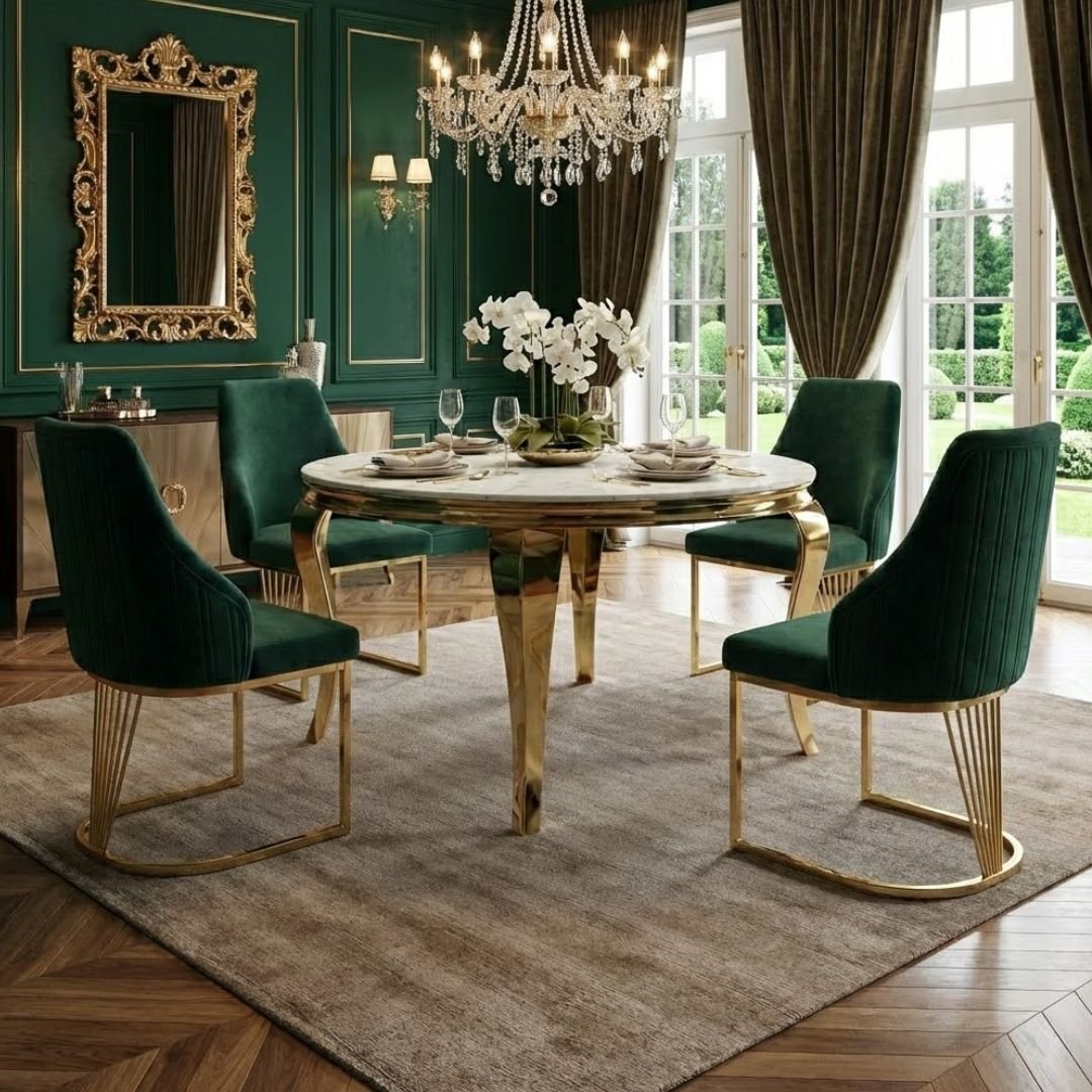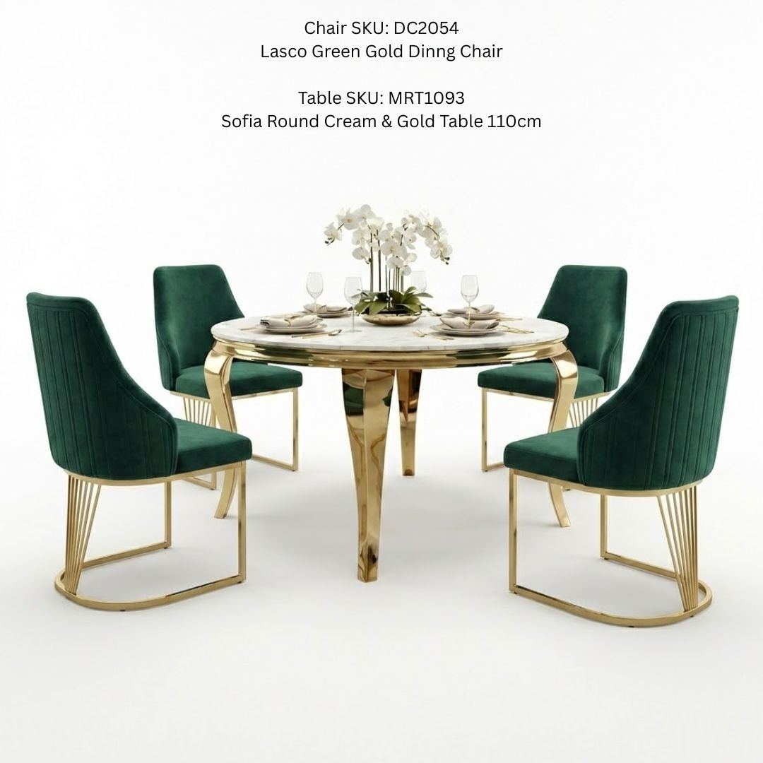 Transform your dining room into a sanctuary of modern luxury with the Sofia 150cm Cream & Gold Marble Dining Table and Lasco Green Gold Dining Chairs. This stunning 5-piece set is the ultimate statement in boutique-hotel glamour, combining high-end natural textures with contemporary gold accents.