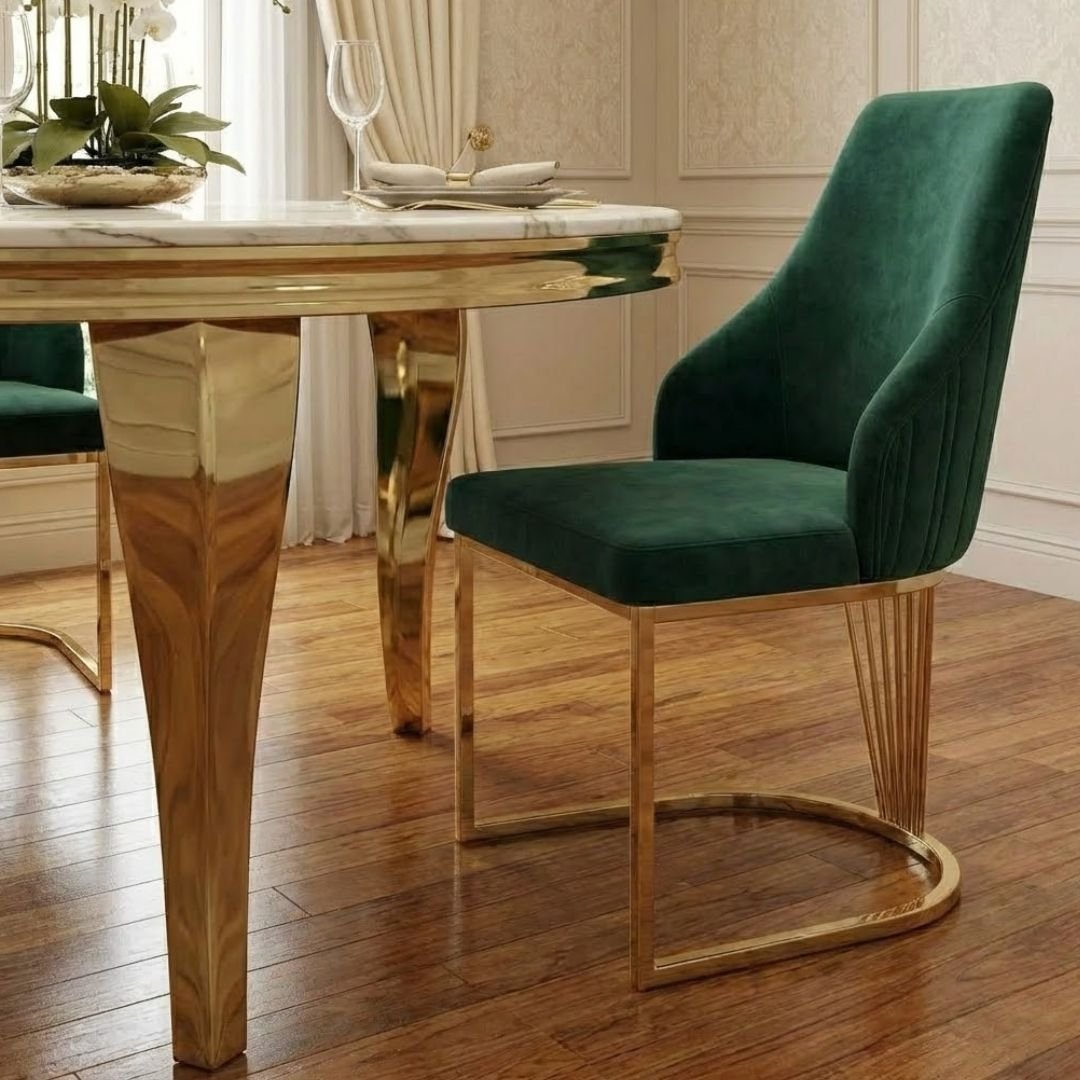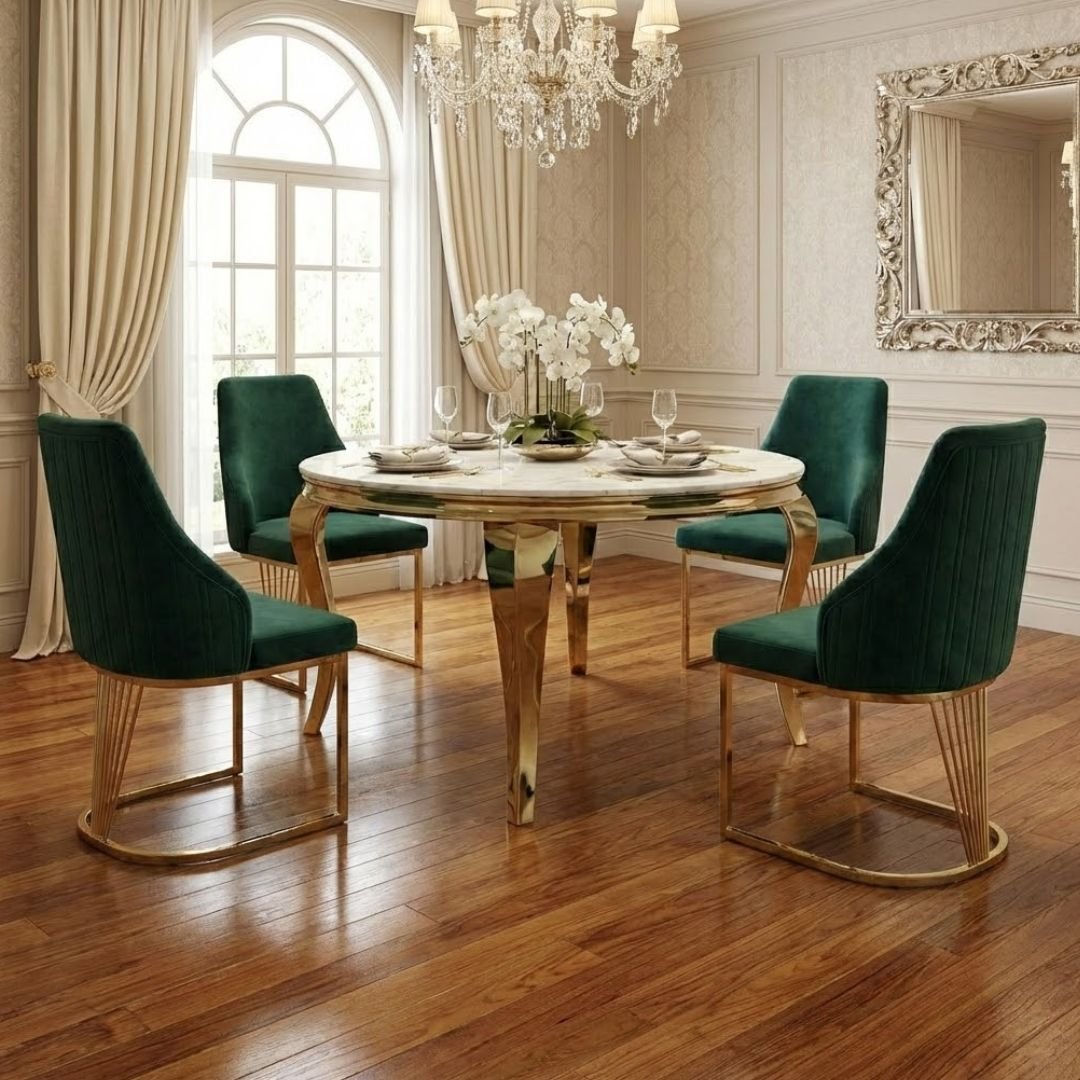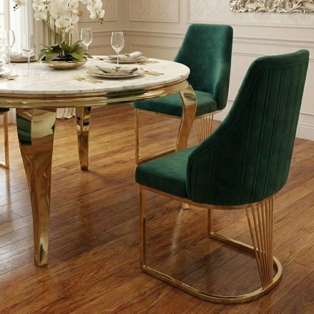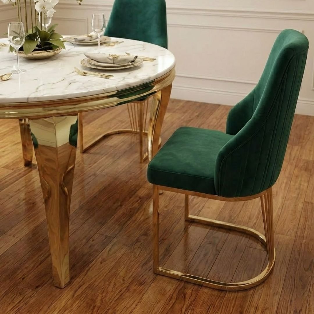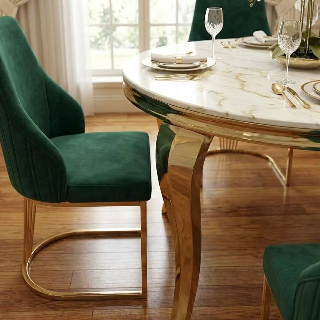 This set includes four Lasco Dining Chairs, upholstered in a rich green velvet-style fabric that provides a striking contrast to the cream marble. Each chair features a unique gold-toned, fan-style leg design that mirrors the table's elegance. The ergonomic shape and plush upholstery ensure maximum comfort for long, leisurely dinner parties.